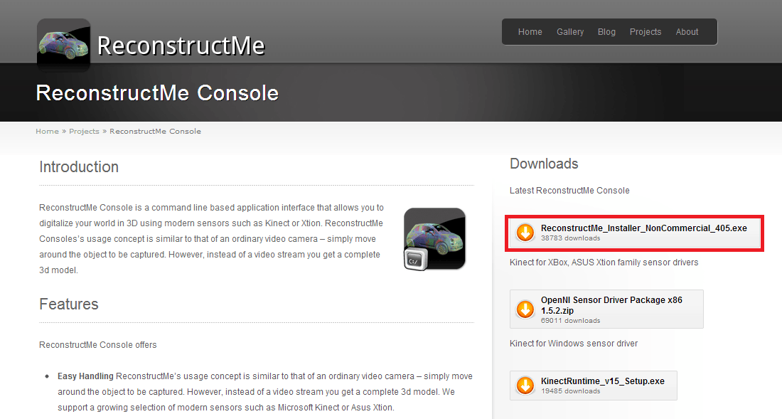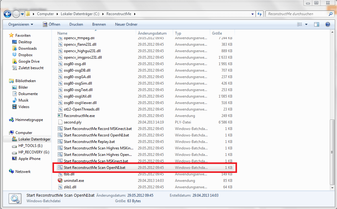 Unter C:ReconstructMe (Standard-Pfad) befinden sich haufenweise Dateien. Um die Software zu starten wählen wir das Batch-File („Start ReconstructMe Scan OpenNI.bat“) mit Doppelklick an. Dieses Batch-File braucht man für den Kinect-Sensor von Xbox.