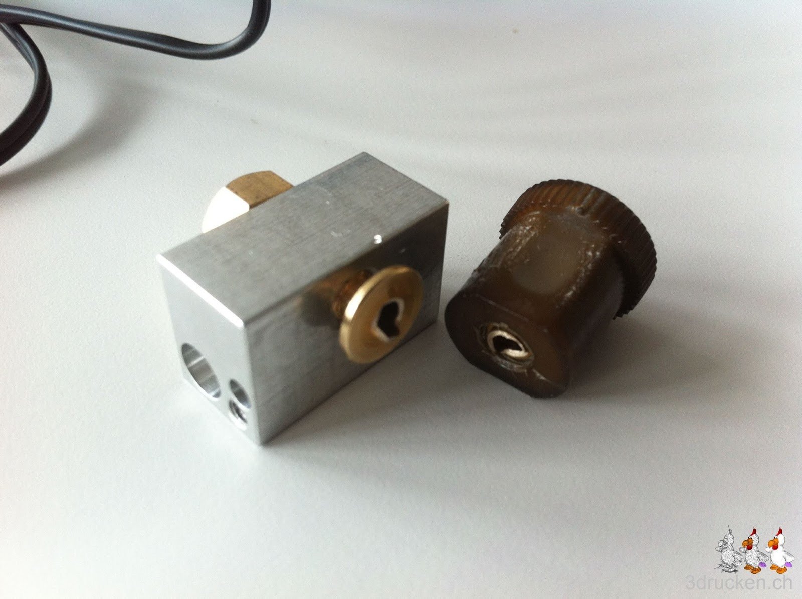 Glücklicherweise konnte der Rest der Schraube aus dem Aluminium-Block entfernt werden. Die fehlenden Teile (Isolator und Schraube) nahmen wir vorläufig aus dem zweiten Drucker-Kit.