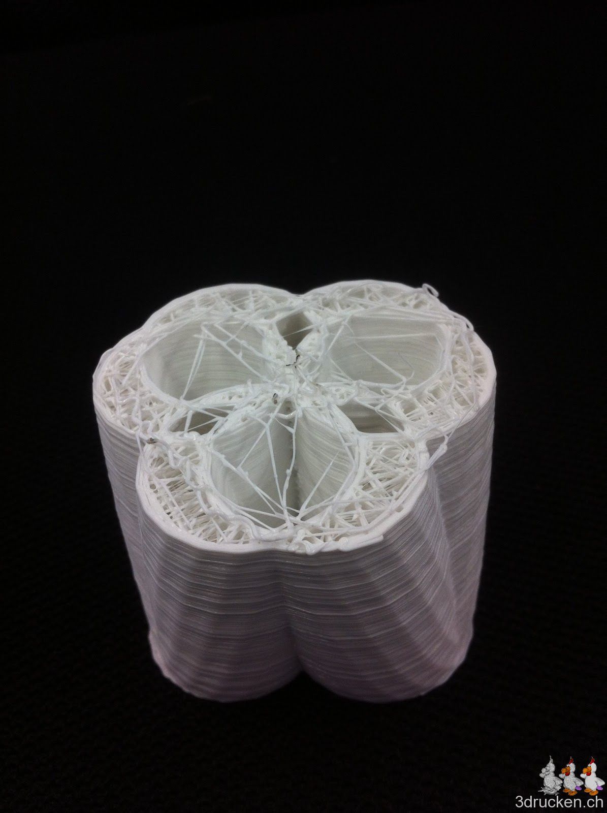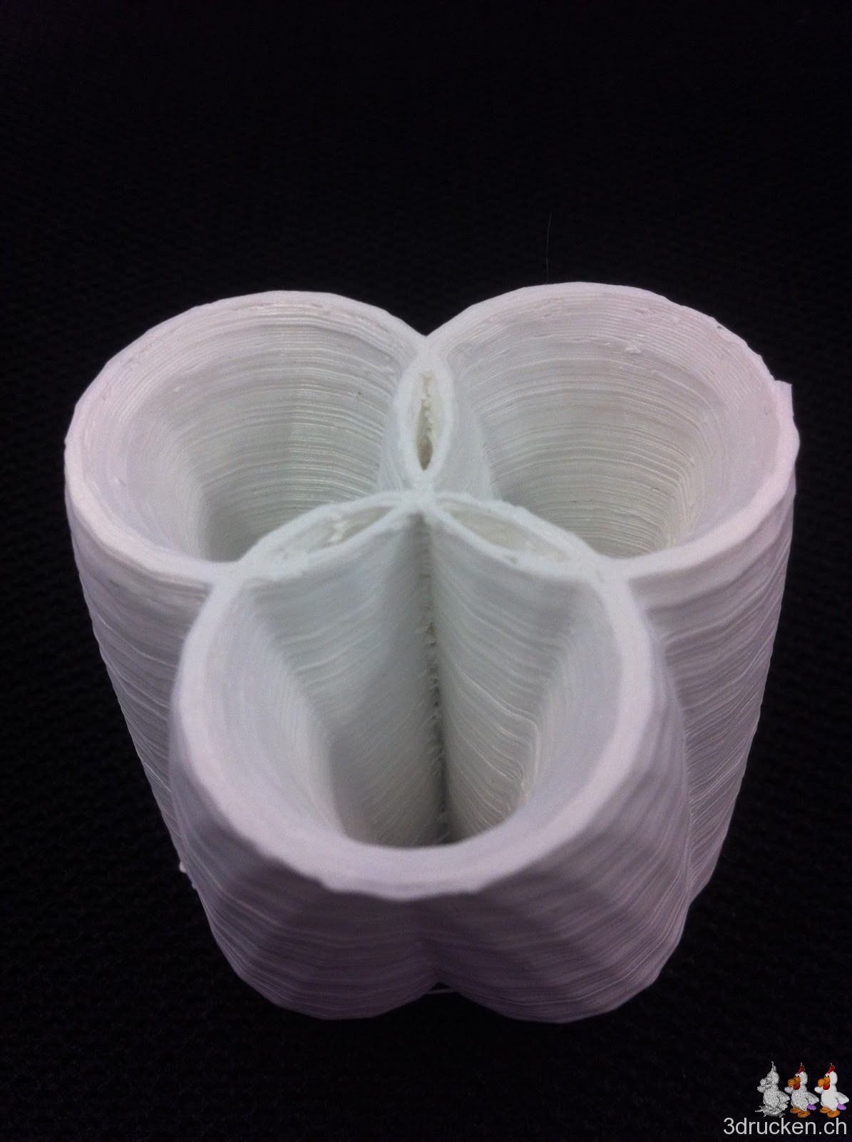 Heute morgen versuchten wir ein Kunstobjekt zu drucken. Mit 0.2 mm Schichtdicke und 210° C baute der Drucker den Gegenstand Schritt für Schritt auf. Wir freuten uns schon auf den nächsten gelungenen Druck. Doch als das Objekt sich dem Ende zuneigte passierte es… Eine kleine Berührung genügte und der Gegenstand war soweit verschoben, dass der Druck abgebrochen werden musste. Was war das Problem? Die Haftfläche (siehe Bild2) vom Objekt war durch die schmalen Ringe sehr klein…zu klein.