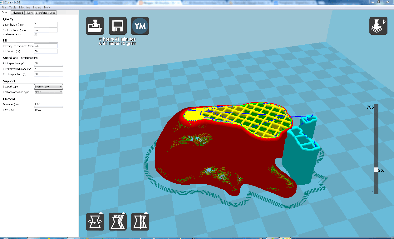 Heute haben wir ihn an seinen Platz im Keller verschoben, der Drucker ist im Leerlauf lauter, dies bestimmt wegen den stärkeren Lüfter. Nun drucken wir auf dem Ultimaker 2 und Sharebot Next Generation die selben Objekte, mit möglichst identischen Einstellungen in Cura, um die Qualität vergleichen zu können. Ja, für den Sharebot NG kann auch Cura verwendet werden, was wir sehr praktisch finden. Dafür legen wir in Cura einen neuen Drucker vom Typ RepRap an, und geben die Dimensionen 210x200x200mm für den druckbaren Bereich an. Am Sharebot kommt PLA von Verbatim bei 210°C zum Einsatz, am Ultimaker 2 PLA von Swiss (German) RepRap bei 220°C. Den Tisch am Sharebot heizen wir auf 70°C, den am Ultimaker 2 auf 75°C.