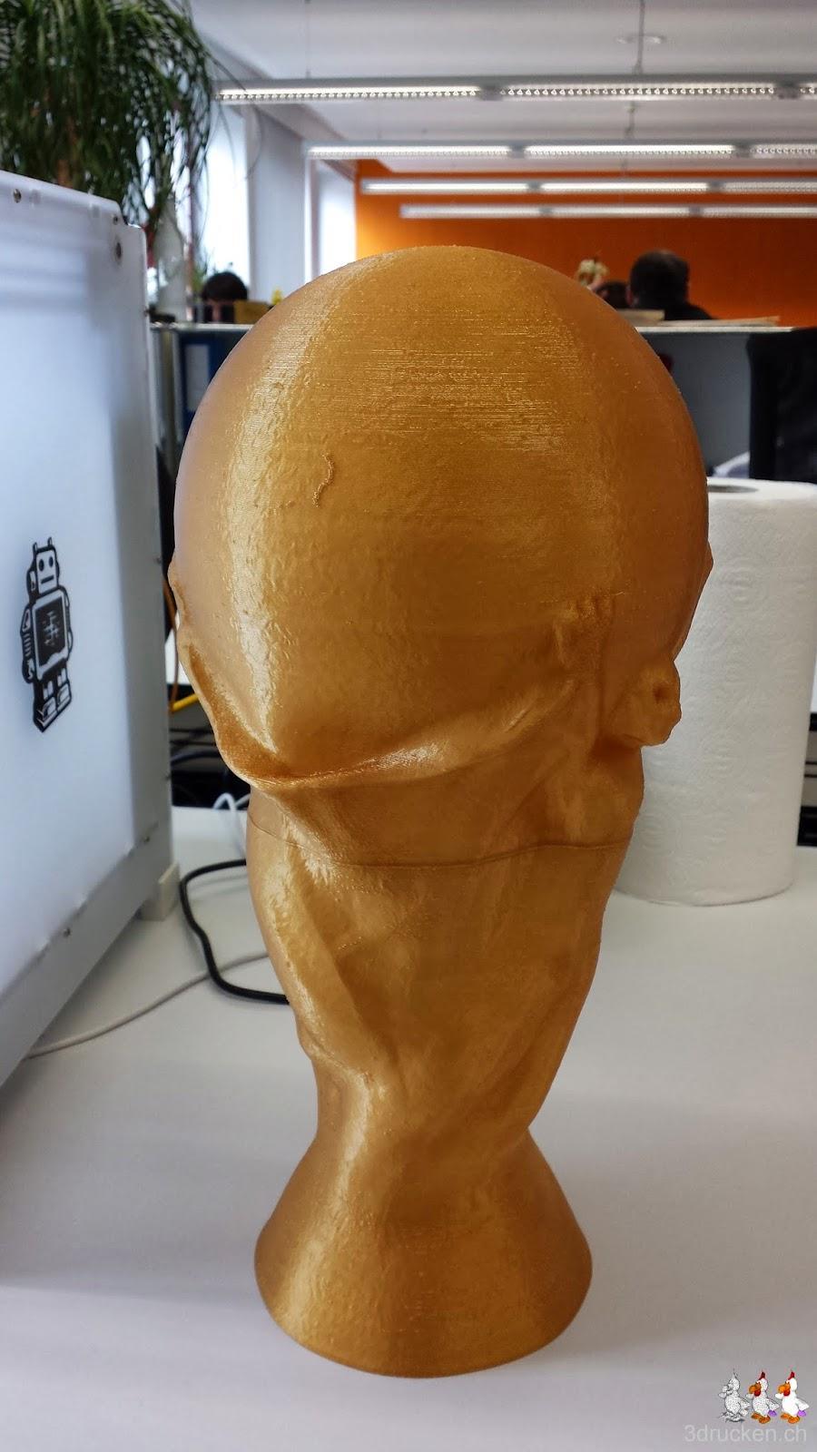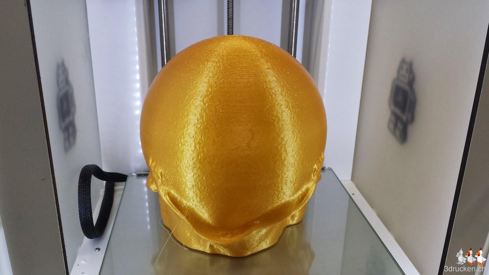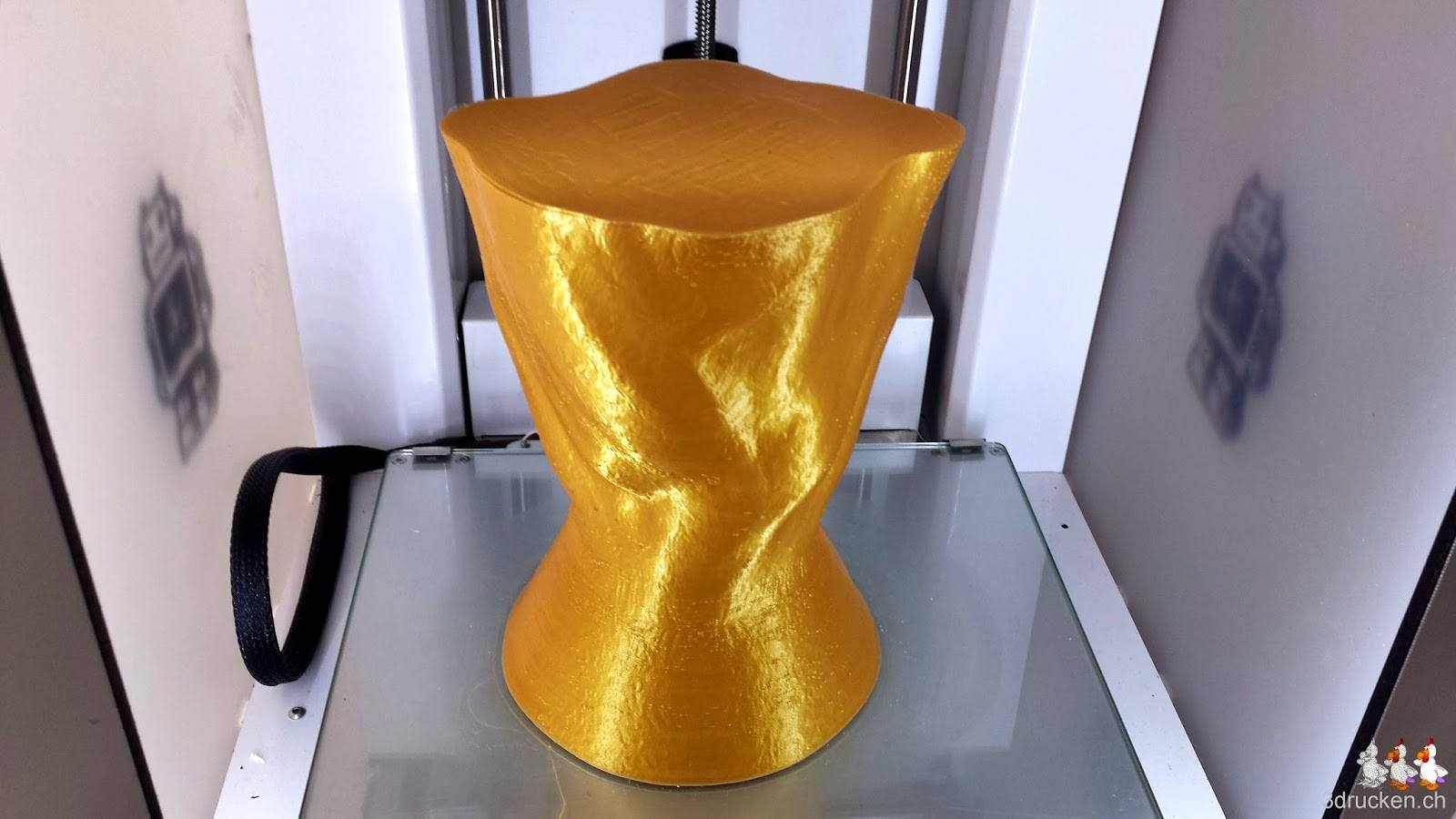 Als Druckeinstellungen wählen wir die selben wie beim Gartenzwerg, die haben sich sehr gut bewährt. Gedruckt wird aus Fabberdashery Gold PLA, um dem Original so nahe wie möglich zu kommen. Das Filament haben wir zuerst mit Hilfe unseres Hauswarts auf eine grosse leere Rolle säuberlich aufgerollt.