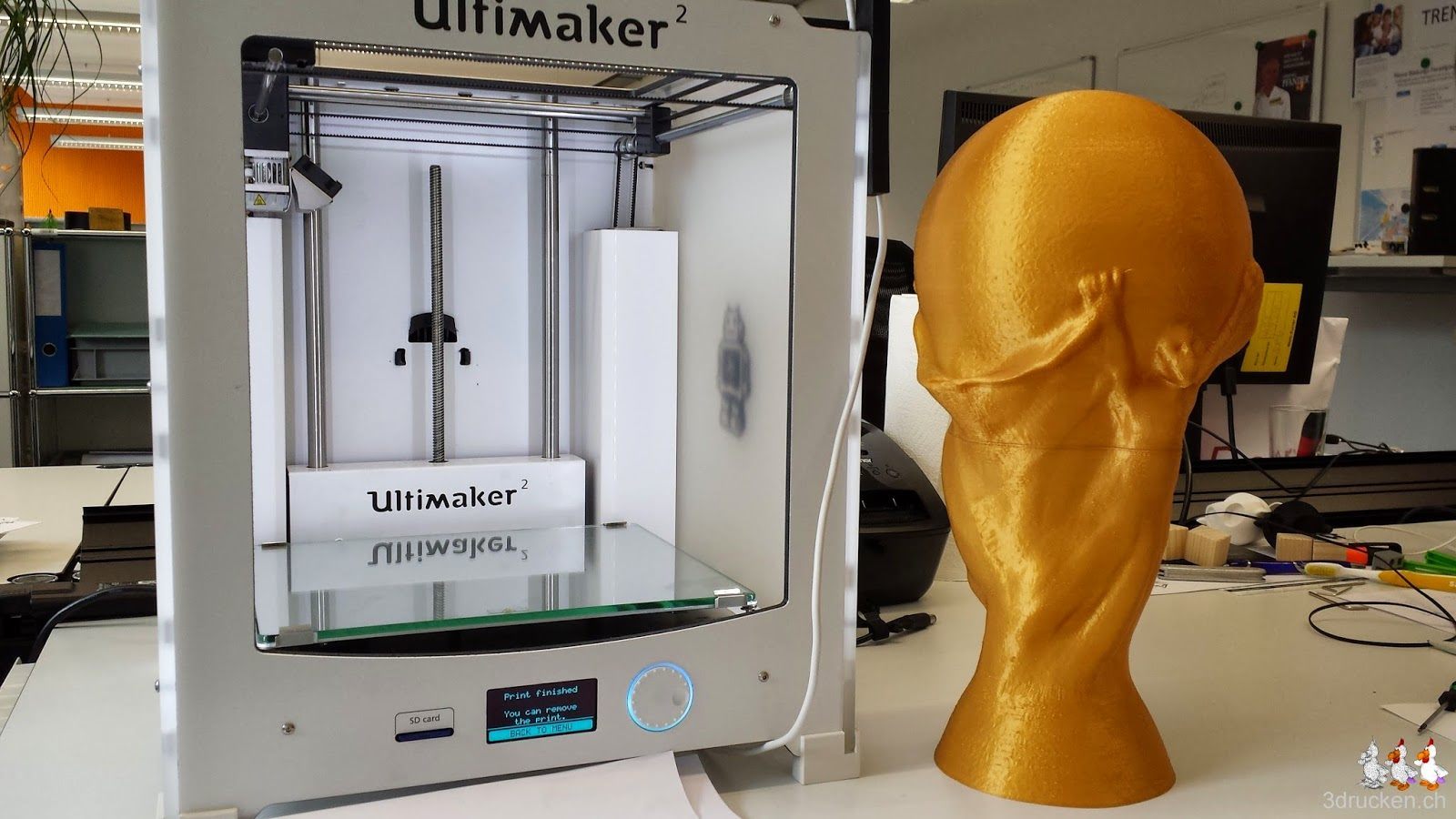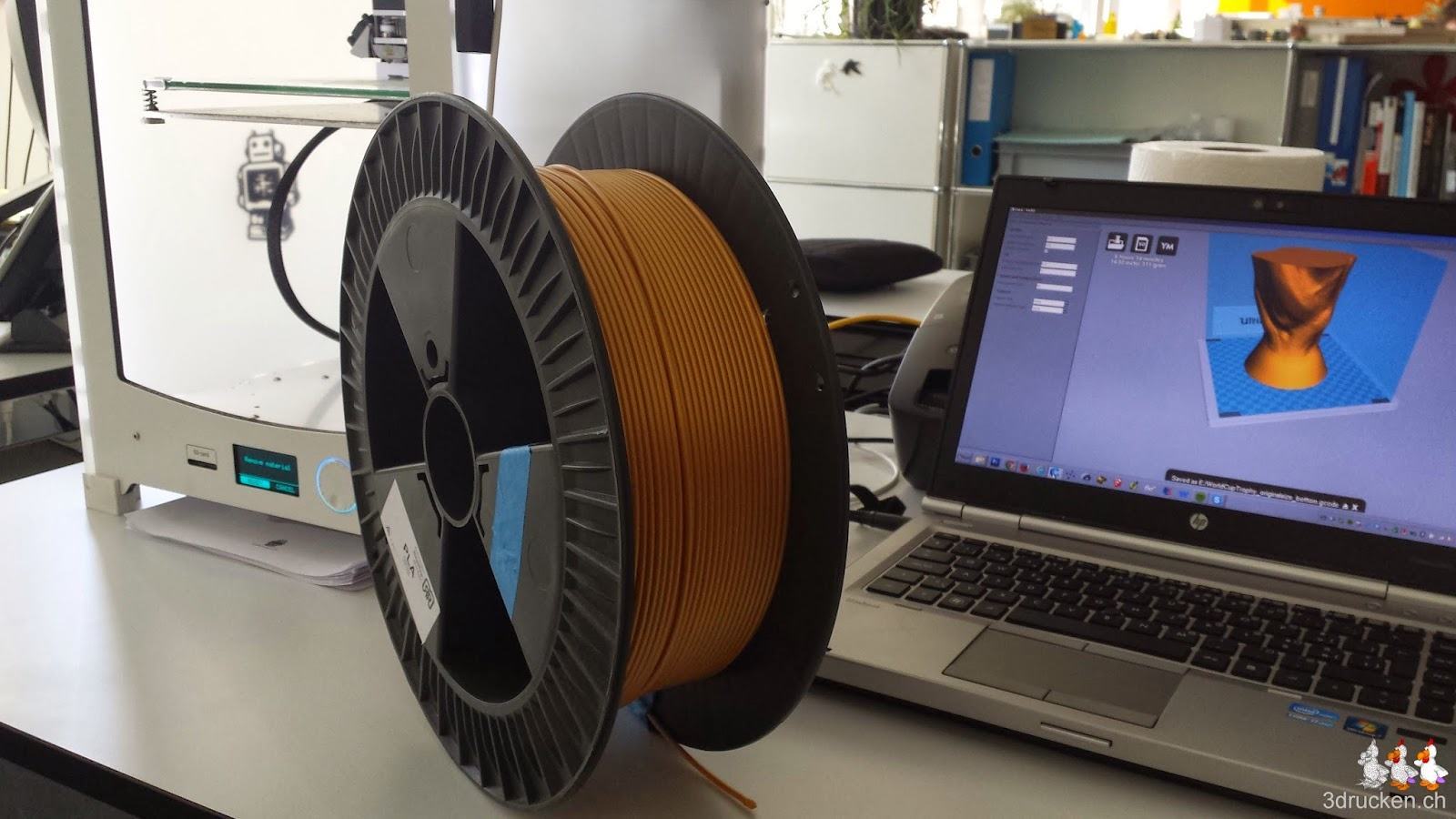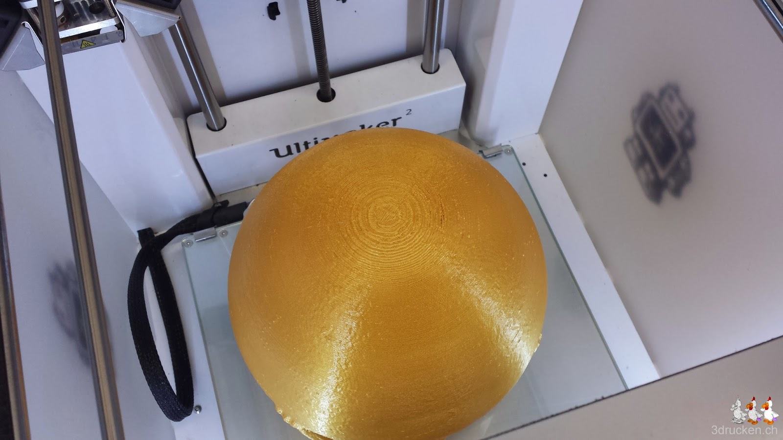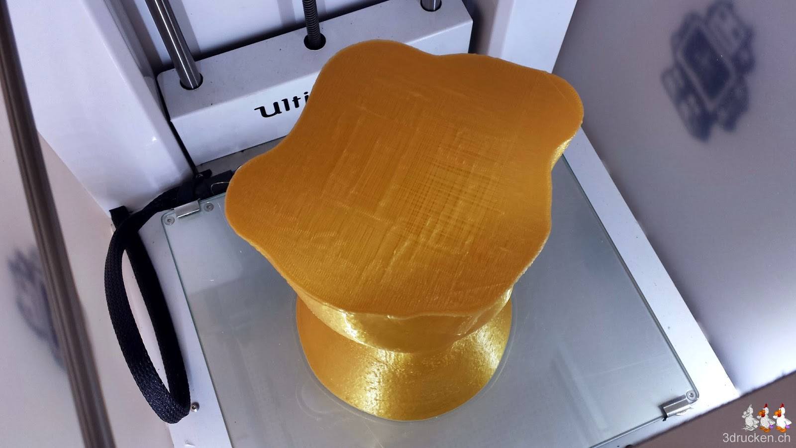 Als Druckeinstellungen wählen wir die selben wie beim Gartenzwerg, die haben sich sehr gut bewährt. Gedruckt wird aus Fabberdashery Gold PLA, um dem Original so nahe wie möglich zu kommen. Das Filament haben wir zuerst mit Hilfe unseres Hauswarts auf eine grosse leere Rolle säuberlich aufgerollt.