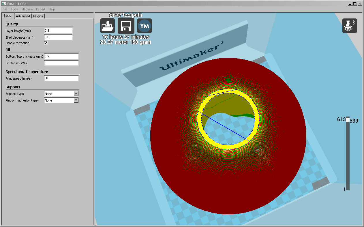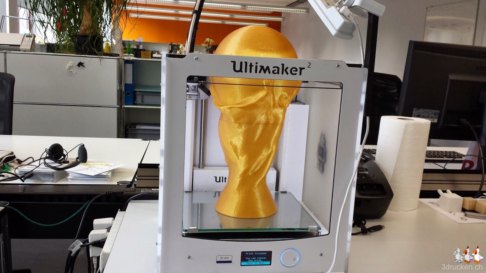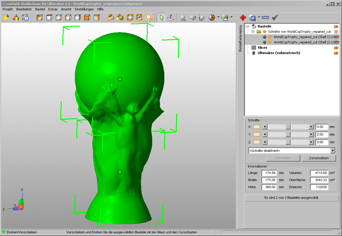 Wir haben für das Erstellen einer 1:1 Kopie des FIFA WM Pokals, das Modell, welches wir bereits schon einmal heruntergeladen und verkleinert ausgedruckt hatten, in netfabb studio in druckbare Einzelteile geschnitten. Diese Einzelteile haben wir danach auf unserem Ultimaker 2 gedruckt und anschliessend zusammen geklebt. Die gesamte Druckzeit betrug nur 9 h 47 min.