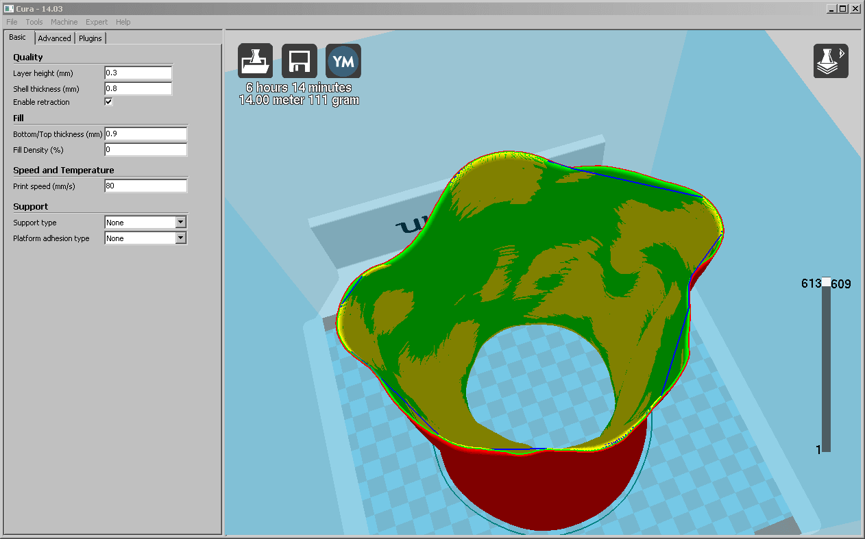 Die Originalgrösse mussten wir in der Wikipedia im Artikel FIFA-WM-Pokal nachschauen: 36.8 cm oder 368 mm. Unser Modell war zu Beginn sehr klein, was darauf hindeutete, dass das STL in Inches abgespeichert wurde. Dies haben wir als erstes in netfabb studio durch das Konvertieren von Inch in mm korrigiert. Nun war das Modell 240.46 mm hoch. Also noch den Skalierungsfaktor berechnen, da man in netfabb nur mit Hilfe eines Faktors skalieren kann, und nicht die definitive Grösse angeben kann. Anschliessend drehen wir das Modell noch um 180° um die Y-Achse und erhalten so in Cura das Modell in seiner korrekten Ausrichtung dargestellt. Da sich der Nullpunkt genau in der Mitte des Modells befindet, können wir am einfachsten gleich bei Z=0 schneiden.