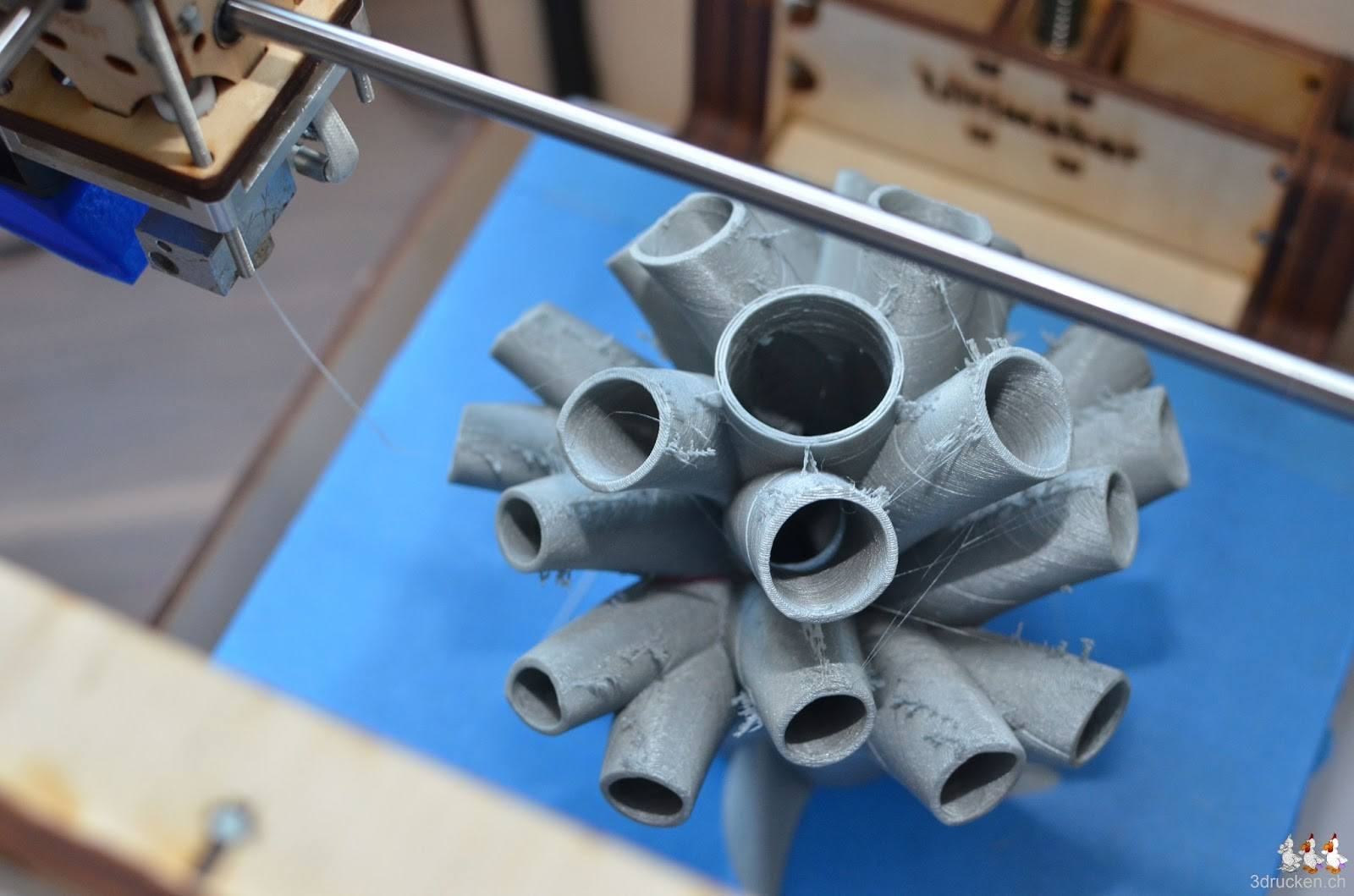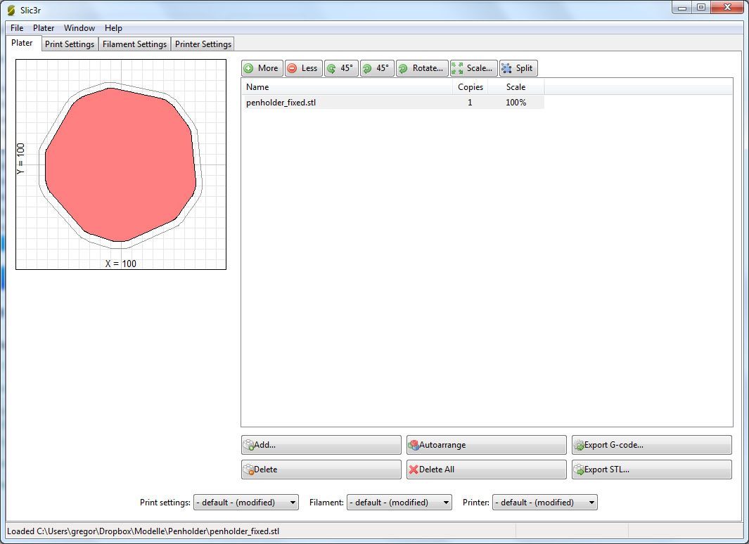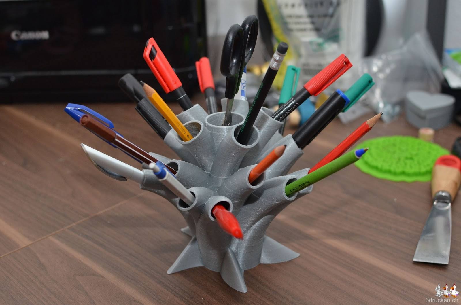 In 18 h 01 min hat der Ultimaker zuhause den Stifthalter aus silbernem Ultimaker-PLA gedruckt. Geslicet haben wir zum ersten Mal mit Slic3r, da diverse Versionen von Cura an der Modellgrösse gescheitert sind. Slic3r benötigte denn auch etwas viel RAM, zum Glück haben wir in unserem Notebook genügend davon.