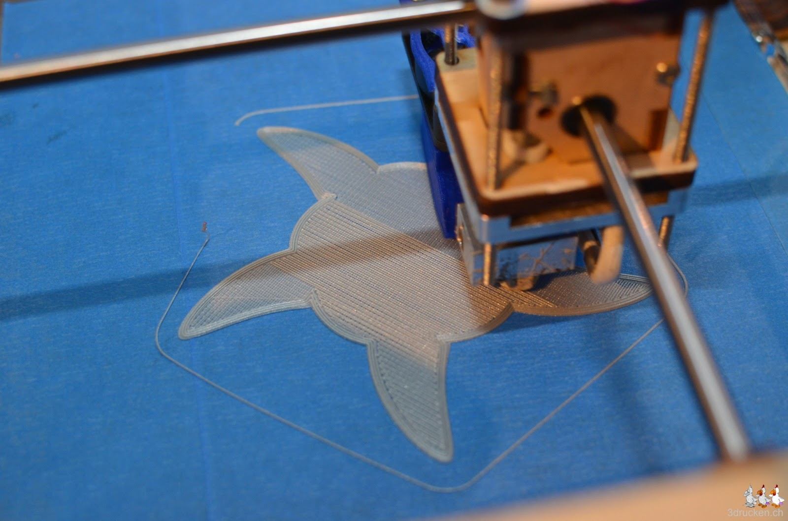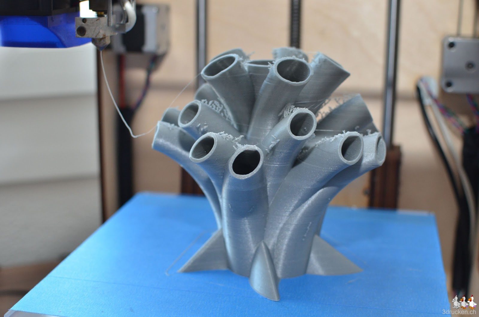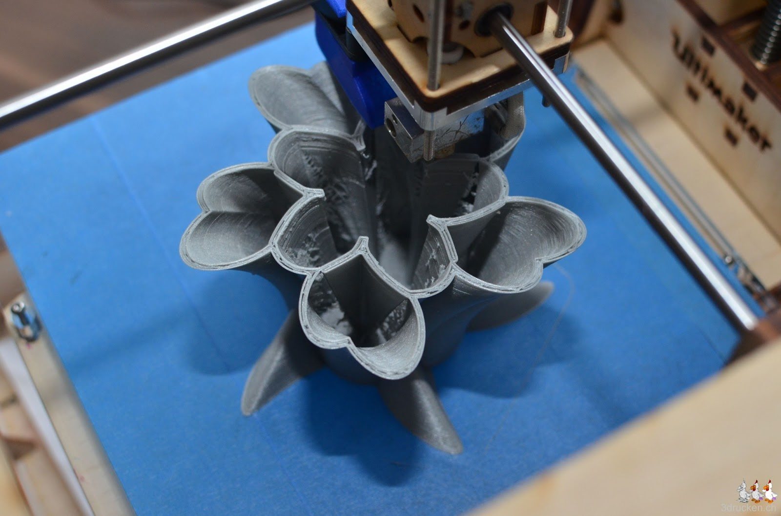 In 18 h 01 min hat der Ultimaker zuhause den Stifthalter aus silbernem Ultimaker-PLA gedruckt. Geslicet haben wir zum ersten Mal mit Slic3r, da diverse Versionen von Cura an der Modellgrösse gescheitert sind. Slic3r benötigte denn auch etwas viel RAM, zum Glück haben wir in unserem Notebook genügend davon.
