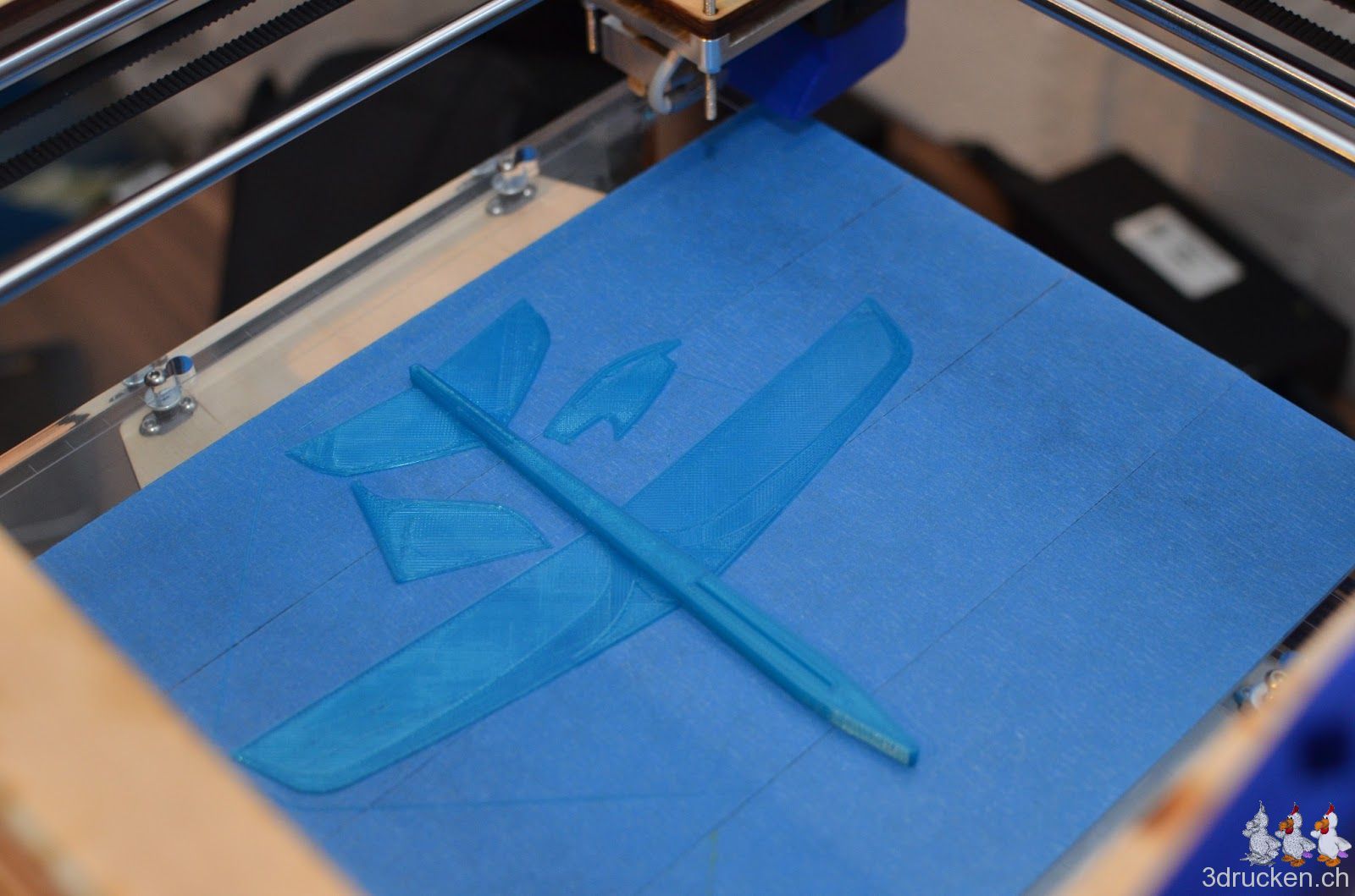 Wir haben den Stratos Glider mit dem Ultimaker in 0.2 mm Schichten aus blauem Fabberworld-PLA gedruckt, damit man ihm am blauen Himmel nicht gut sieht. Das Material lässt sich übrigens sehr gut bei tiefen Temperaturen von 190° C drucken, da es sehr leicht aufgeschmolzen werden kann. Den Glider selber erstellten wir mit 0 % Füllung, den Stab für den Launcher mit 100 % Füllung. Es fehlt nur noch das Gummiband, da müssen wir noch auf die Suche.