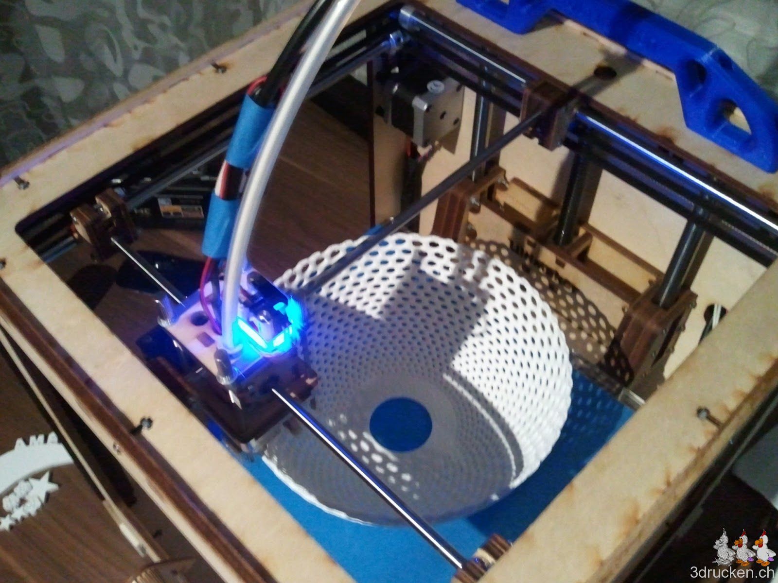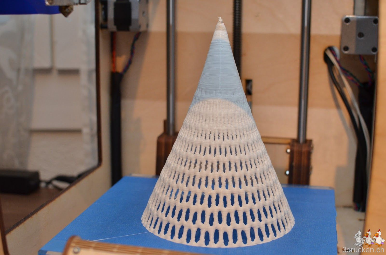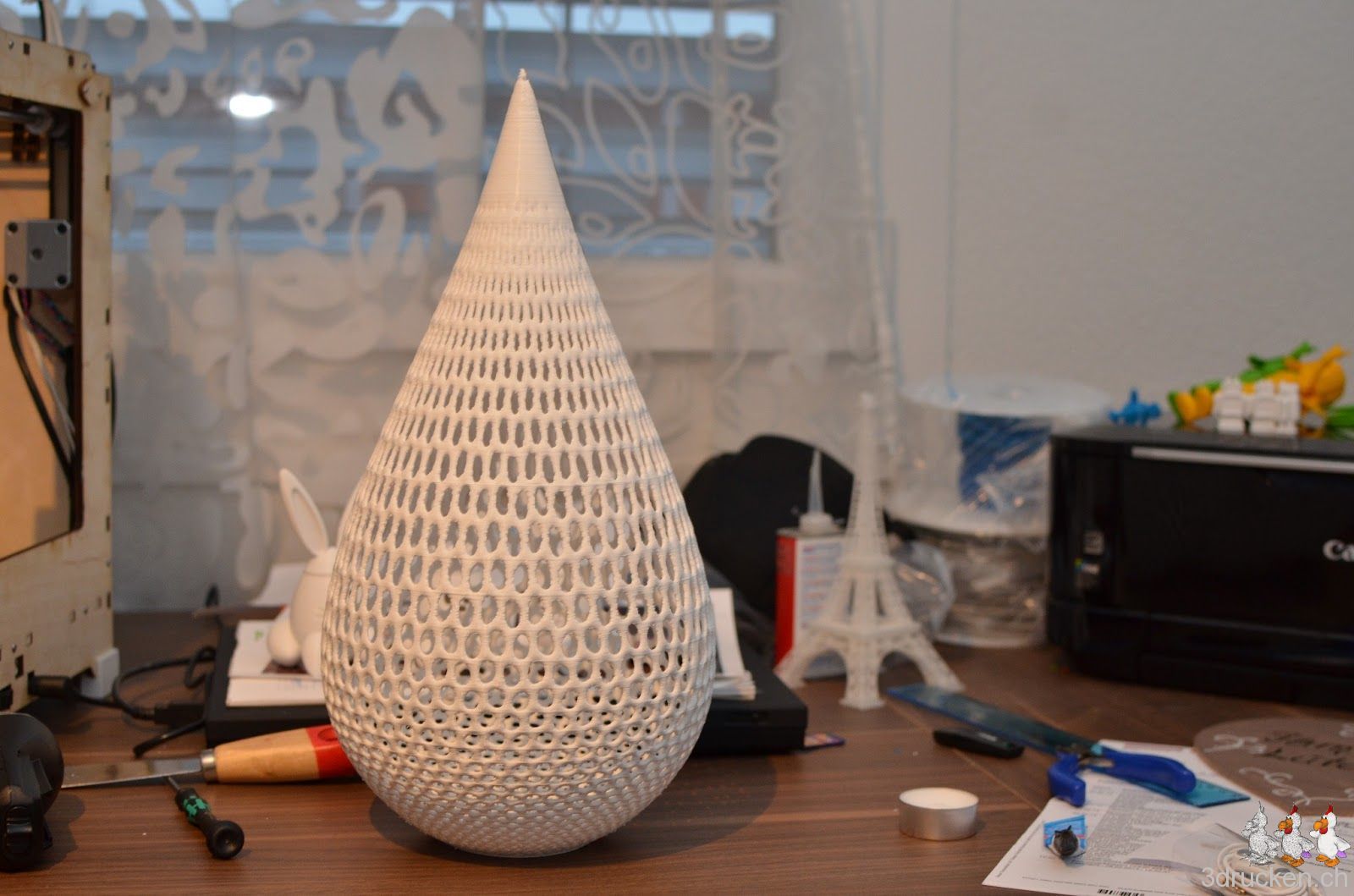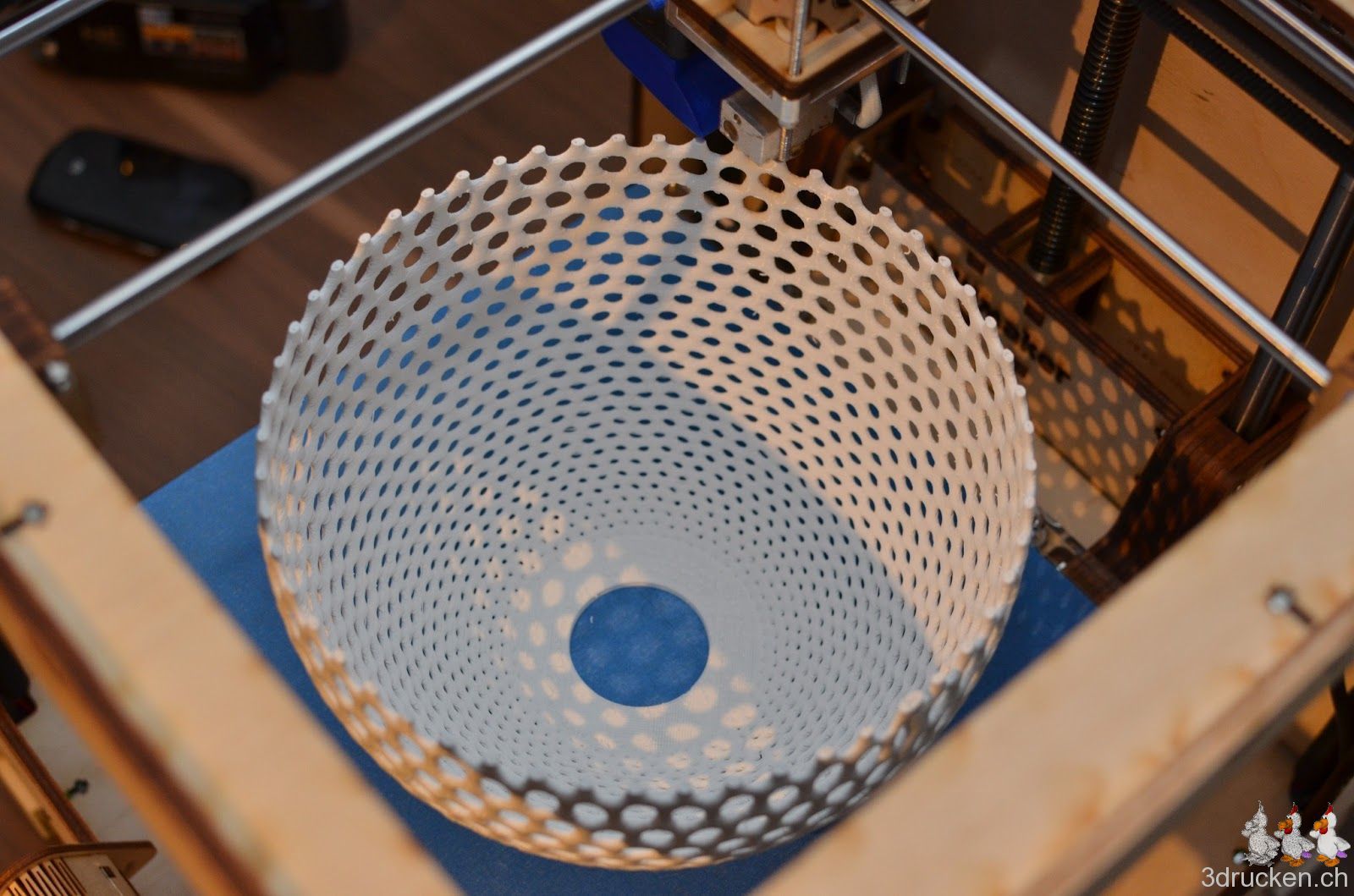 Wir haben den Tannery Light Shade mit Netfabb in zwei Teile geschnitten und danach einzeln aus weissem SwissRepRap-PLA in 0.2 mm Schichten mit einer noch streng geheimen Version von Cura gedruckt. Druckzeit: 16 h 52 min + 8 h 29 min = 25 h 21 min. Es hat sich gelohnt, das Teelicht-Schirm ist sehr schön und mit 37 cm richtig gross.