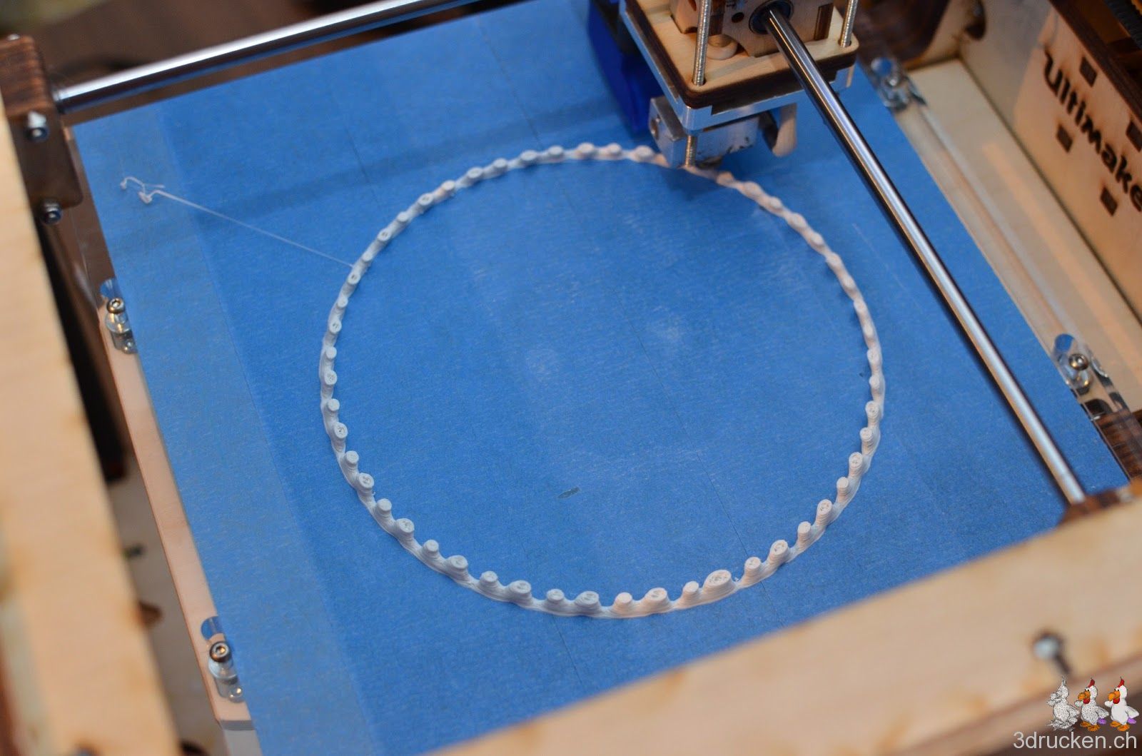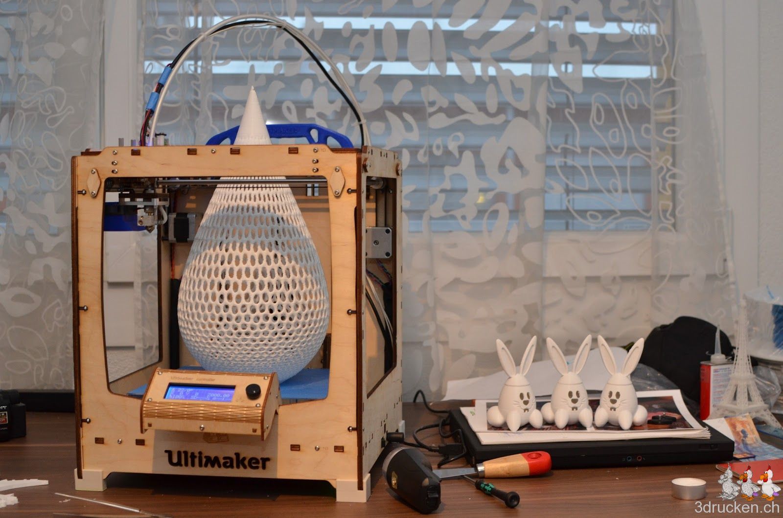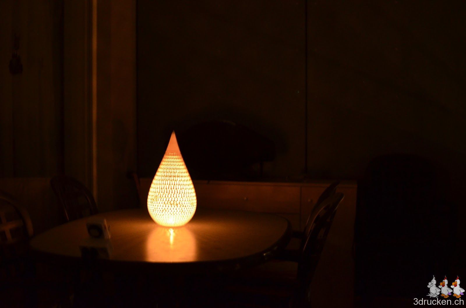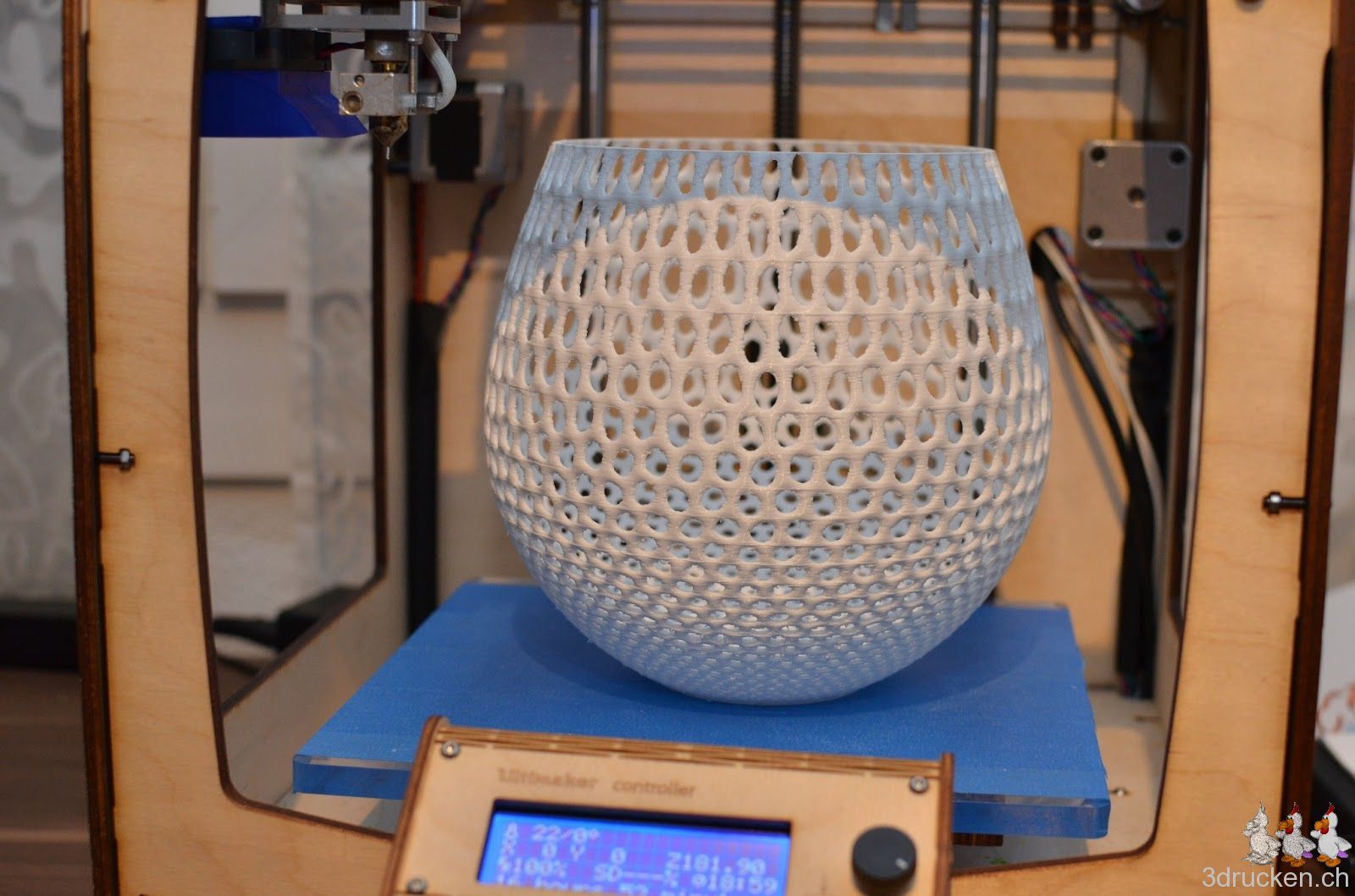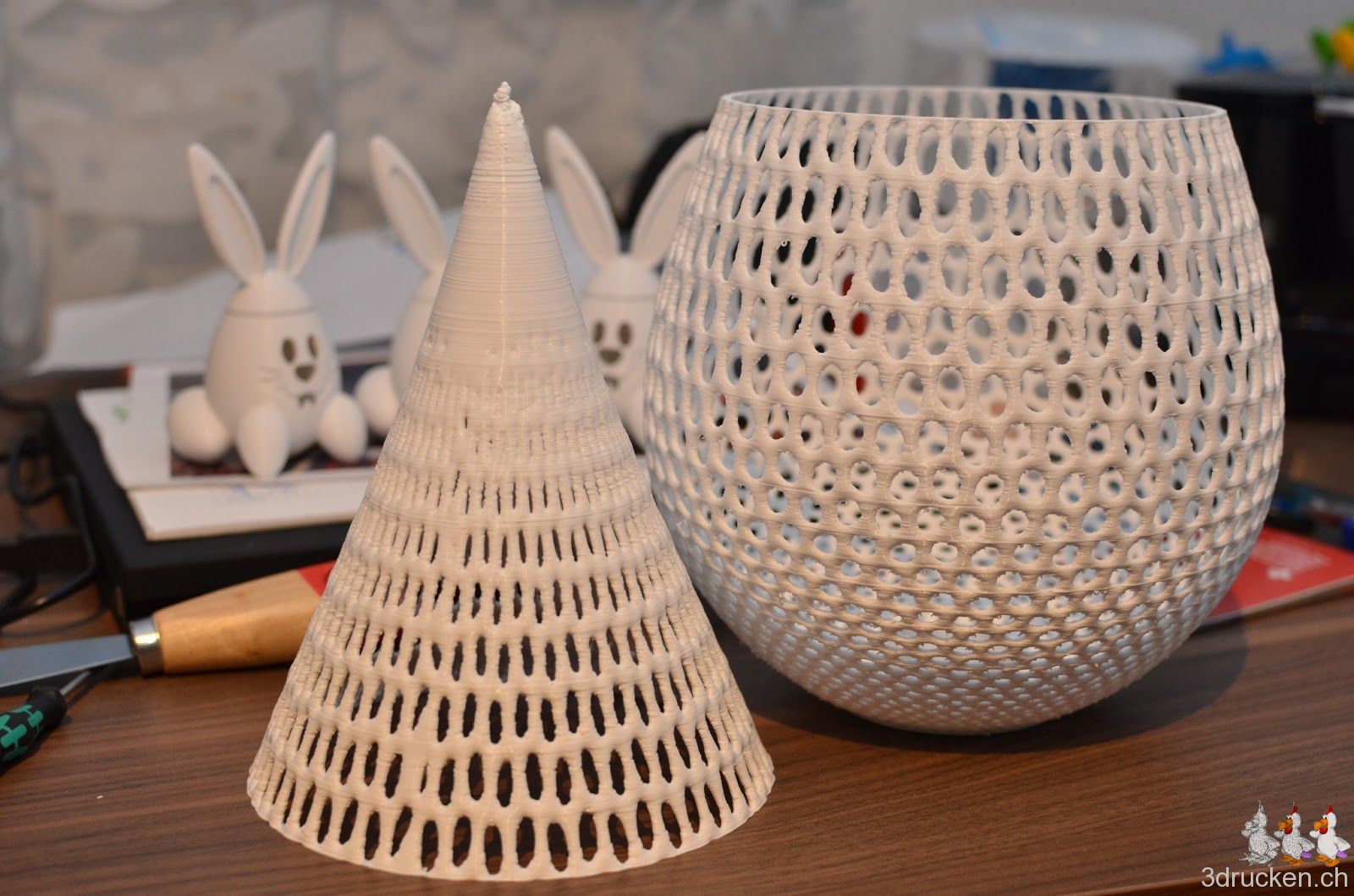 Wir haben den Tannery Light Shade mit Netfabb in zwei Teile geschnitten und danach einzeln aus weissem SwissRepRap-PLA in 0.2 mm Schichten mit einer noch streng geheimen Version von Cura gedruckt. Druckzeit: 16 h 52 min + 8 h 29 min = 25 h 21 min. Es hat sich gelohnt, das Teelicht-Schirm ist sehr schön und mit 37 cm richtig gross.