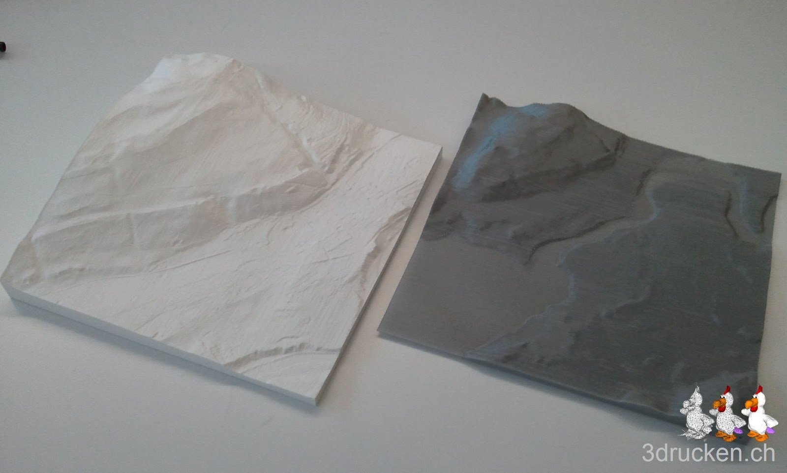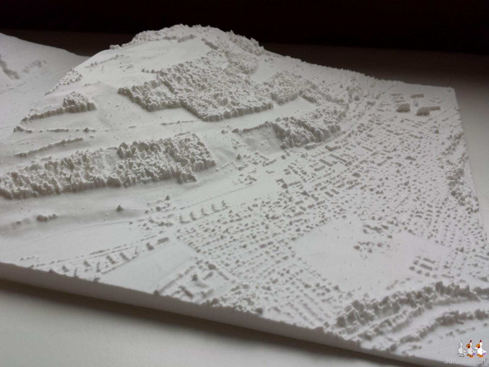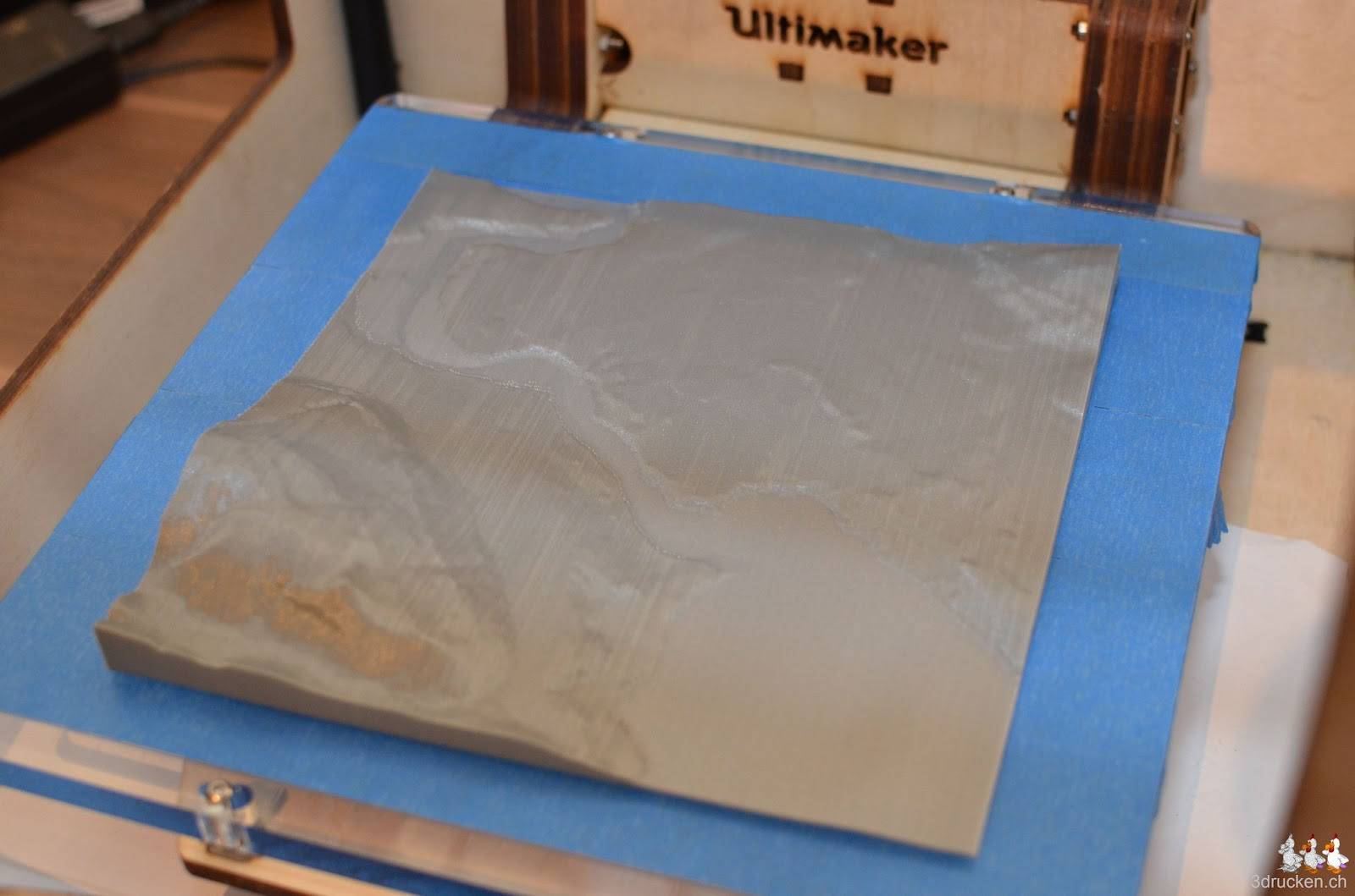 Die swisstopo stellt verschiedene Testdatensätze ihrer Höhenmodelle der Region Wabern zur Verfügung. Wir haben uns mal die Testdaten der drei Produkte runtergeladen und mit AccuTrans3D je ein Relief daraus erstellt, mit Cura 13.03 geslicet und anschliessend auf dem Ultimaker gedruckt. Die kompletten Datensätze DHM25 und auch swissALTI3D der ganzen Schweiz, sind für Schulen zu vertretbaren Preisen erhältlich.
