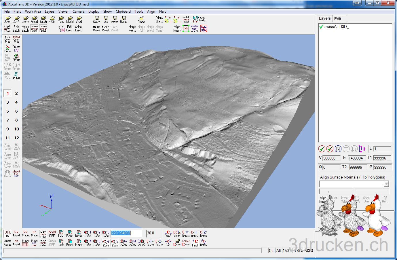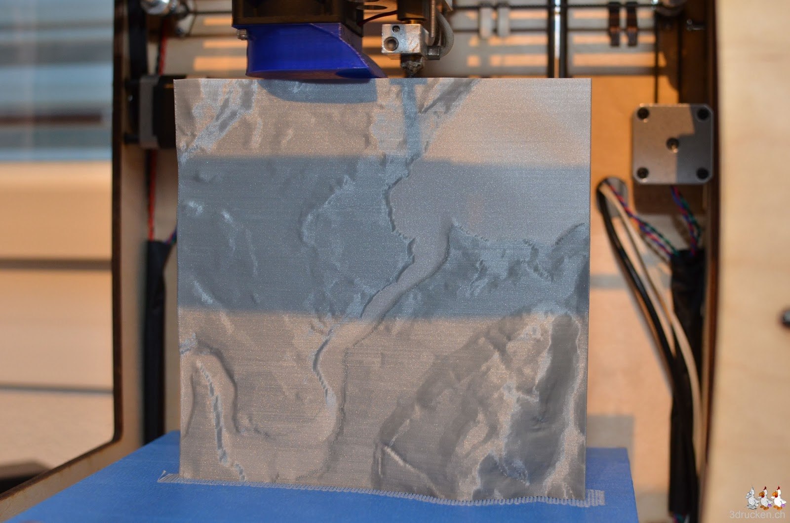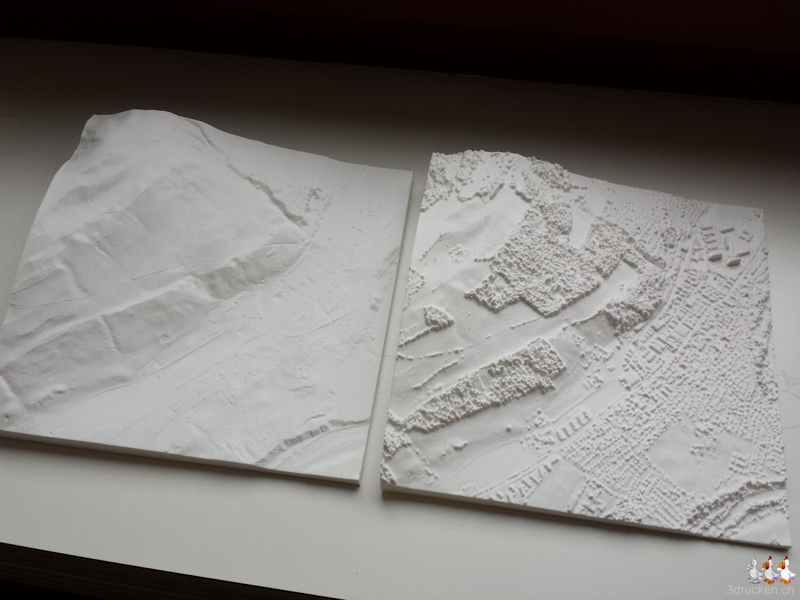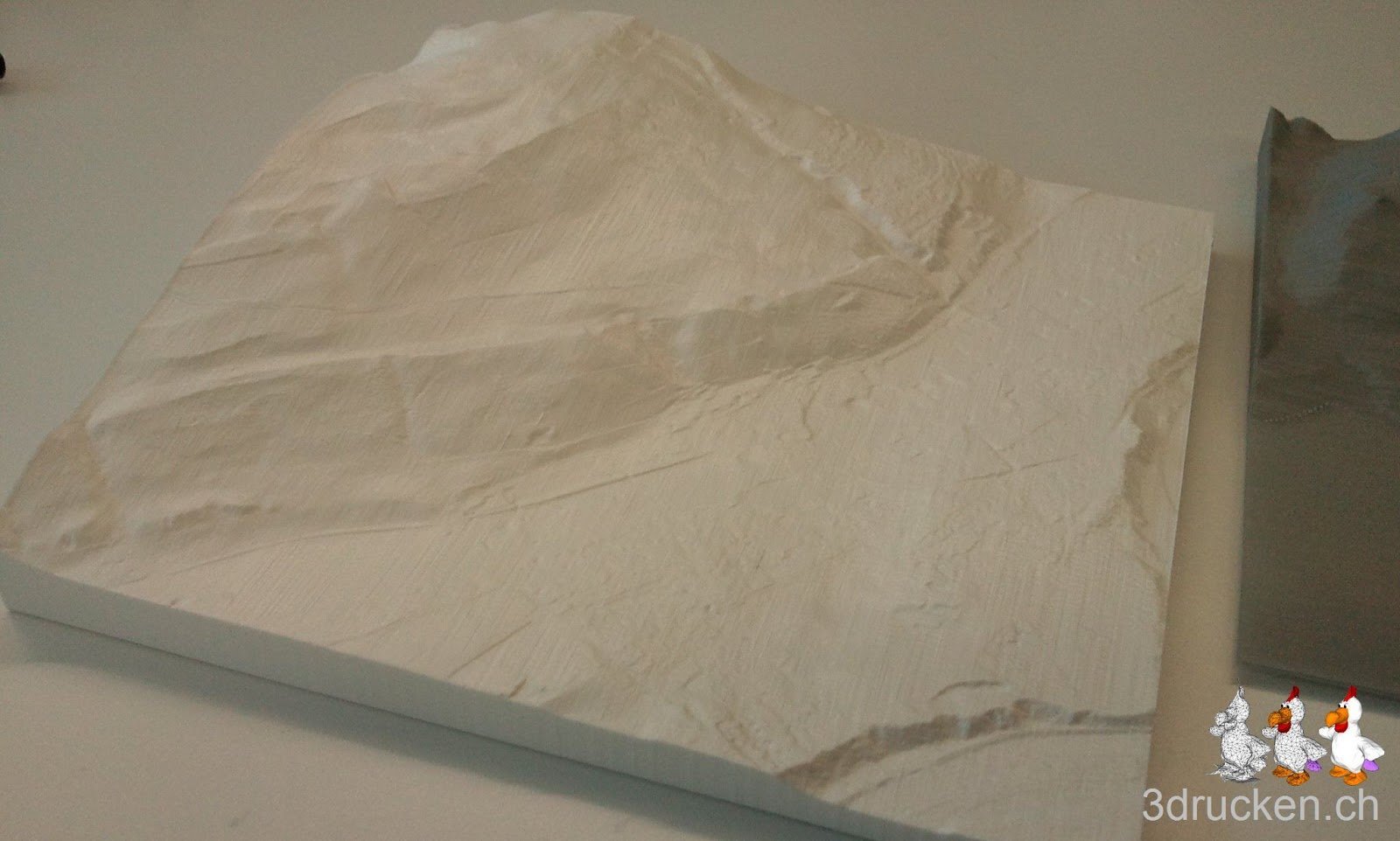 Die swisstopo stellt verschiedene Testdatensätze ihrer Höhenmodelle der Region Wabern zur Verfügung. Wir haben uns mal die Testdaten der drei Produkte runtergeladen und mit AccuTrans3D je ein Relief daraus erstellt, mit Cura 13.03 geslicet und anschliessend auf dem Ultimaker gedruckt. Die kompletten Datensätze DHM25 und auch swissALTI3D der ganzen Schweiz, sind für Schulen zu vertretbaren Preisen erhältlich.