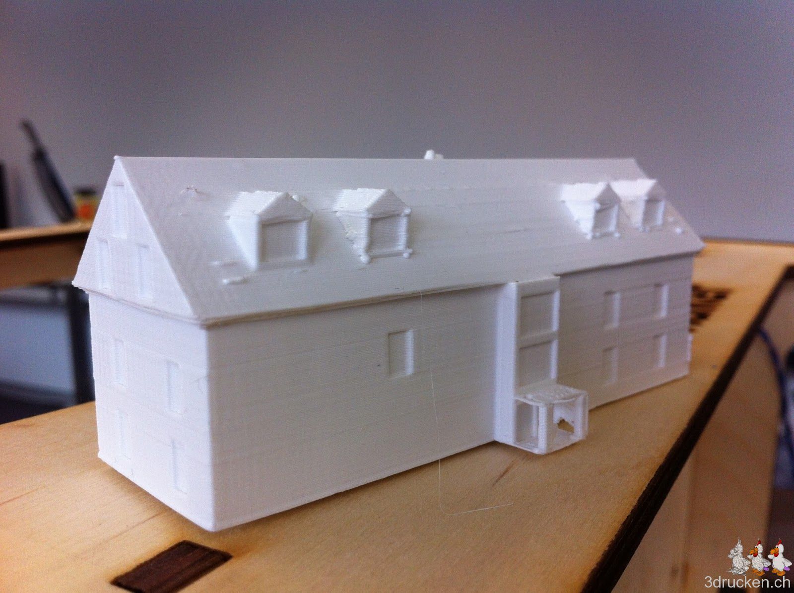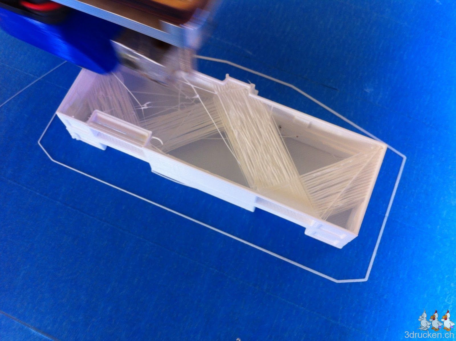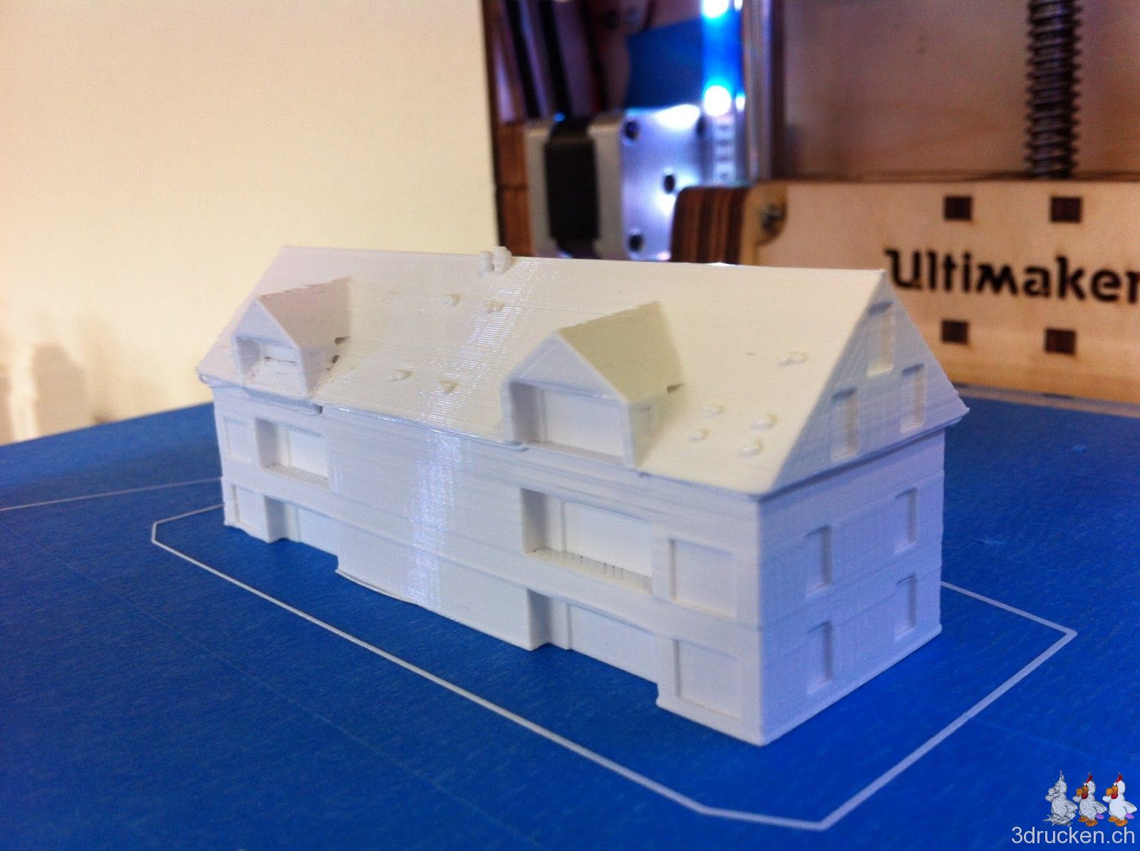 Heute Morgen druckten wir zum Test ein Modell aus, das wir in Sketchup gezeichnet hatten. Mit 0 % Füllung und bei 220° C. Der Druck dauerte 1 Stunde und 40 Minuten.
