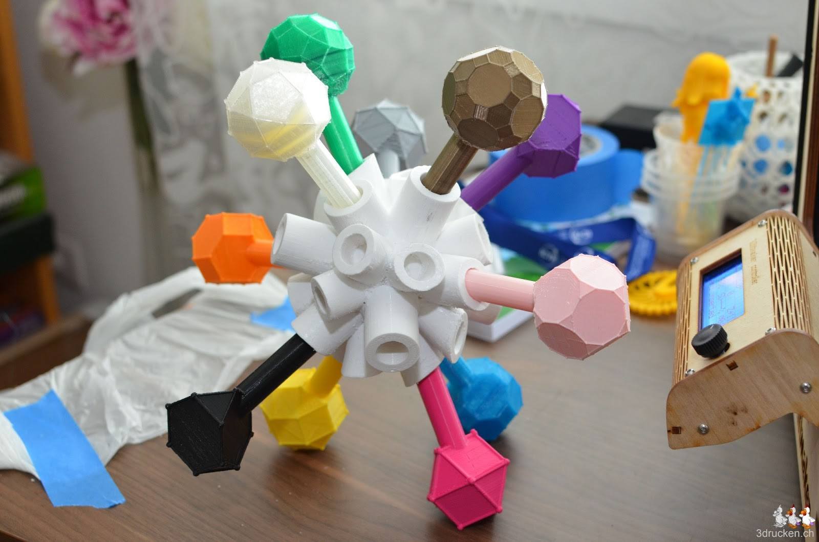 Vier gleichseitige Dreiecke und vier regelmässigen Sechsecke bilden diesen erstaunlich einfachen Archimedischen Körper, den Tetraederstumpf. Bis auf die beiden Körper, deren Ausdruck mehr als die 10 m Filament benötigen würde, ist die Sammlung nun vollständig. Gleich geht es mit den 13 Catalanischen Körpern weiter. Druckzeit für den Tetraederstumpf: 3 h 25 min, mit Support.
