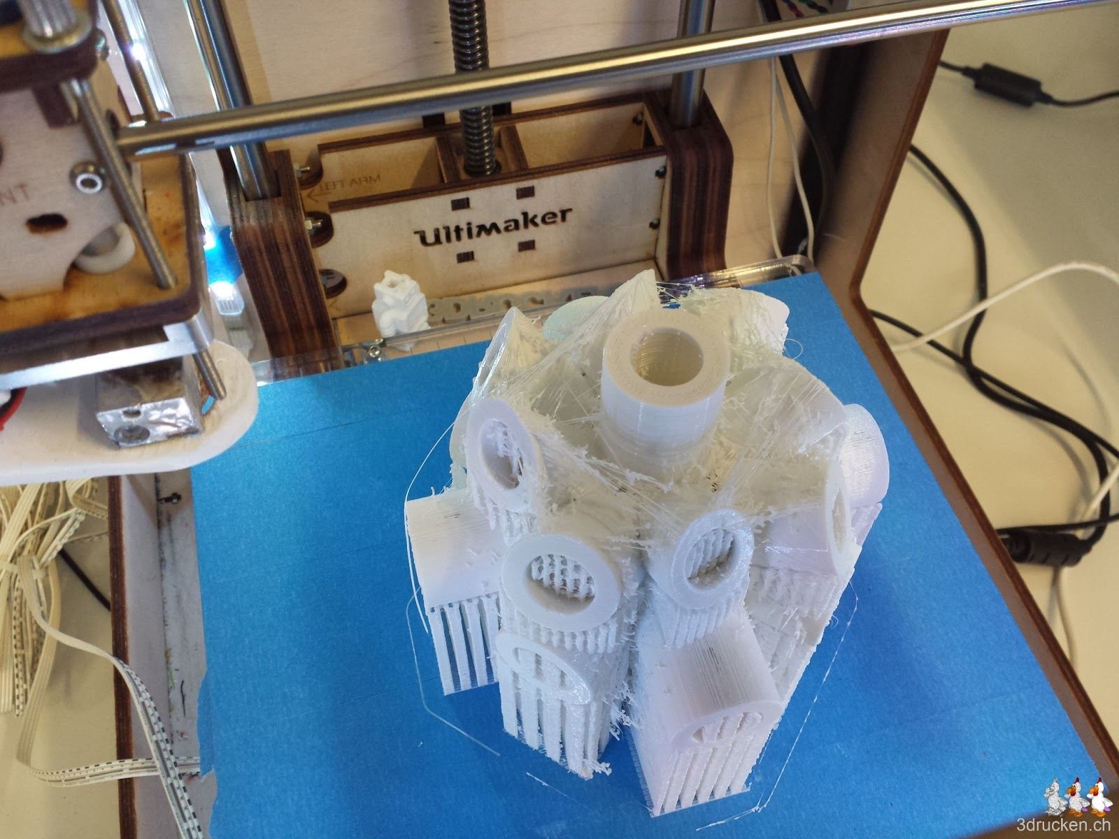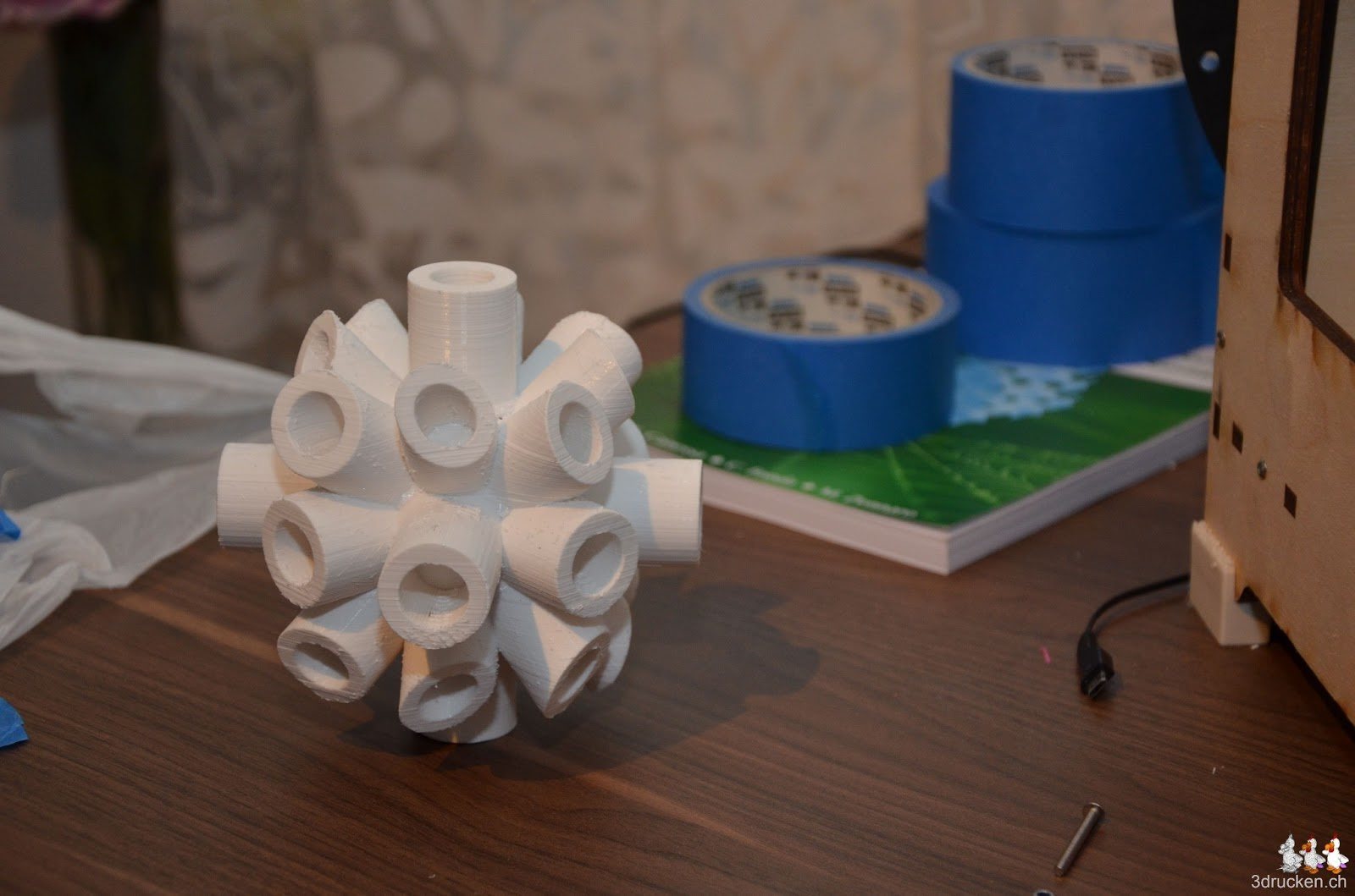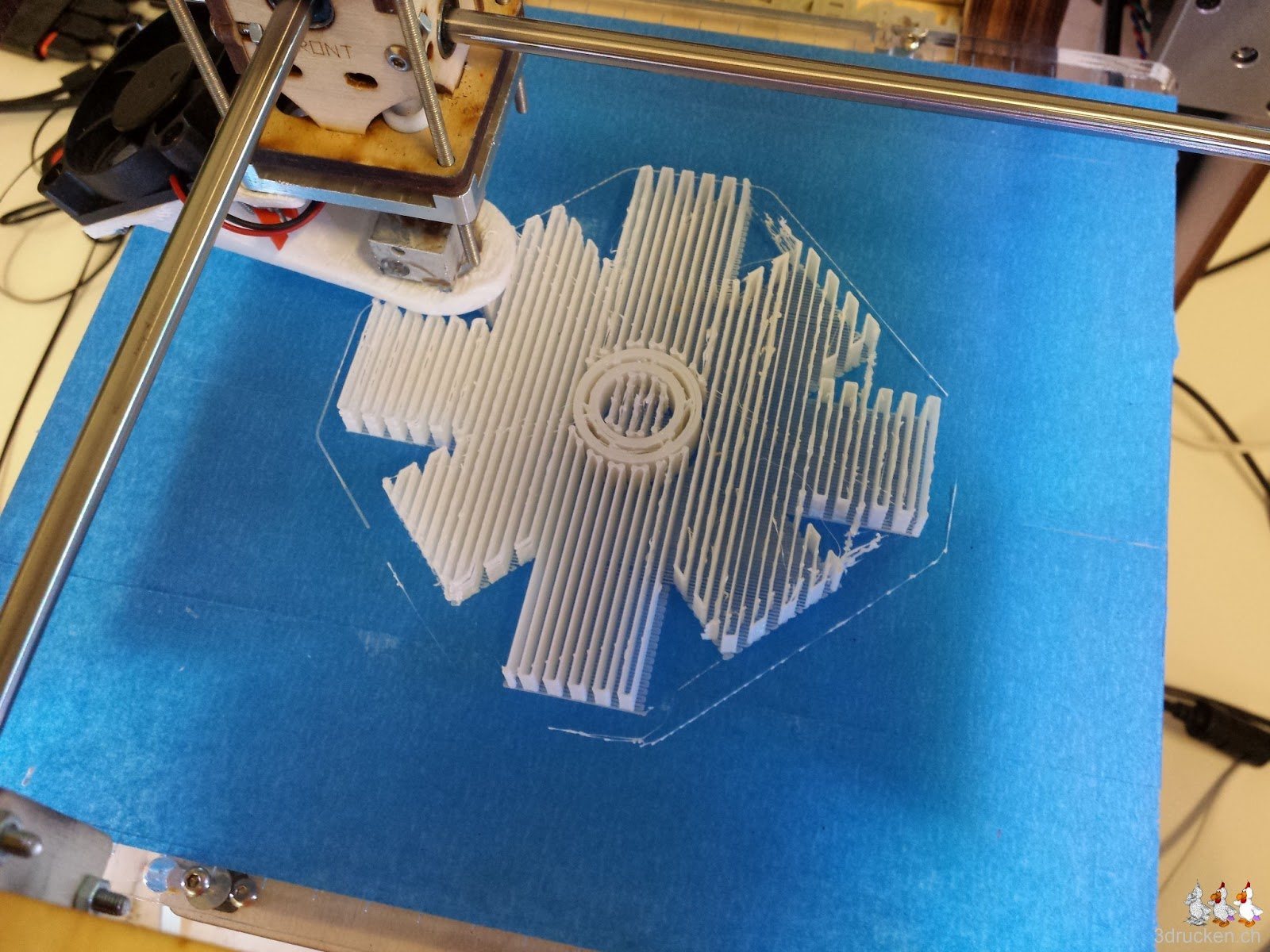 Als erstes Element des The Gem von Oliver Knill aus Harvard, haben wir übers Wochenende das Centerpiece gedruckt. Geslicet in Slic3r, da Cura bei solch grossen Objekten immer abstürzt. Trotz den 50 separaten Meshes, hat Slic3r einen vernünftig zu druckenden G-Code generiert. Im Vergleich zu KISSlicer, den wir das selbe Objekt auch slicen liessen, benötigte der Slic3r lediglich 10 % der Dateigrösse. Der Druck mit Support und 10 % Füllung dauerte ganze 24 h 15 min.
