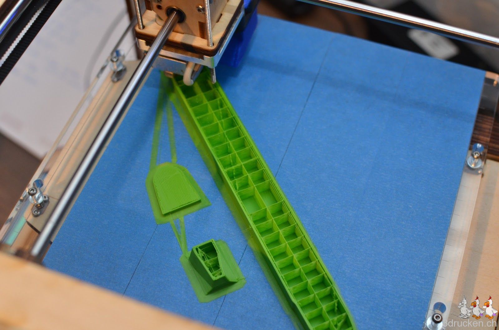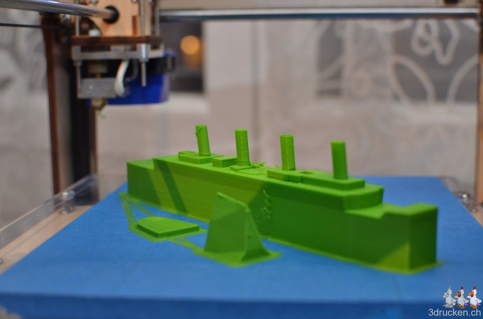 Was der BfB 3DTouch nicht geschafft hatte, hat nun der Ultimaker erledigt. Das Modell der Titanic, und was nicht fehlen darf, das eines Eisbergs. Die Titanic haben wir aus grünem Ultimaker PLA bei 215° C, 0.2 mm Schichten und 5 % Füllung gedruckt und die 3 Teile danach mit Sekundenkleber zusammengeklebt.