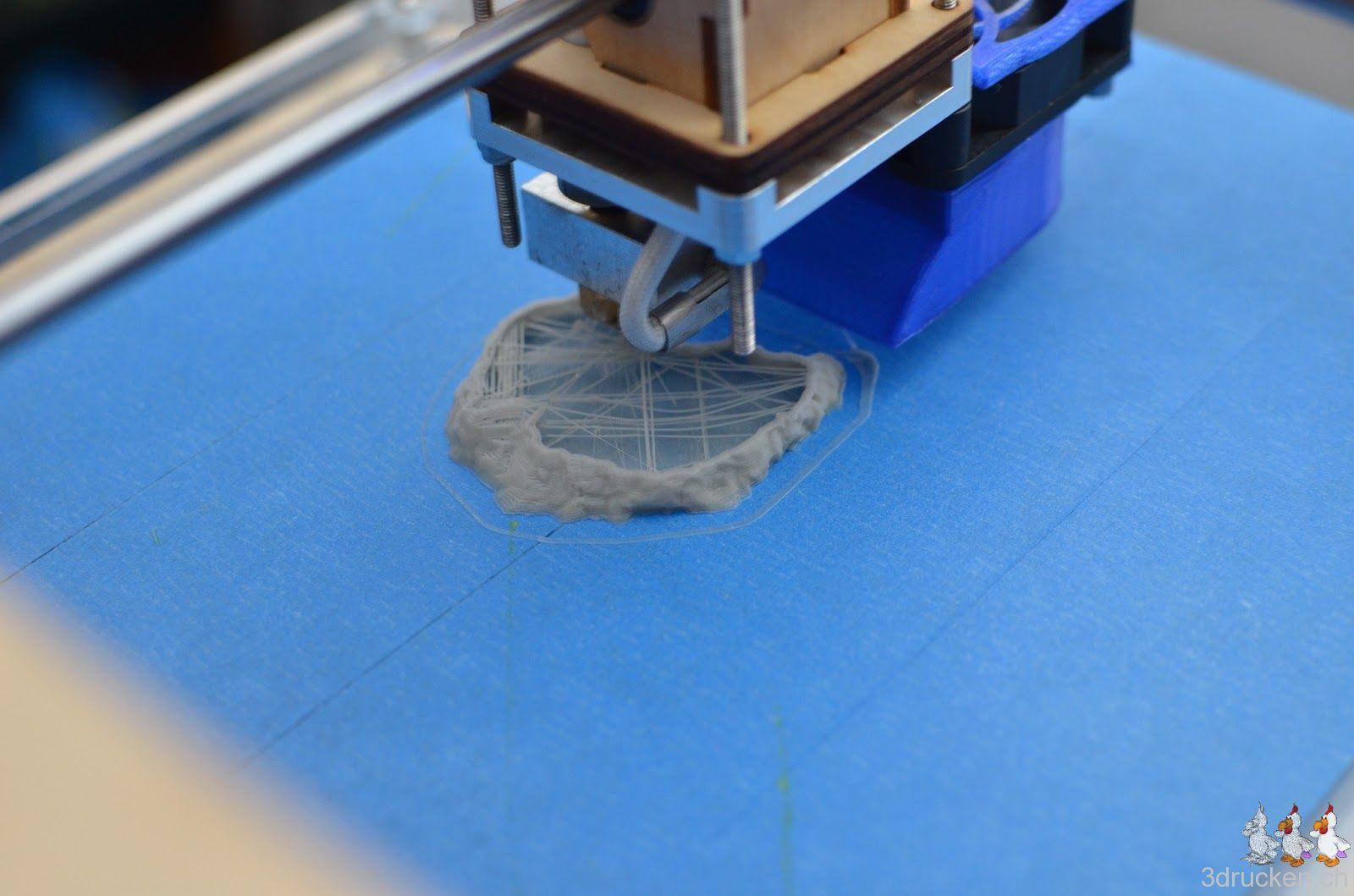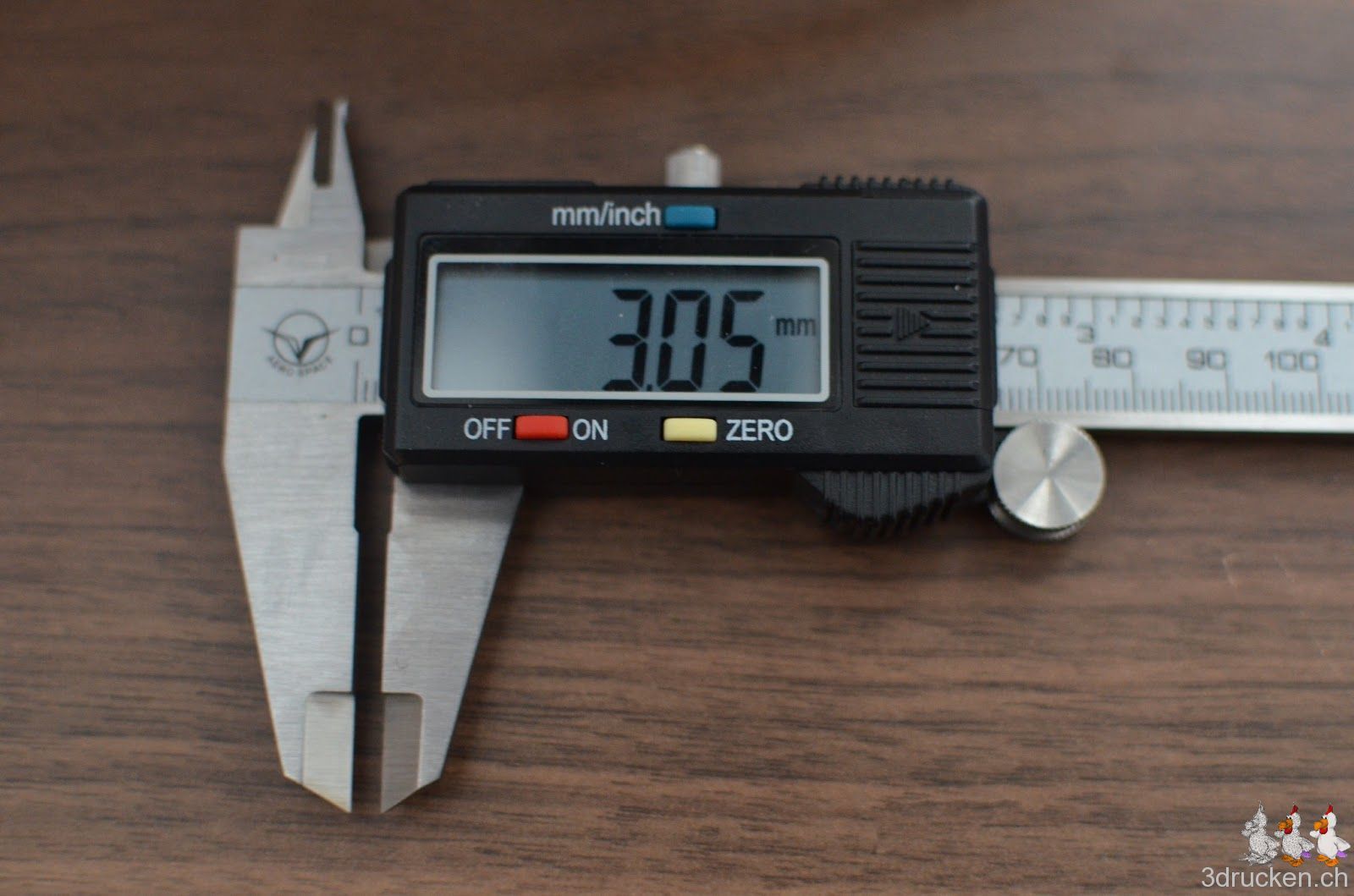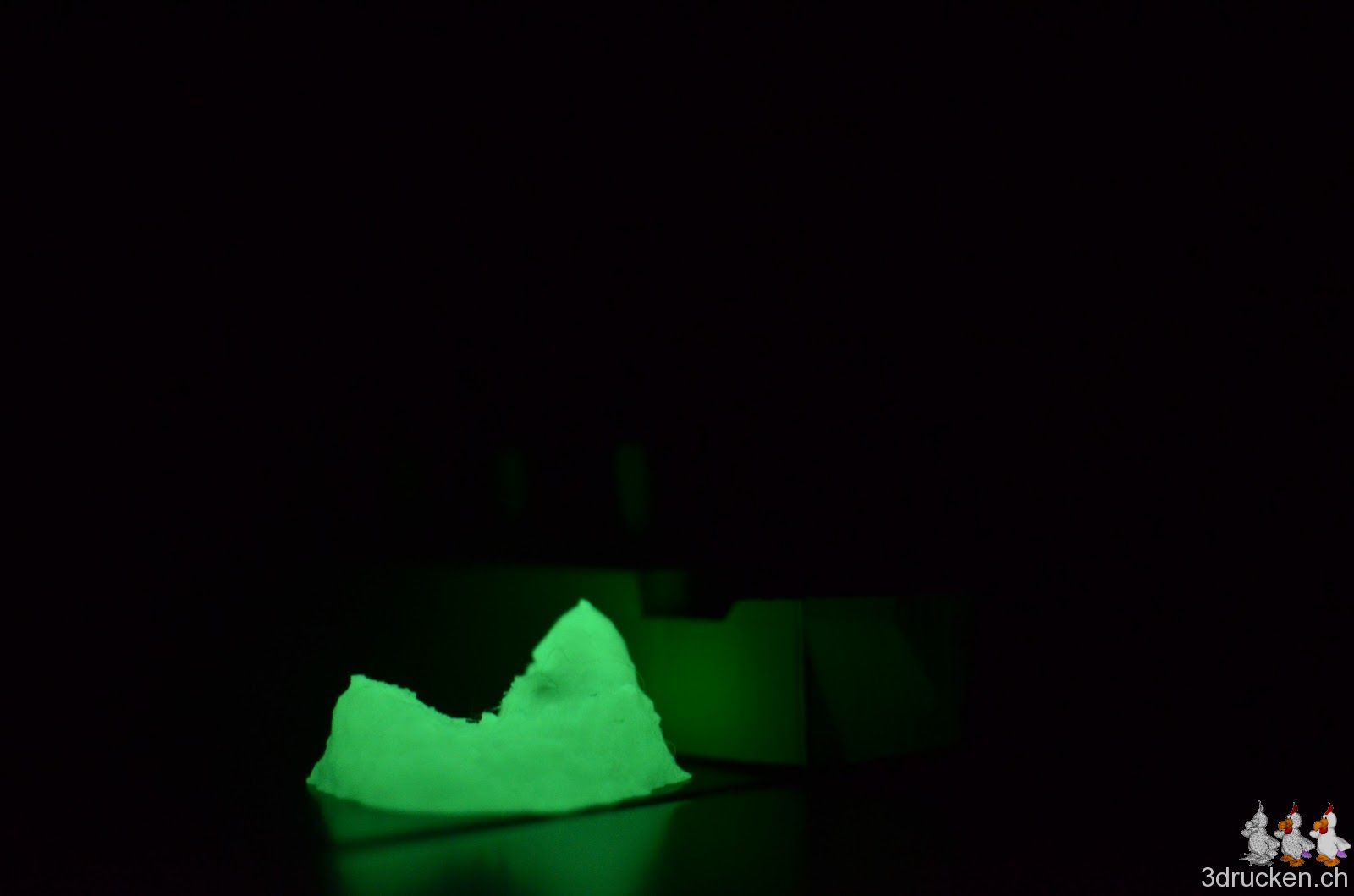 Um die Sichtbarkeit bei Nacht zu verbessern, haben wir den Eisberg aus fabberworld PLA nachtleuchtend grün gedruckt. Dieses Filament fühlte sich relativ dick an, was uns nachmessen liess. Mit durchschnittlich 3.05mm Durchmesser liegt es klar über den bisher verwendeten 2.89 mm im Slicer. Mit etwas Feinöl liess sich der Eisberg daraus aber trotzdem gut bei 210° C, 50 mm/s und 0 % Füllung drucken.