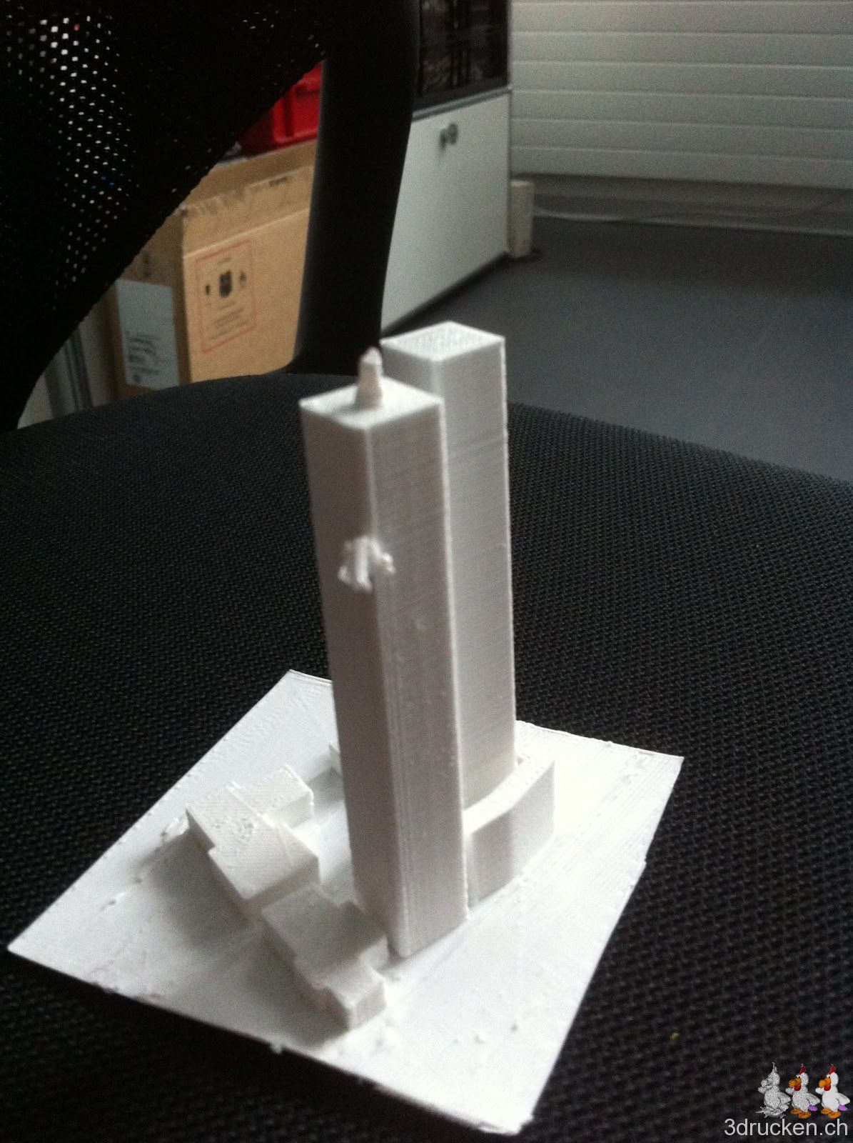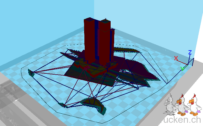 Das Modell war aber nicht über alle Zweifel erhoben. Der Boden wurde wie schon beim ersten Versuch nicht sauber gedruckt. Auf den ersten Schichten wurden ausserhalb unnötige Supportteile gedruckt. Dies war auch schon im Cura angezeigt worden. Wahrscheinlich war das Modell einfach nicht sauber verarbeitet.Die Einstellungen wurden sonst wie vorher übernommen. Der Druck dauerte gute 2 Stunden und 18 Minuten.