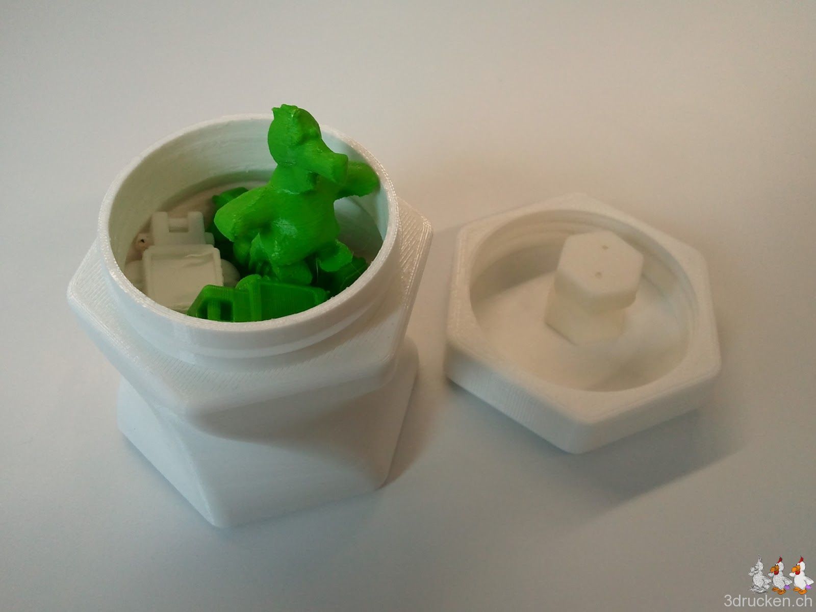 Wir hatten schon eine Twisted Bottle gedruckt, nun diese etwas grösser. Zum Vergleich ein Objekt aus einem Dimension 3D-Drucker, welches wir an der Didacta am Stand von mecasale Fertigungssoftware GmbH (inzwischen alphacam swiss GmbH) bekommen hatten.
