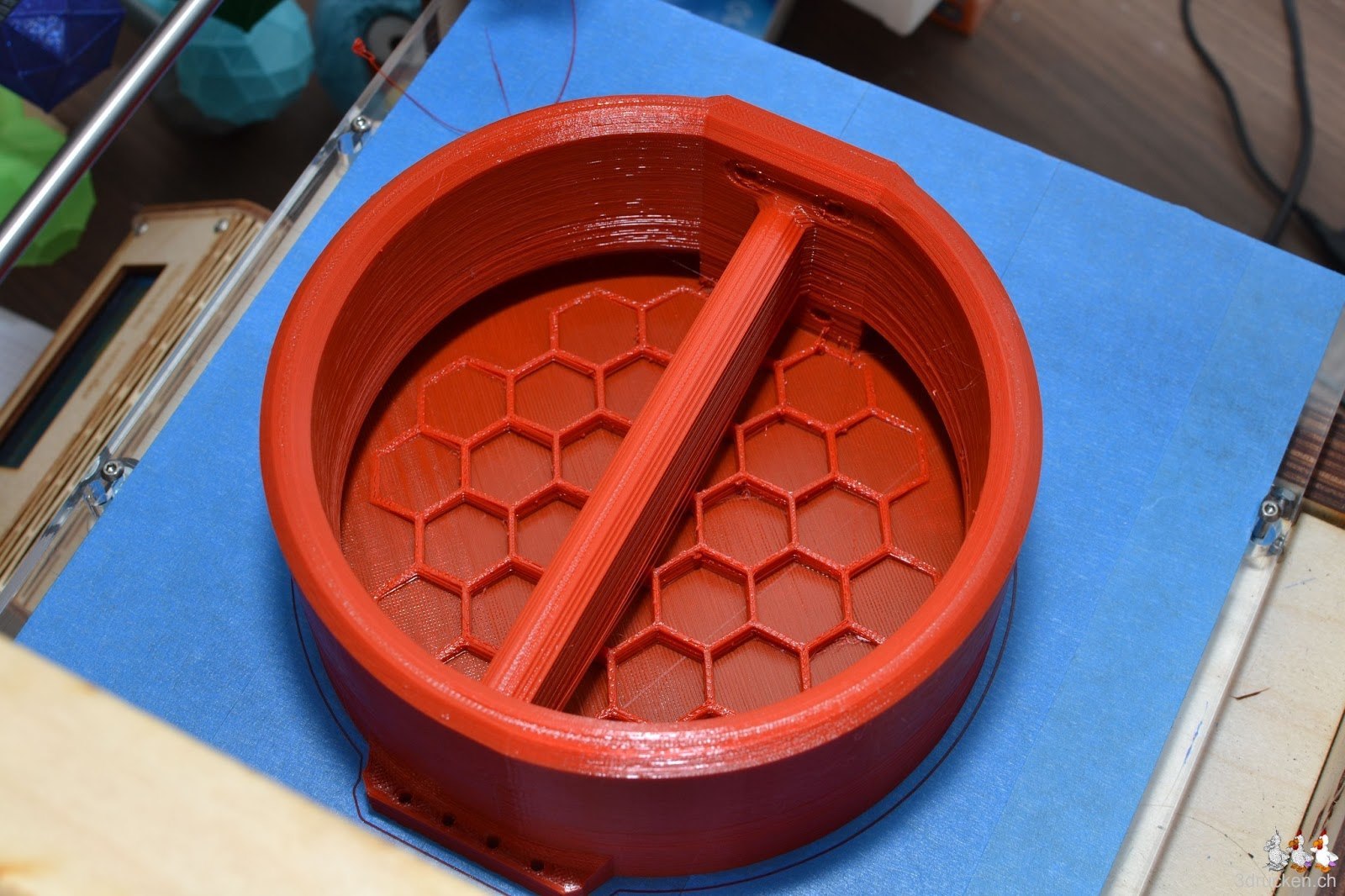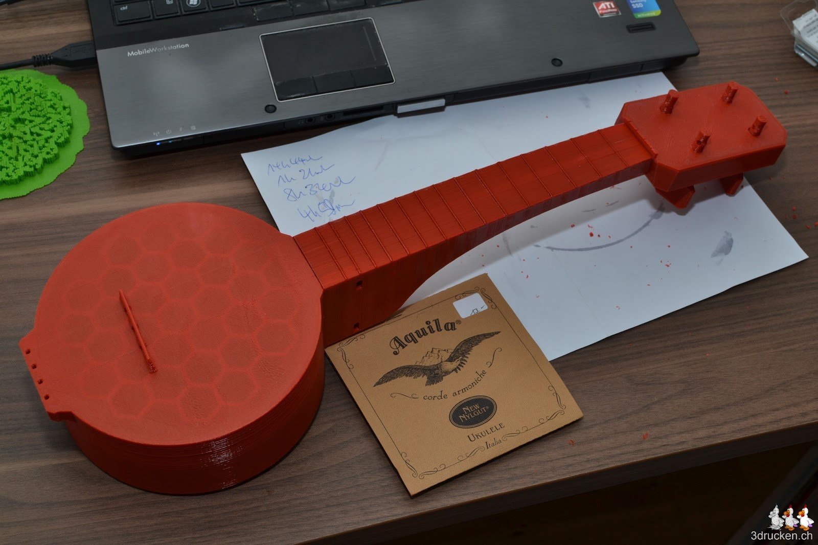 Kopf ohne mechanische Teile, gedruckt in 6h aus 0.08 mm Schichten.Da steckten wir allerdings etwas fest, weil sich dieses Modell nicht richtig für den 3D-Druck eignet. Inzwischen sind bei Thingiverse weitere Designs aufgetaucht, welche sich wie unser Test zeigt, bedeutend besser für den 3D-Druck eignen. Wieder mal wird dadurch deutlich, dass es sehr stark auf die Qualität des Modells ankommt.Die Einzelteile derBanjo Ukulele (Banjolele) haben wir in 29h 43min mit 0.2mm-Schichten ausgedruckt, zusammengeschraubt und Sopran Ukulele Saiten aufgezogen. Nun warten wir darauf, dass Christian Dietz uns das Instrument stimmt.