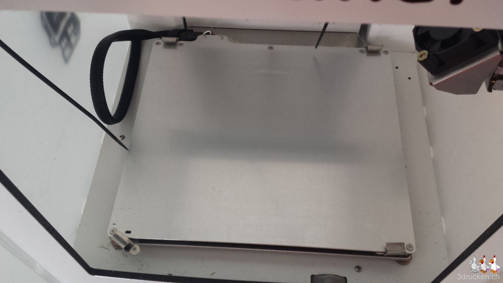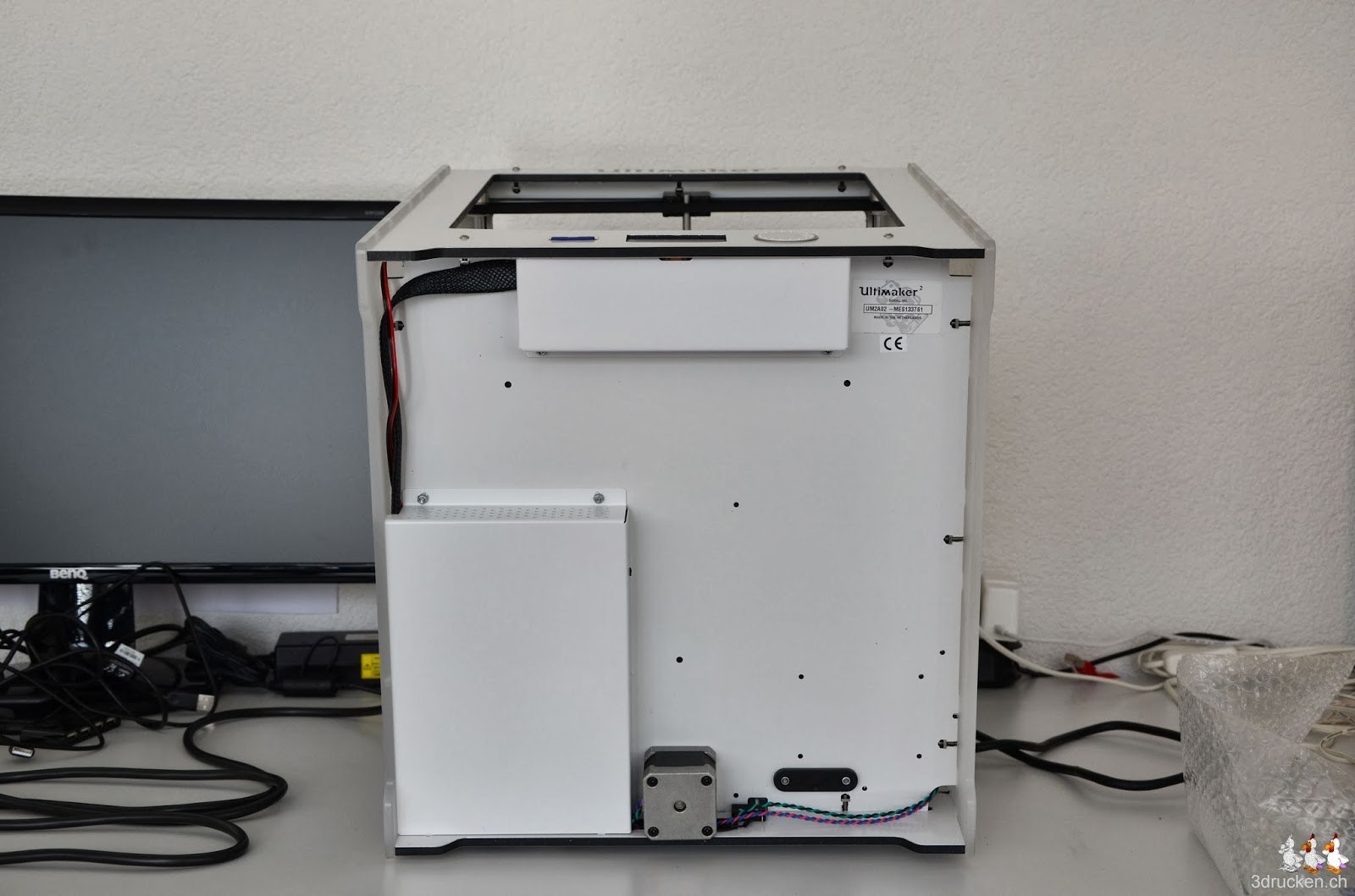 Weiter fällt auf, dass der Drucker nicht gerade auf dem Tisch steht, die Füsse scheinen nicht gleich hoch zu sein, oder das Gehäuse hat sich durch den Transport verzogen. Im Vergleich mit dem Original Ultimaker macht der Neue aber einen sehr soliden und guten ersten optischen Eindruck. Auch auf der Unterseite des Geräts wurde durch die Box mächtig aufgeräumt.