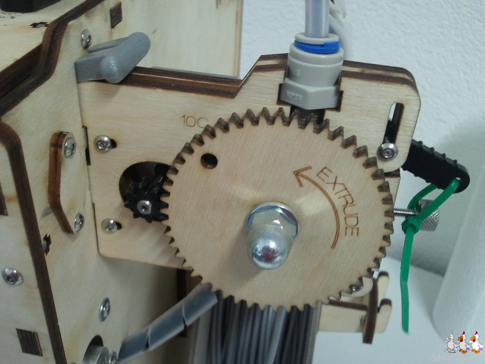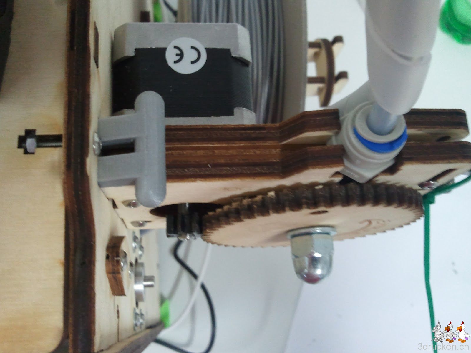 Da nach den ersten paar Tests die Holz-auf-Plastik-Mechanik bereits etwas mitgenommen aussieht, haben wir einen Ersatz für die Schublade gedruckt, bevor noch mehr Zähne des Holzzahnrads abgeschliffen sind. Sollten die Druckresultate schlechter werden, oder der Vorschub stocken, werden wir das Zahnrad ersetzen.