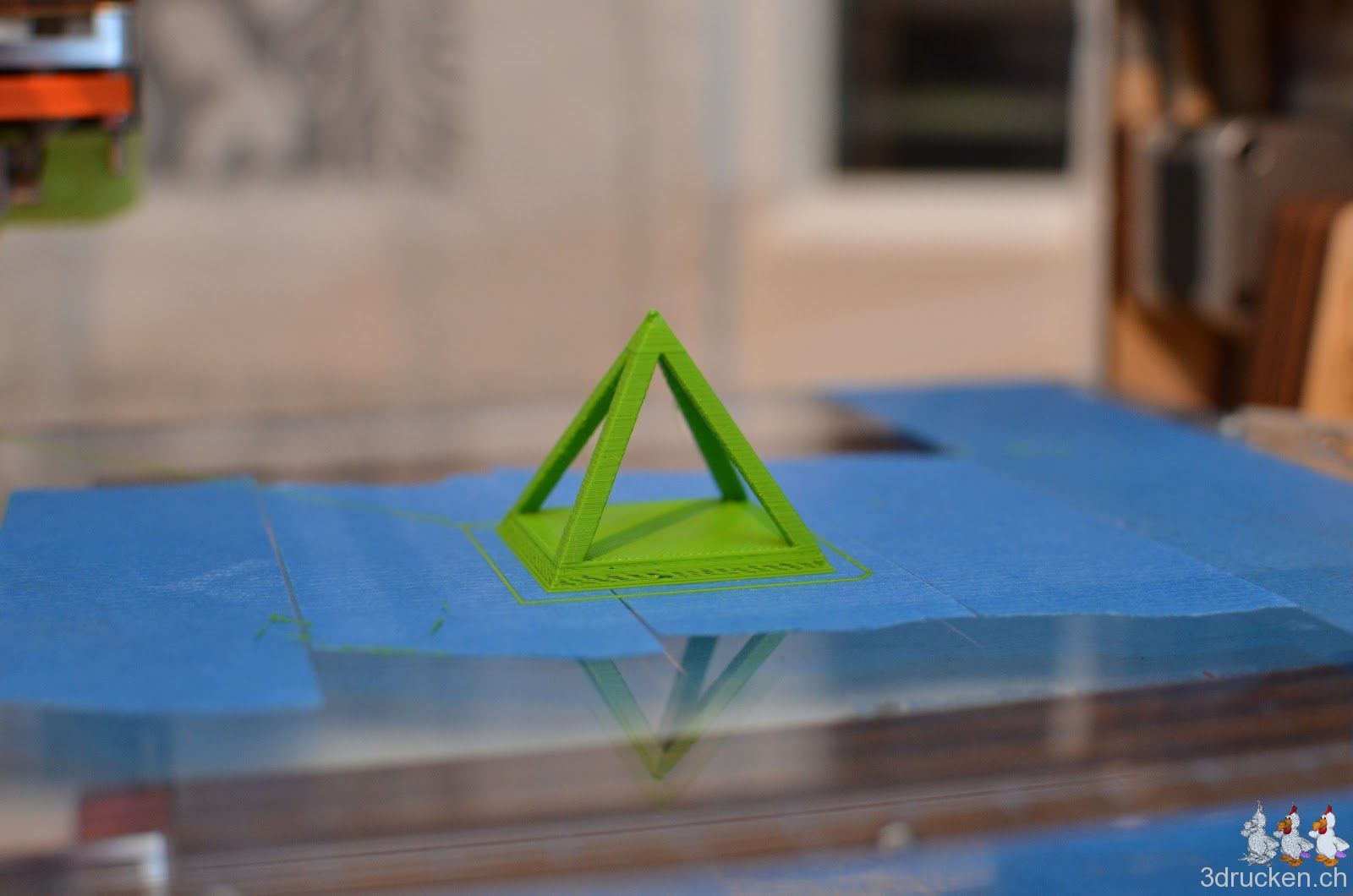 Die Pyramiden auf den Fotos sind beide ungesäubert direkt nach dem Druck. Die Feder beim Extruder musste für die 210° C im Gegensatz zu den 220° C etwas mehr angezogen werden. Modell: http://www.thingiverse.com/thing:8757