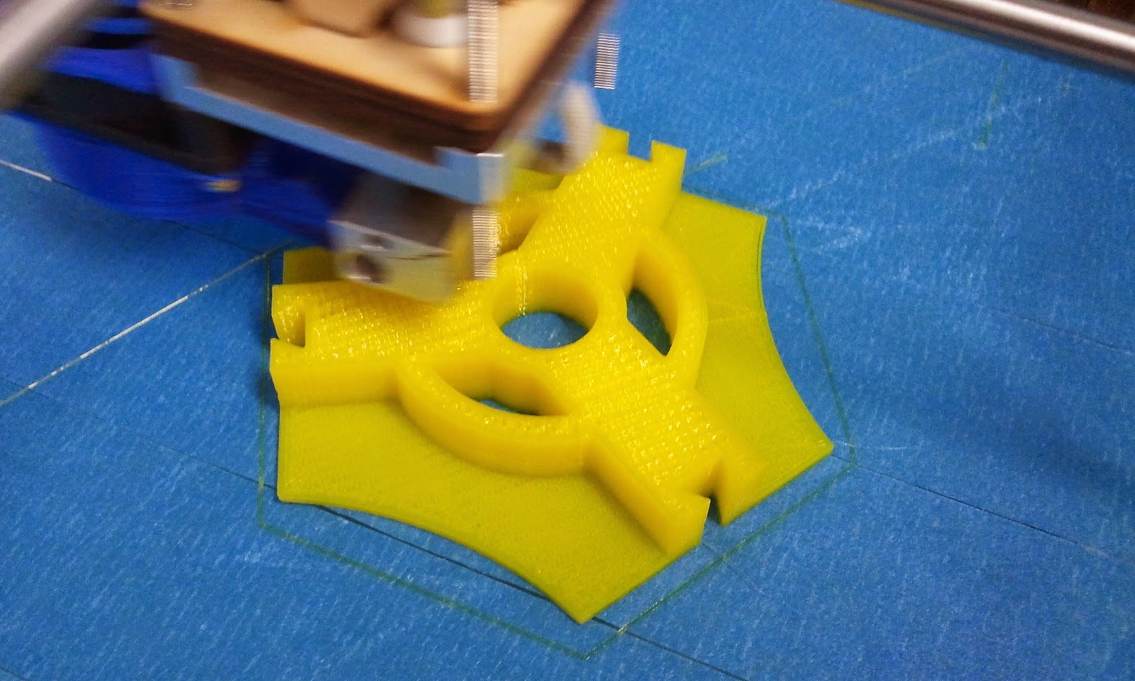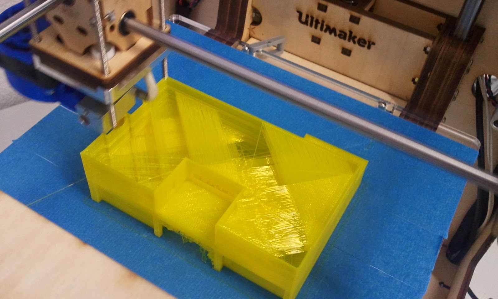 Aktuell läuft der Druck des Hauses in weissem PLA, diesmal allerdings mit 5 % Füllung geslicet mit Cura 12.11, und das erste Teil der Heavy duty printable filament spool in Gelb.