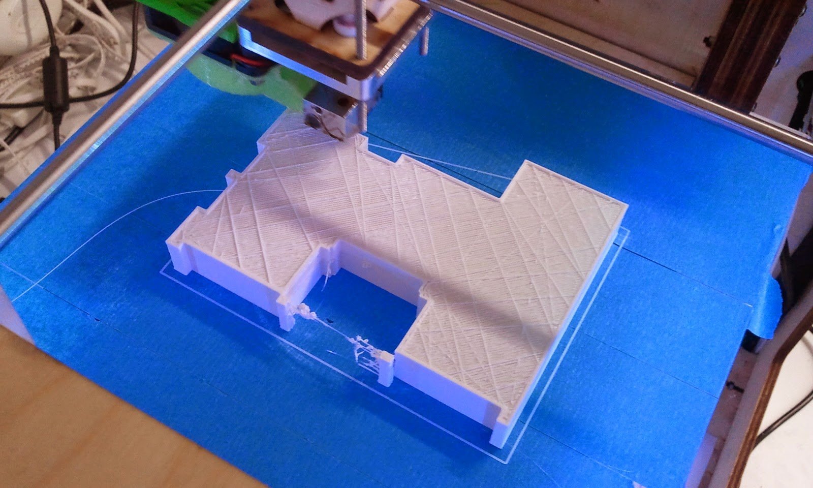 Wir konnten nun den Stau beheben. Viel haben wir nicht gemacht, ausser einen der beiden Druckköpfe auseinander genommen und gesehen, dass wir keine Probleme mit Bowden Plugs haben. Vielmehr scheint der Einsatz von Retraction in Kombination mit dem Hot End v2 von Ultimaker Probleme zu bereiten. Kaum ausgeschaltet, für Fabberworld-PLA 210° C, und das weisse SwissRepRap-PLA 230° C beim Slicen eingestellt, drucken beide Geräte wieder, wie wenn zuvor nichts gewesen wäre. Also tut euch einen Gefallen und schaltet vorübergehend die Retraction aus. In den meisten Fällen können die feinen Fäden nach dem Drucken leicht entfernt werden.So entstanden heute bereits 2 Schneemänner und eine Schneeflocke, sowie ein Testdruck des Hauses von Parzelle 11 aus Güggeltown (Cura, 0 % Füllung, ohne Support, Druckzeit 3 h 30 min).