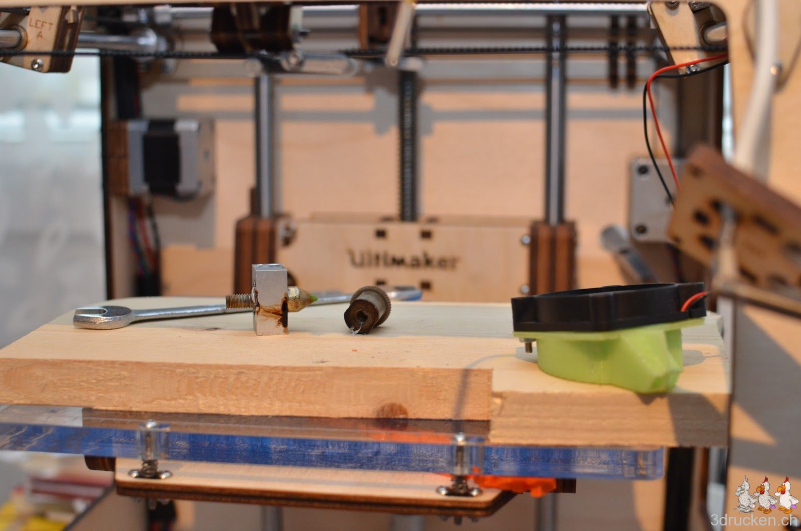 Da haben wir uns zu fortgeschrittener Stunde noch entschlossen, das Hot End V2 Upgrade zusammen zu bauen, welches wir vorsorglich schon mal bei Ultimaker bestellt hatten. Welch eine Geburt! Bitte, bitte Ultimaker, überarbeitet die Bauanleitungen, auch wenn sie euch nicht direkt Umsatz bringen. Ein Teil in der Auslieferung war sogar falsch rum gefertigt, sodass wir noch das Taschenmesser hervorkramen mussten.