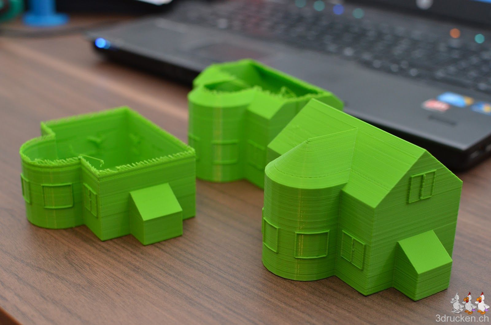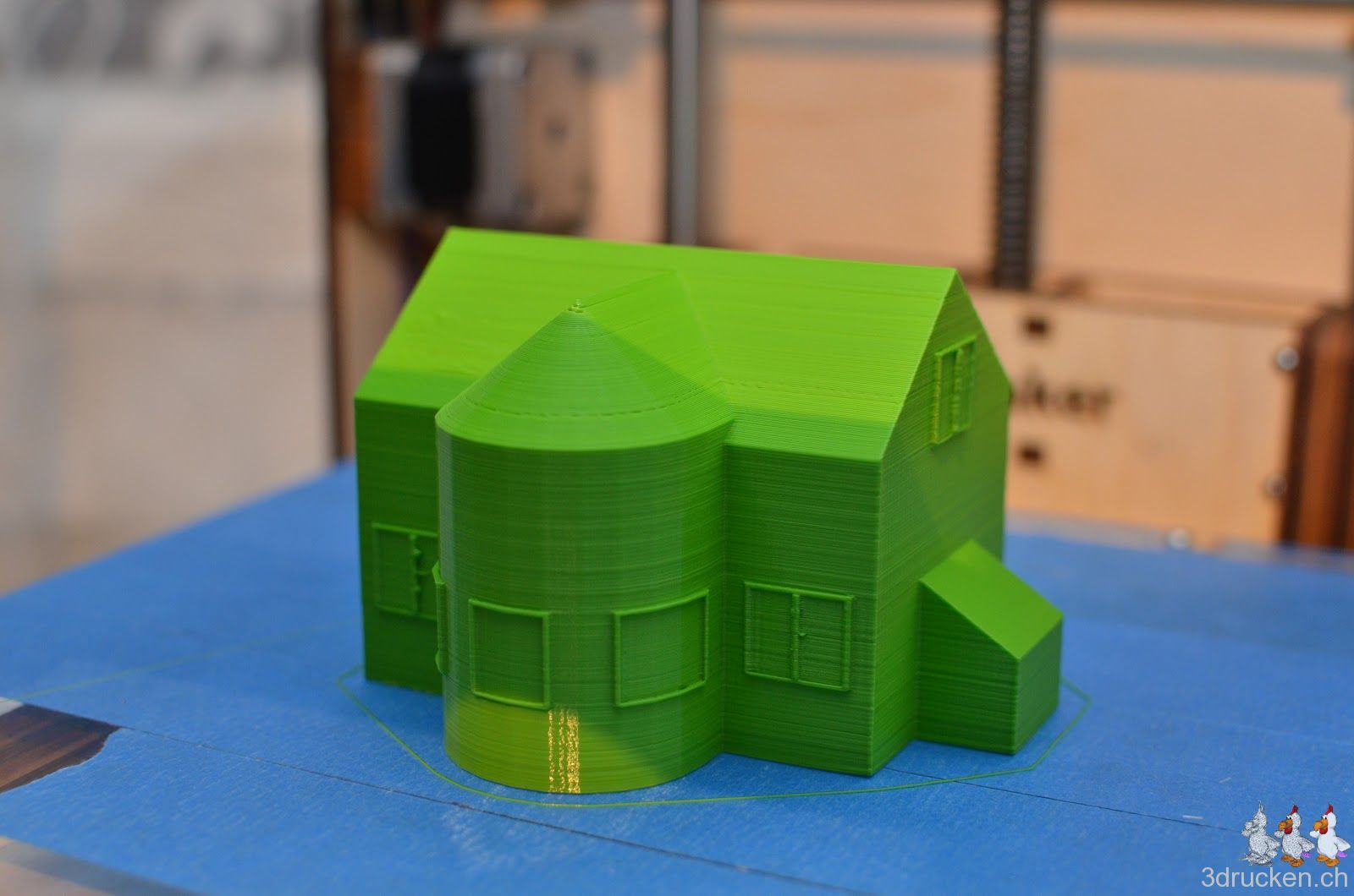 Die bisherigen Drucke lassen trotzdem vermuten, dass wir das neue Hot End richtig rum zusammengebaut haben. Musterhaus Dimensionen 98 x 80 x 67 mm, Geslicet mit Cura, 0.16 mm Schichten, 0 % Füllung, 1mm Wandstärke, 0.6 mm, 220° C Ultimaker-PLA grün, Druckzeit 2 h 6 min.