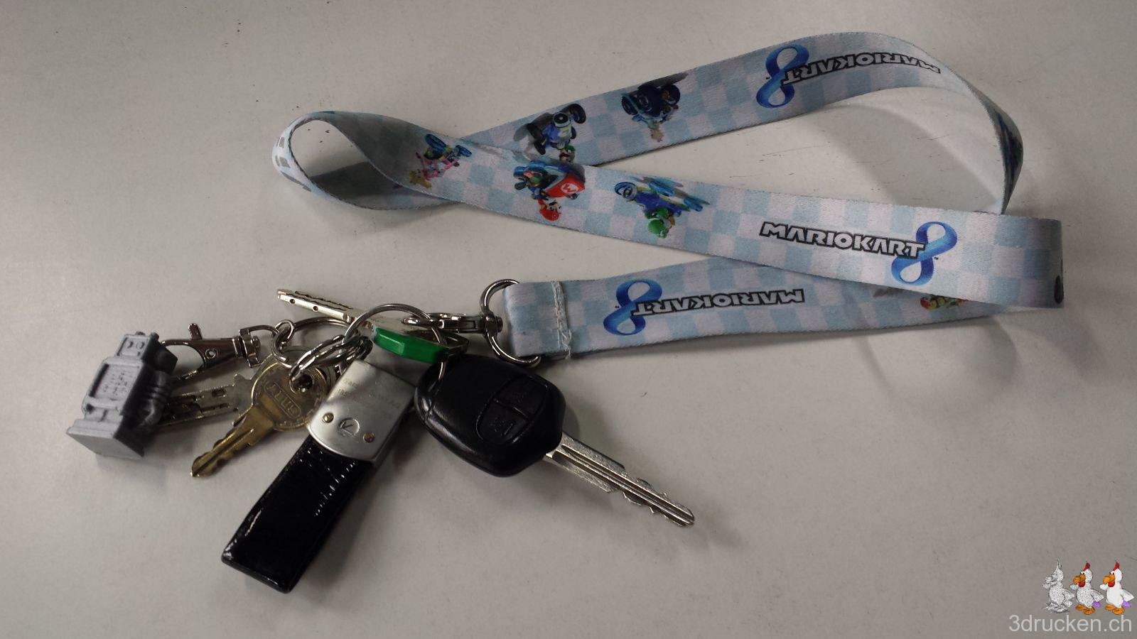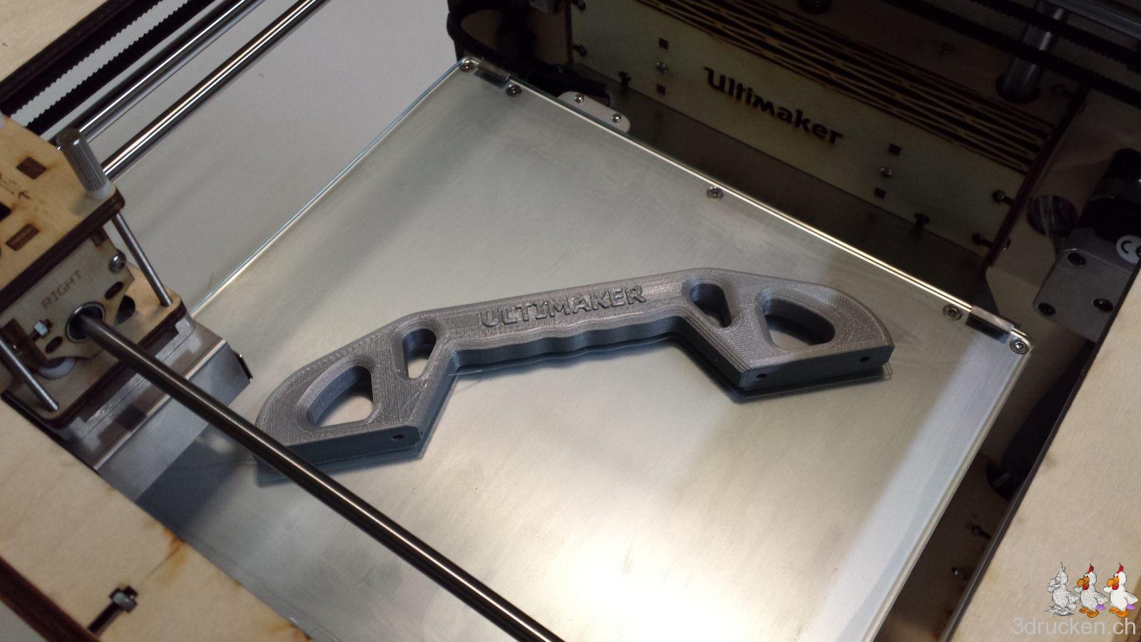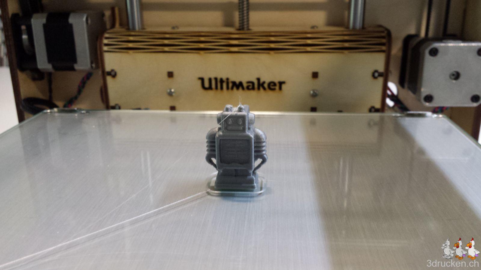 Nach dem Erfolgreichen Zusammenbau haben wir in Cura ein neues Gerät vom Typ Ultimaker Original+ angelegt, die Firmware via USB aktualisiert, die Heizung und den Endstopp getestet. Danach den Z-Stopp positioniert, den Tisch ausgerichtet (Auto Home verwenden, damit der Z-Motor auch wirklich blockiert, Tisch lieber etwas zu tief einstellen und während des ersten Drucks korrigieren), und danach Material eingespannt. Als ersten Testdruck haben wir den Ultimaker Roboter gedruckt. Die Qualität des Drucks ist top, wir hängen das Teil direkt an unseren Schlüsselbund.
