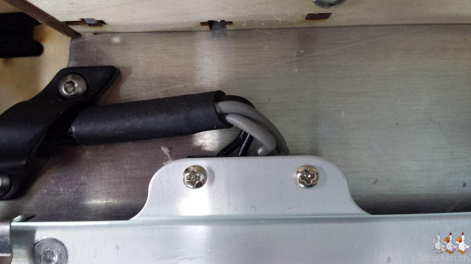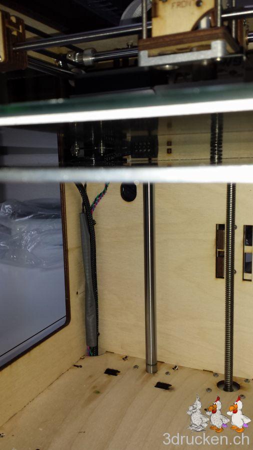 Die Zugentlastung ist ein Witz, da sie auf den Durchmesser des alten Kabels am Ultimaker 2 ausgerichtet ist, das neue Kabel am Ultimaker Original+ und Ultimaker 2 aber wesentlich dünner ist. Das Kabel vom Drucktisch haben wir nicht wie empfohlen durch den Kabelkanal gezogen, sondern direkt hinten links durch das Loch auf die Unterseite des Druckers geführt.