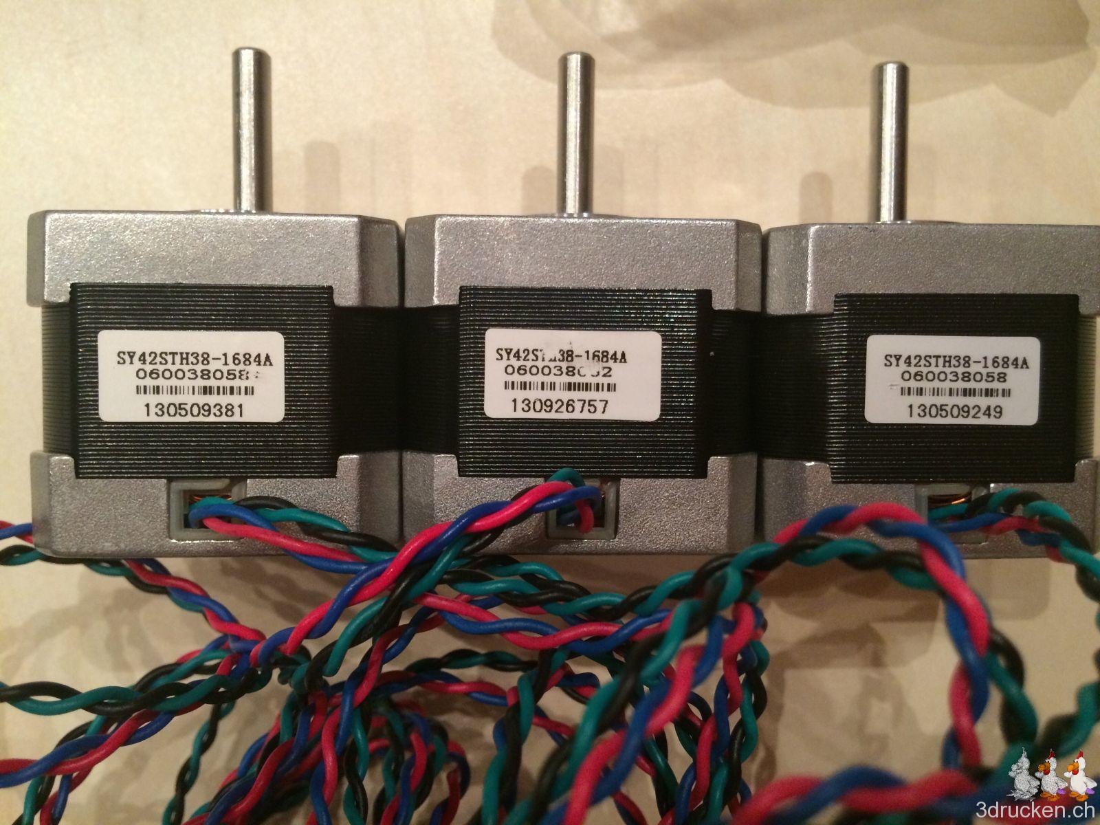 In Schritt 6.1.3, der Montage der Motoren, muss man aufpassen, dass man die 3 identisch scheinenden Motoren voneinander unterscheidet. Der Motor für den Vorschub hat einen auf einer Seite abgeflachten Schaft, die X- und Y-Motoren haben einen runden Schaft. Sie unterscheiden sich auch durch eine etwas andere Nummer auf dem Aufkleber.