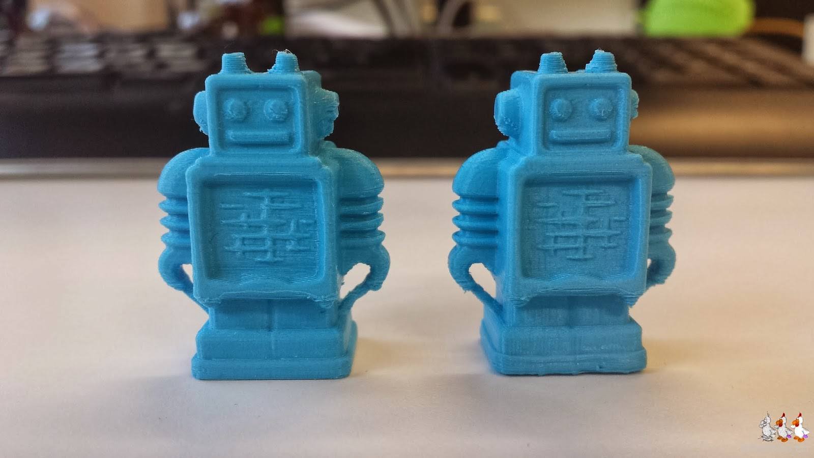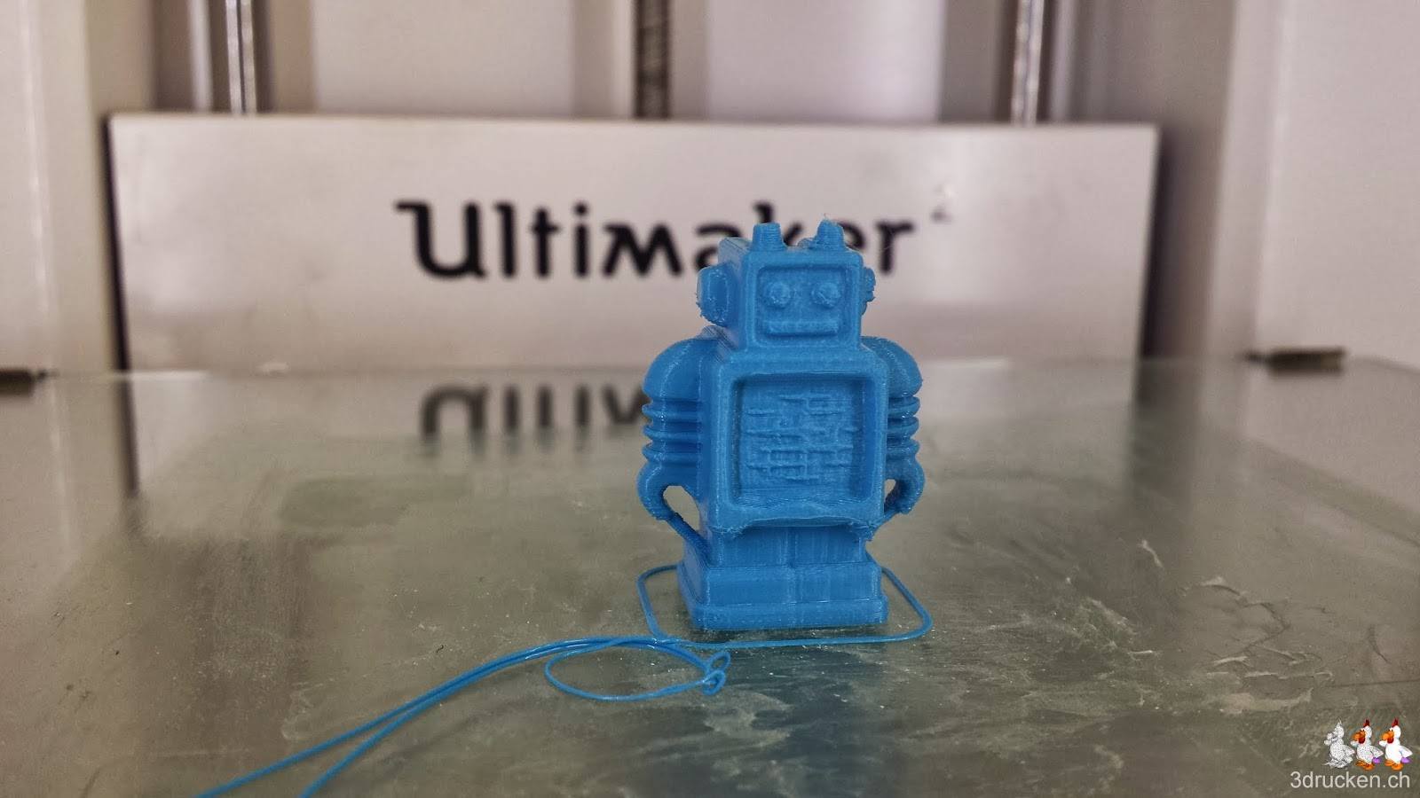 Wir starten sogleich einen nächsten Versuch, diesmal mit 210° C Drucktemperatur. Wegen der zu Beginn des Drucks noch tieferen Temperatur, konnte der Skirt nicht gedruckt werden, und auch die erste Schicht des Roboters wurde nicht optimal gedruckt. Wir gehen also davon aus, dass 215° C bei dem aktuellen Material besser ist, da sich an der Druckqualität sonst nicht sehr viel geändert hat.
