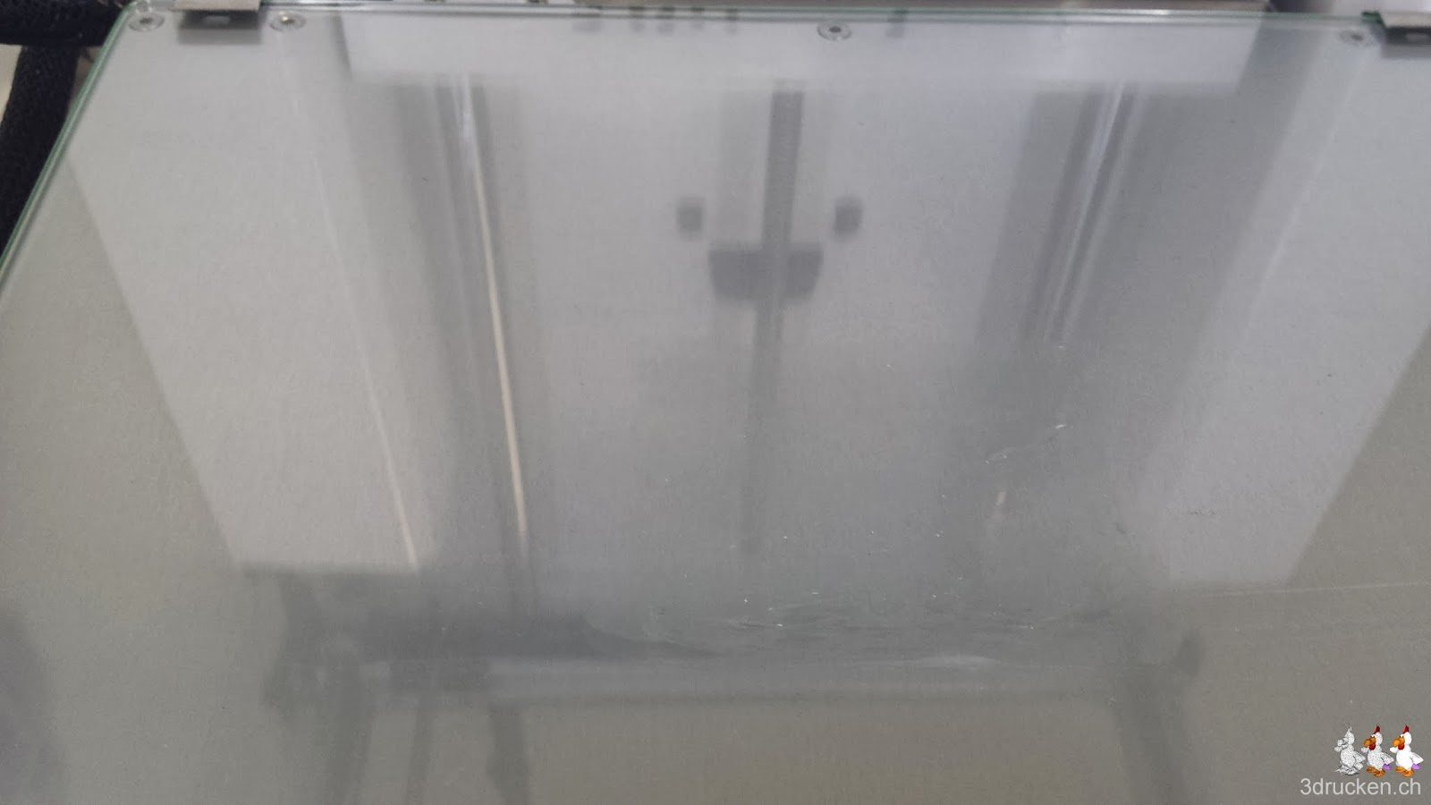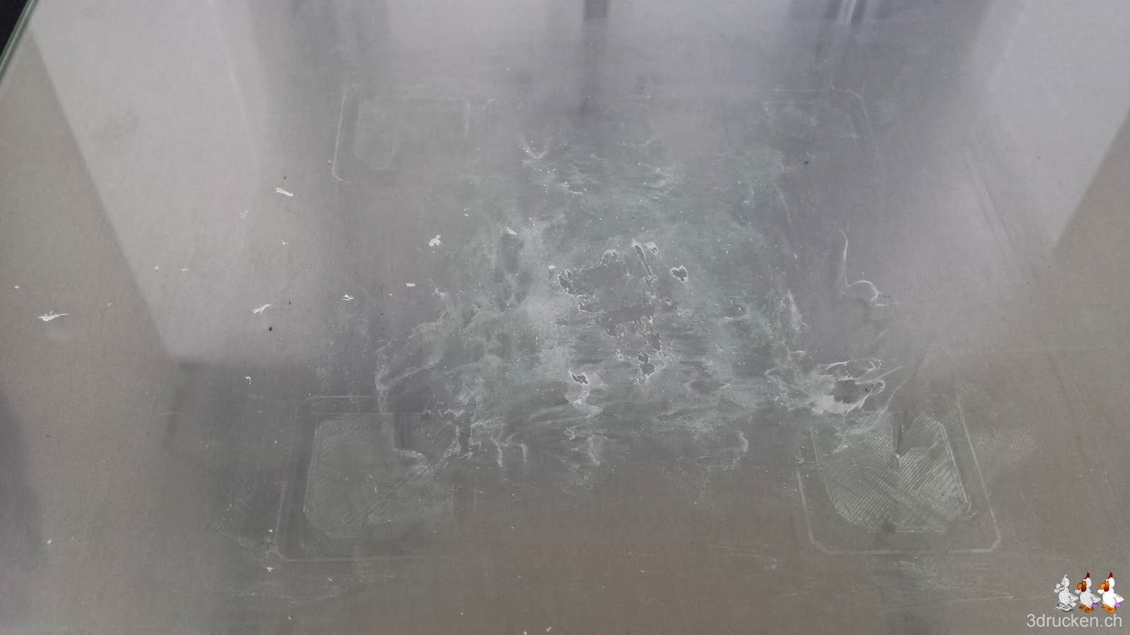 Also doch wieder 210° C für das Material, und den Drucktisch reinigen. In der Anleitung wird empfohlen, dies mit Wasser und einer Bürste zu machen. Die faule Lösung wäre die Glasplatte einfach umzudrehen und auf der Rückseite weiter zu drucken. Warmes Wasser mit Spülmittel und Büste klappt wunderbar. Danach die Platte schön trocknen und zum Schluss wieder einsetzen. Jetzt können wir eine neue feine Leimschicht