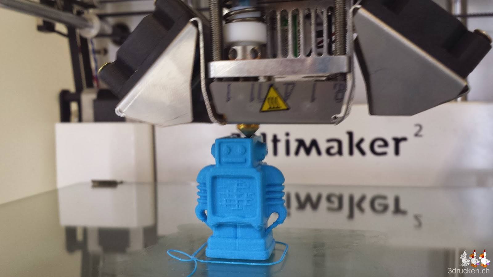 Nun klappt beim dritten Druckversuch auch das mit der Haftung auf dem Tisch wieder problemlos. Ungefähr 10 min vor Ende des Drucks beobachten wir, wie der Kopf des Roboters gedruckt wird, und stellen dabei fest, dass die Temperatur im System allgemein zu hoch liegt. Dies zeigt sich besonders auf der Seite des Roboters, die direkt unter dem Druckkopf liegt, und so durch die Anordnung der Lüfter nicht direkt mit kühlender Luft versorgt wird. Unter dem Druckkopf scheint sich die Wärme vom Tisch wie zu stauen. Also experimentieren wir und tunen die Einstellungen auf 205° C für das PLA, und 0° C für den Tisch.