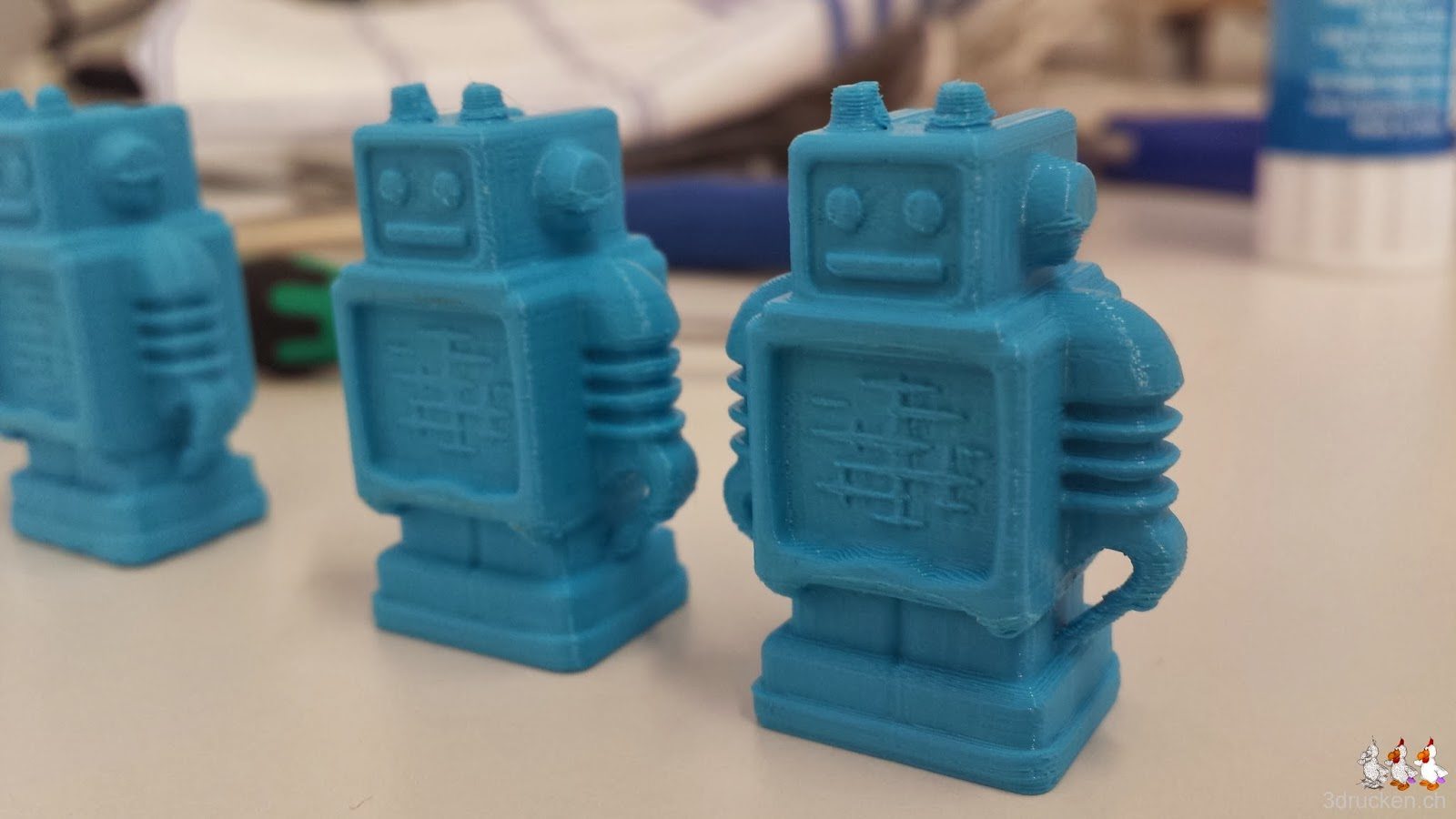 Womit man noch experimentieren könnte ist die Temperatur des Tischs, da uns diese Wärme besonders bei kleineren Objekten relativ hoch erscheint. Wir reduzieren diese auf 70° C, bemerken aber gleich beim Start des dritten Druckversuchs, dass die fehlende Haftung am Tisch beim Skirt im vorherigen Druck wohl auch den Leimrückständen geschuldet ist.