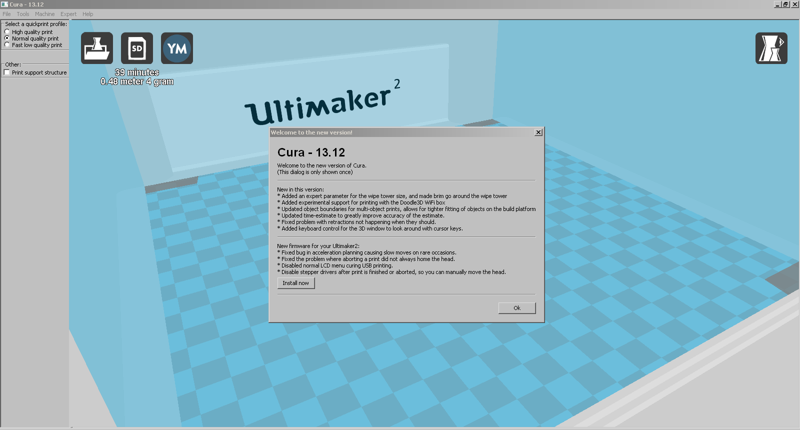 Cura 13.12 PC geladen und die Firmware via USB auf den Ultimaker 2 geflasht.