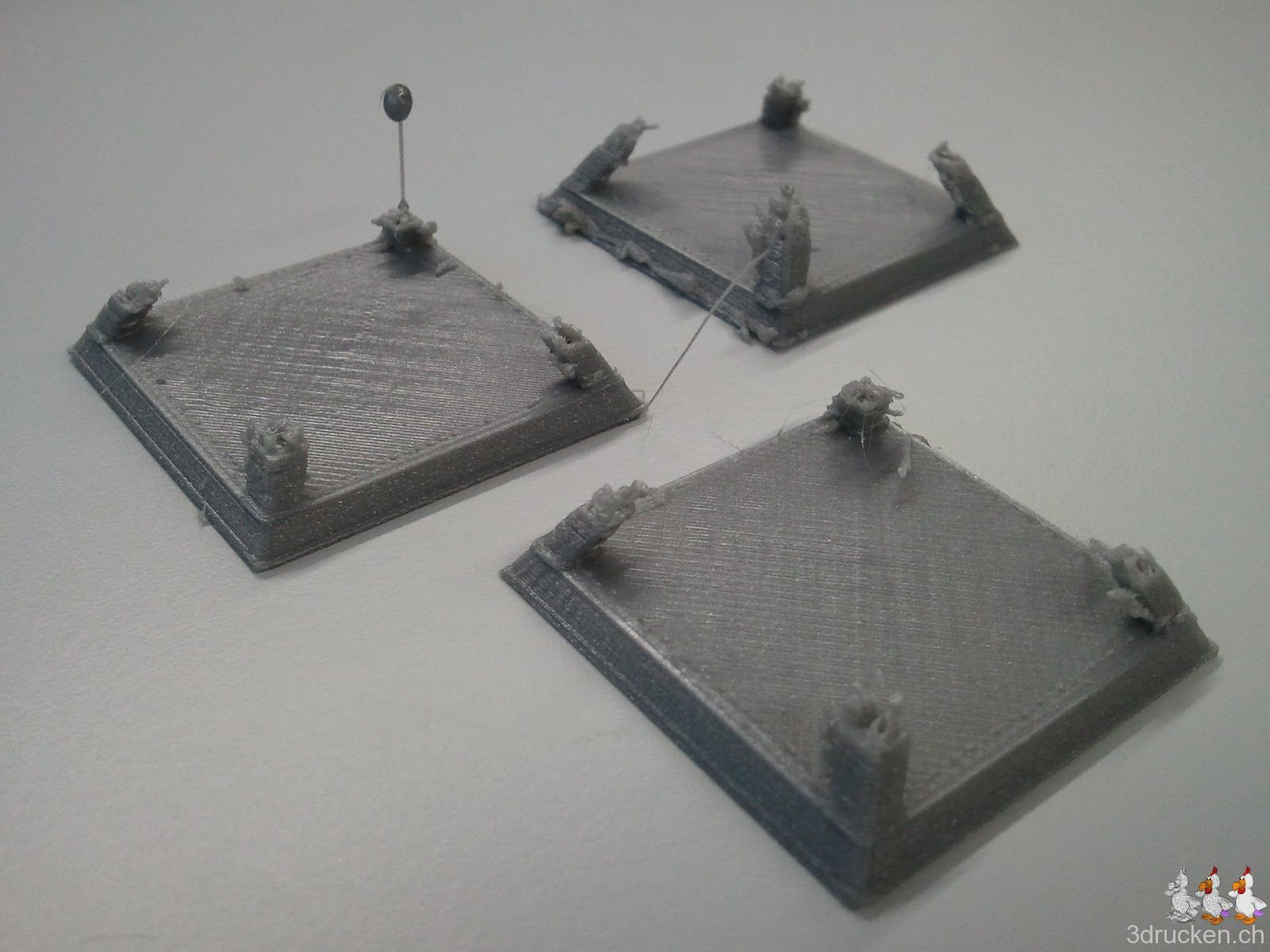 Wir drucken inzwischen die vierte Kalibrations-Pyramide auf unserem Ultimaker. Nun mit Amax e: 10000 und A-retract: 10000. Zuvor waren 3 Versuche mit 0.1 mm Schichten gescheitert, da soviel Retraction gemacht wurde, dass der Extruder das Filament gefressen hat, und gar kein Vorschub mehr stattfand.