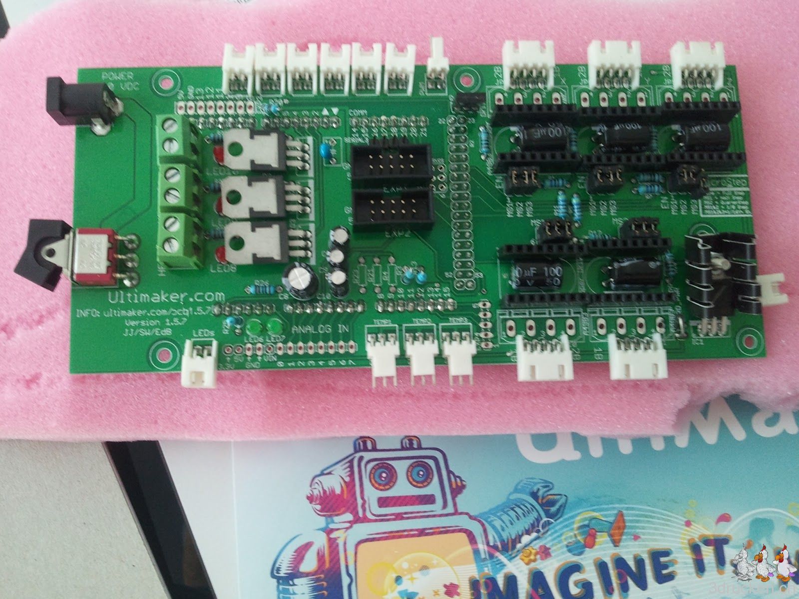 Fabian Zurbuchen war gerade Mittagessen, da hab ich mir den Fortschritt seines Ultimaker-Zusammenbaus angeschaut. Dabei ist mir etwas viel Luft bei der Elektronik aufgefallen. Nach genauerem Hinsehen und durch Hinweise auf G+ wurde klar, dass nicht nur das Arduino Mega 2560 Board fehlt, sondern auch die Schrittmotor-Treiber. Nun warten wir auf Nachricht und danach Ersatz-Elektronik aus Holland.