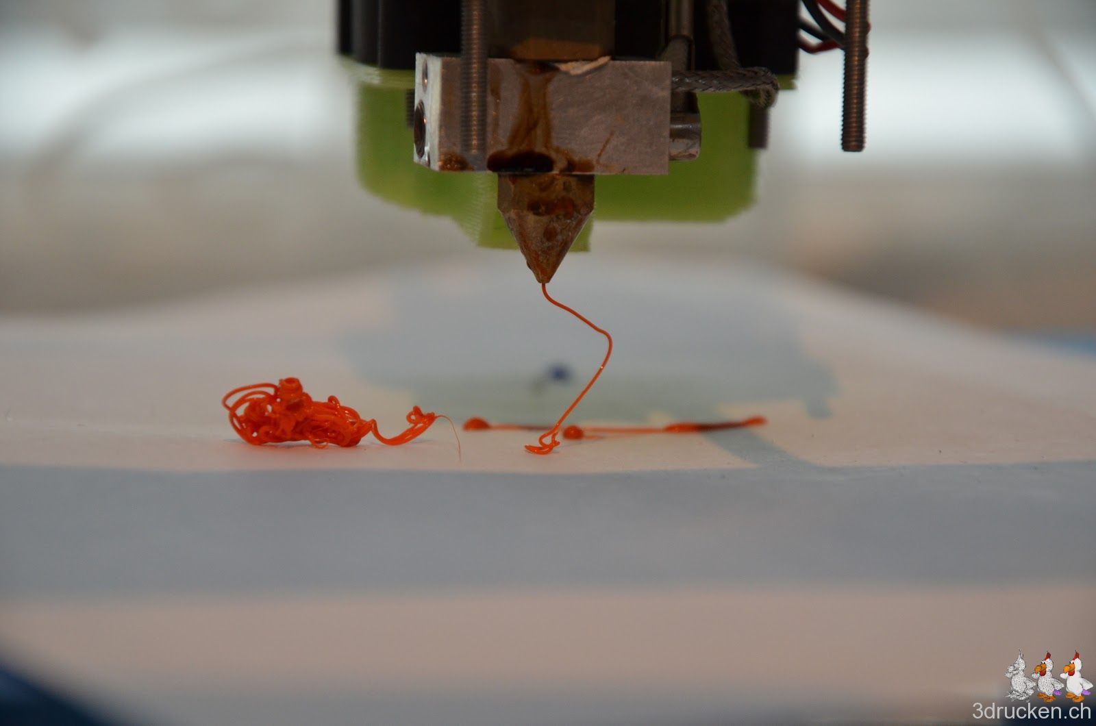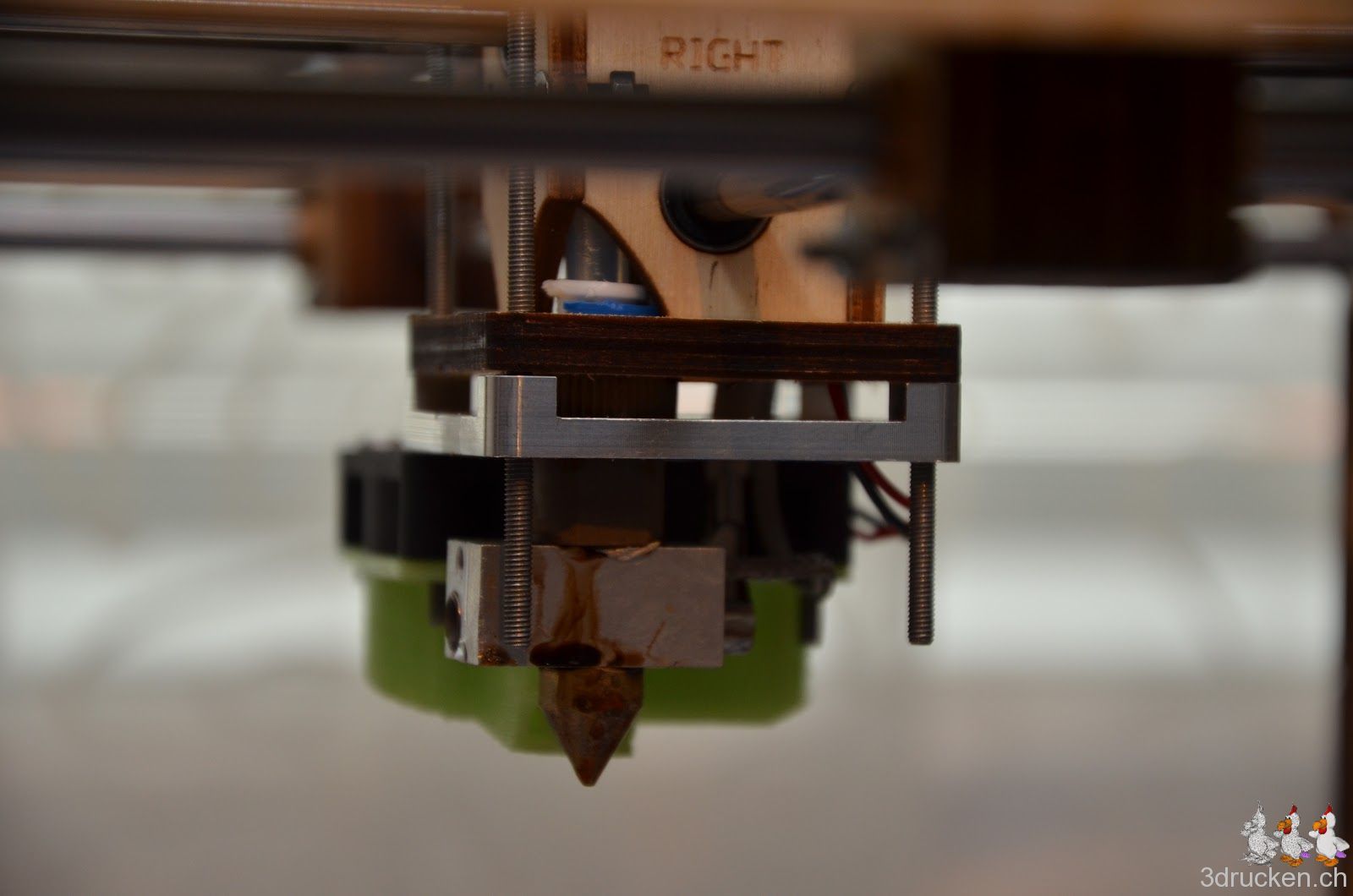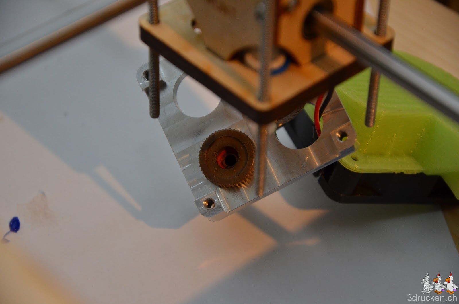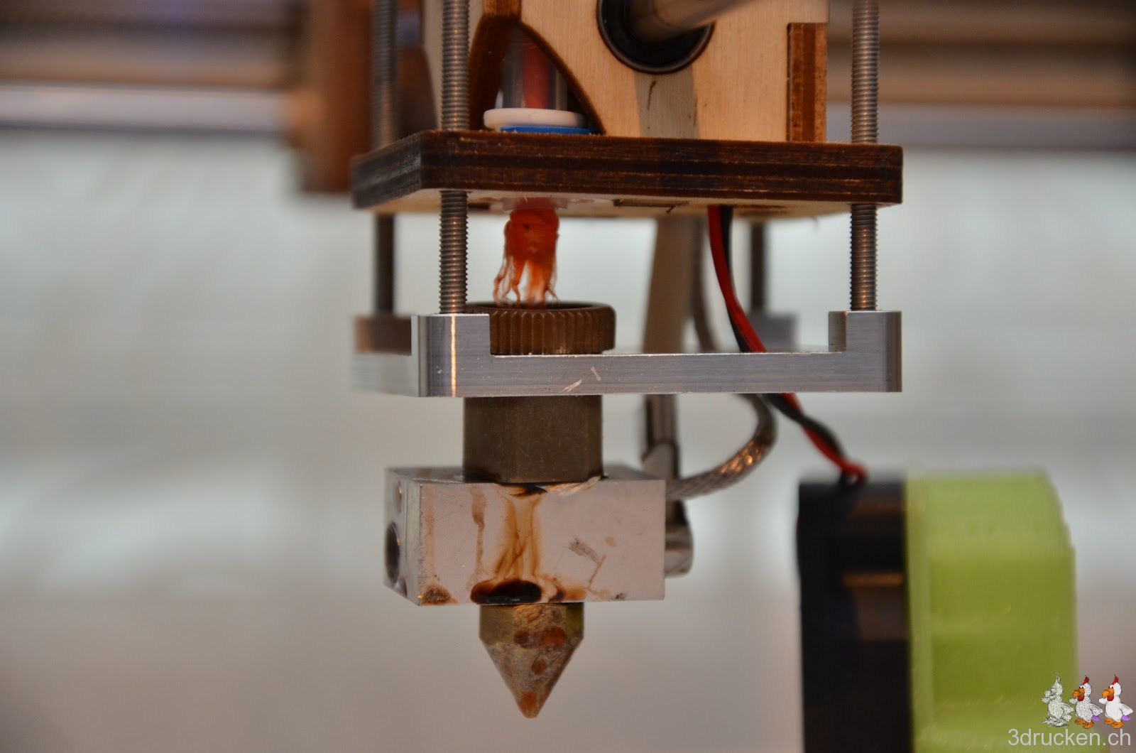 So, ein paar Stunden investiert und die Hälfte des Vorschubs und Druckkopfs demontiert. Hier die Ursache für unseren häufigen Filament-Staus. Wir hatten uns den Warnhinweis unter dem Abschnitt Druckkopf – Zusammenbau des Druckkopfgehäuses (Seite 45ff) in der Bauanleitung nicht genügend zu Herzen genommen, und die geforderten 8mm überstehendes Plastikröhrchen nicht penibel genau eingehalten. Nun hatte sich dadurch in der Zwischenzeit oberhalb des heissen Teils in der Isolation Filament breit gemacht, und so jegliches Vor oder Zurück verunmöglicht.