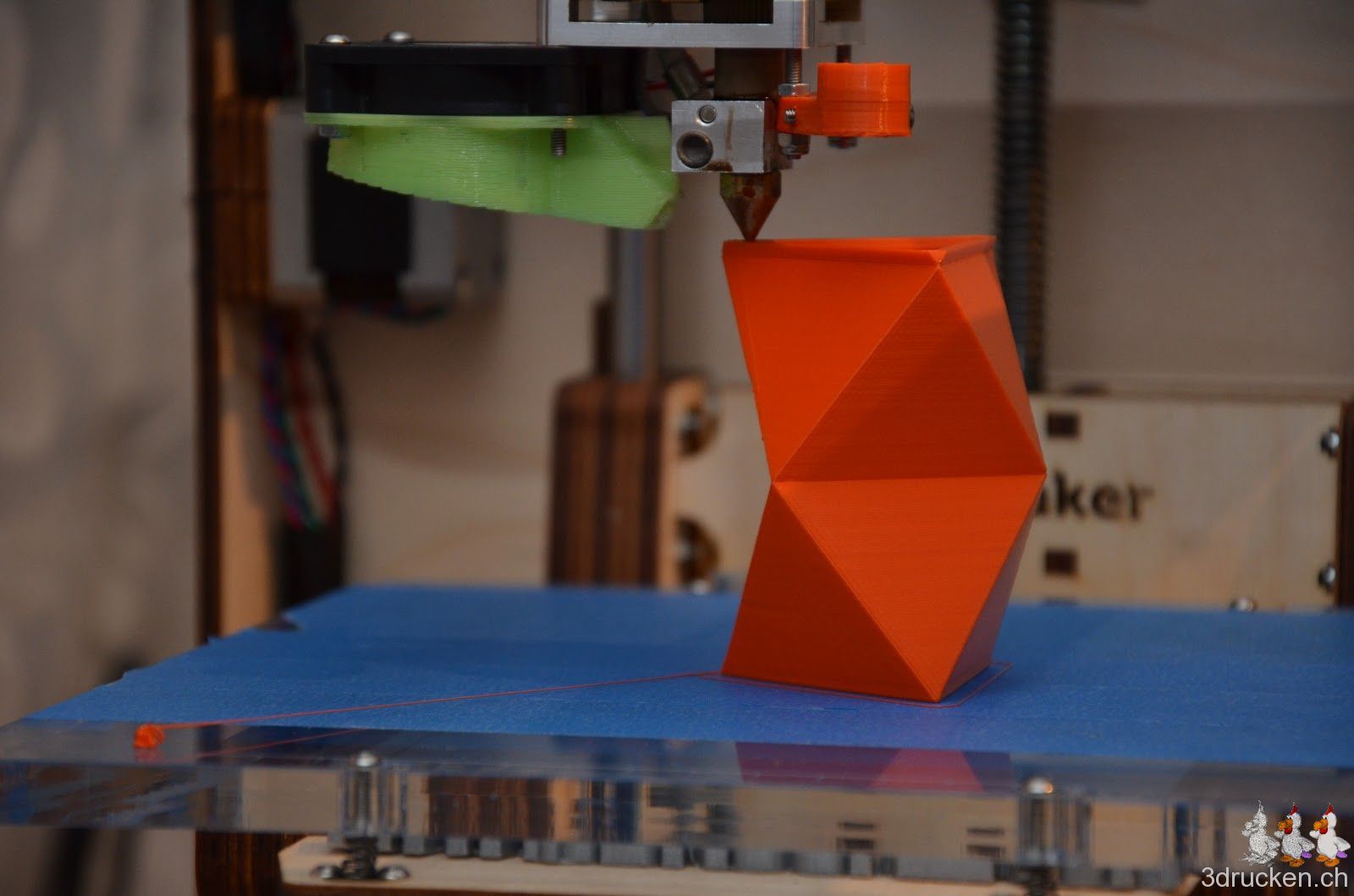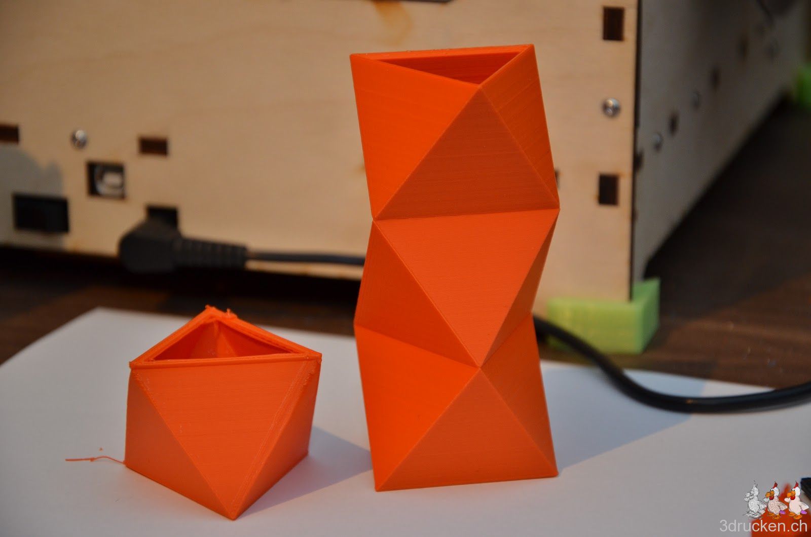 Bislang funktioniert es nun mit dem nachjustierten Plastikröhrchen, das erste Druckresultat kann sich auf jeden Fall sehen lassen! Das Modell der Vase gibts bei Thingiverse.