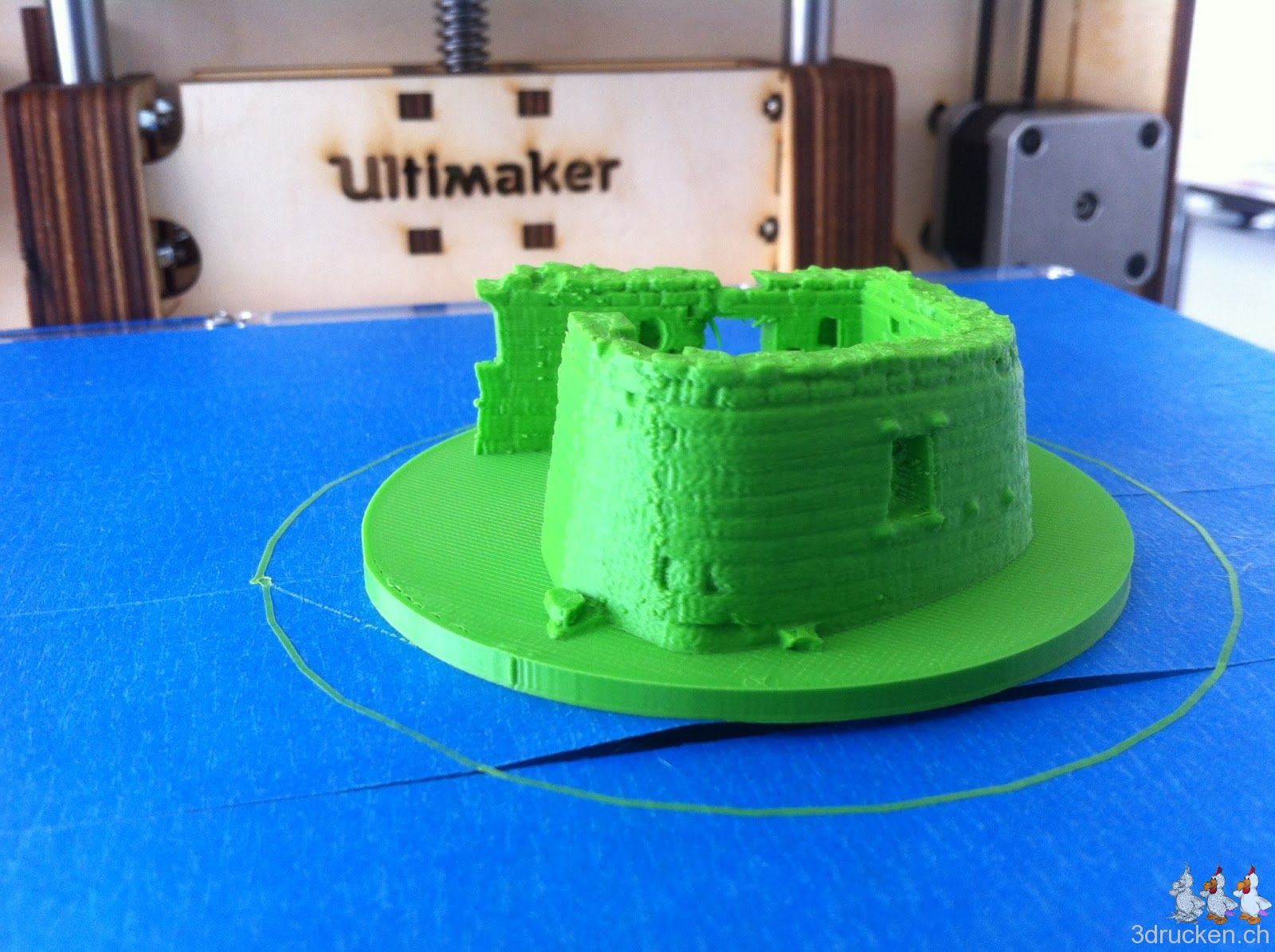 Heute druckten wir noch einmal die Ruine. Jetzt wählten wir als Layer-Dicke statt 0.2 mm, 0.1 mm Schichten. Das Ziel war herauszufinden, wie viel mehr Details zum Vorschein kommen. Die Oberflächen kamen tatsächlich feiner und besser heraus. Allerdings arbeitete der Ultimaker auch lange (4 Stunden und 27 Minuten).