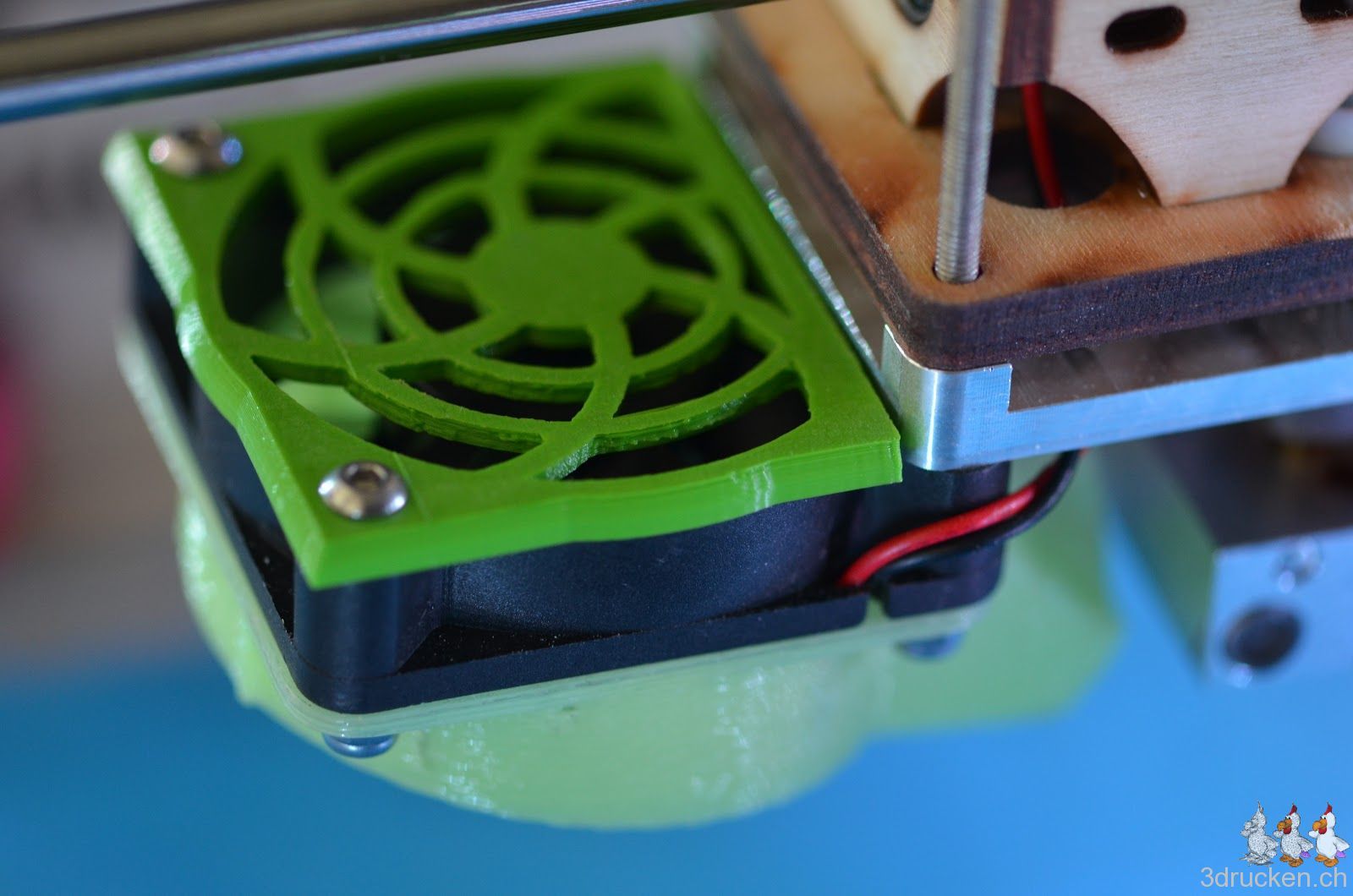 Verkleidung für den Druckkopf-Lüfter von Thingiverse runtergeladen, mit Cura in 0.1 mm Schichten geslicet und danach bei 230° C gedruckt. Längere Schrauben hervorgemacht und fix befestigt.
