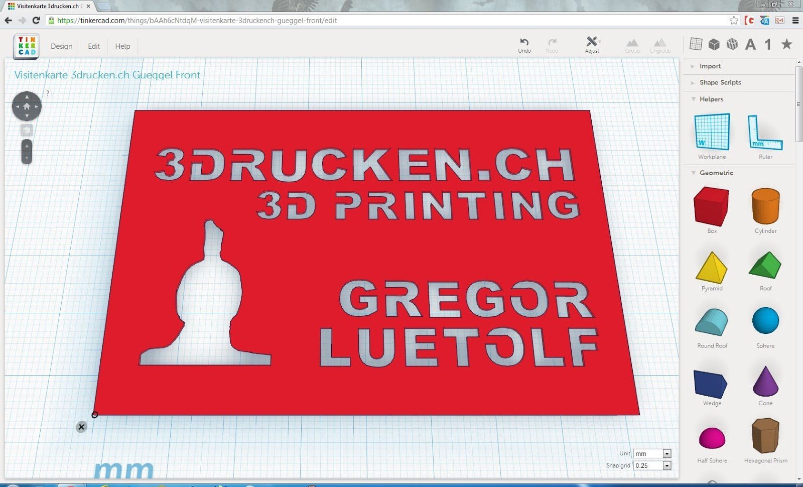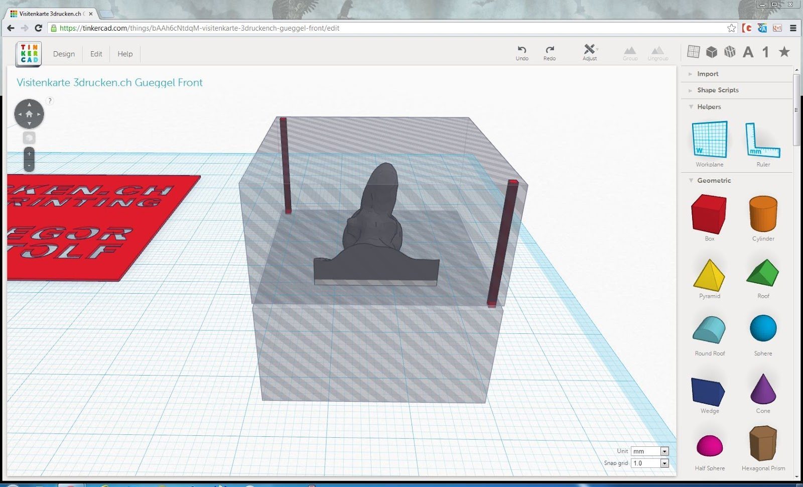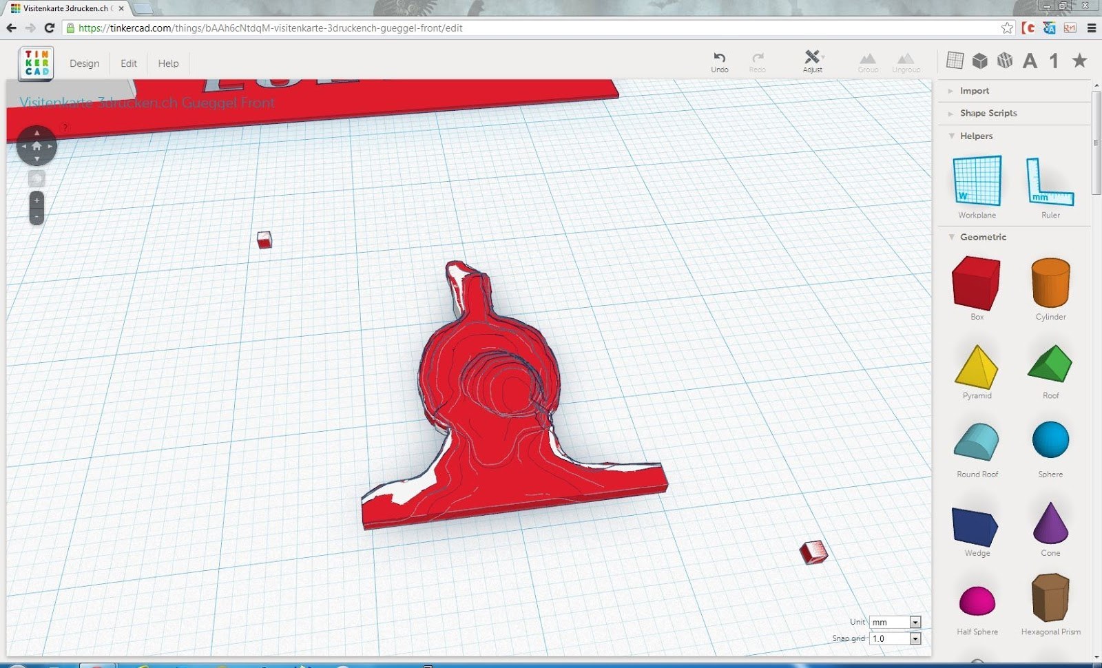 Wir wollten den Kopf des Güggels in der 2D-Frontansicht in Tinkercad aus der Visitenkarte ausschneiden. Beim Seitenprofil ging das ziemlich gut, da der Kopf in der Mitte die grösste Ausdehnung in X/Y besitzt. Bei der Frontansicht ist dies jedoch bisschen anders, und deshalb war es nicht möglich, einfach eine Schnittebene als Lochvorlage zu verwenden.