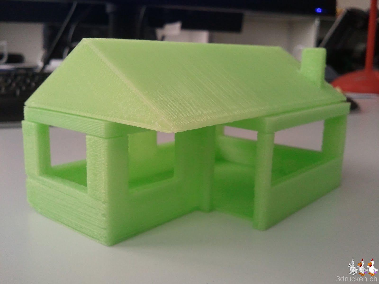 Print 3D -> Als STL heruntergeladen -> mit netfabb Studio in 3 Teile geschnitten -> untersten Teil mit KISSlicer geslicet und gedruckt -> Mittelteil in Axon 2 um 180° gedreht, danach mit KISSlicer gedruckt -> Dach um 90° gedreht, auf die Kante beim Kamin, mit KISSlicer inkl. Support gedruckt -> Support beim Kamin entfernt -> die beiden oberen Teile mit Sekundenkleber zusammengeleimt.