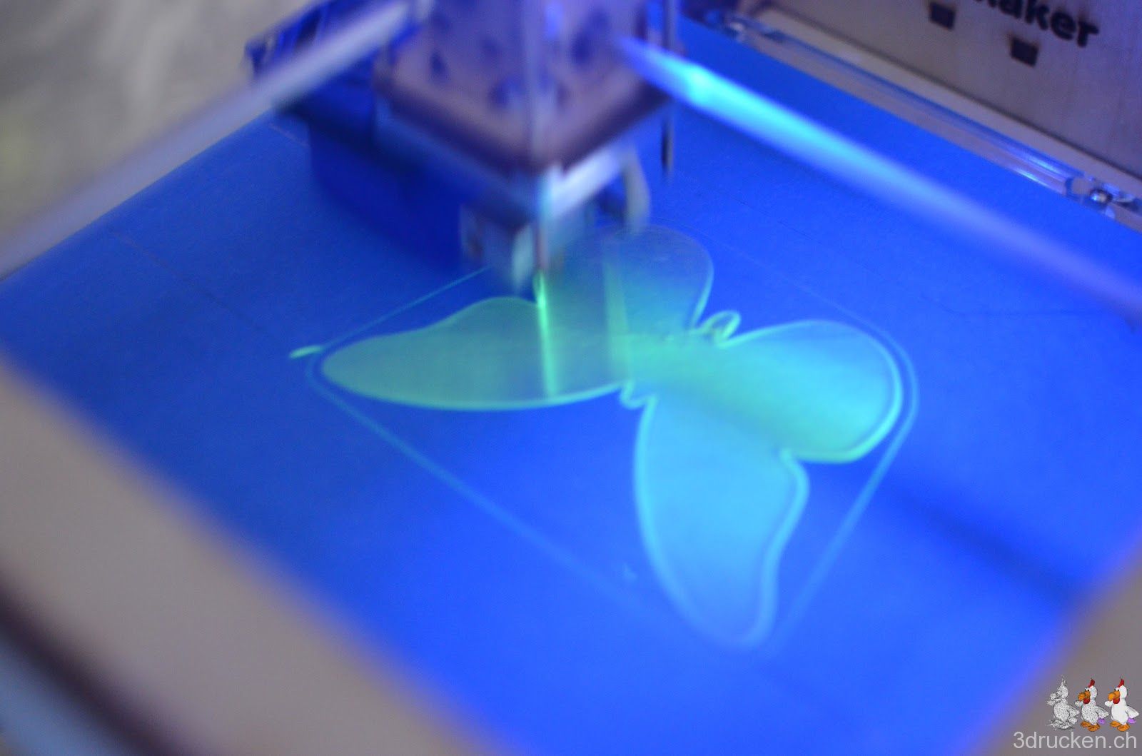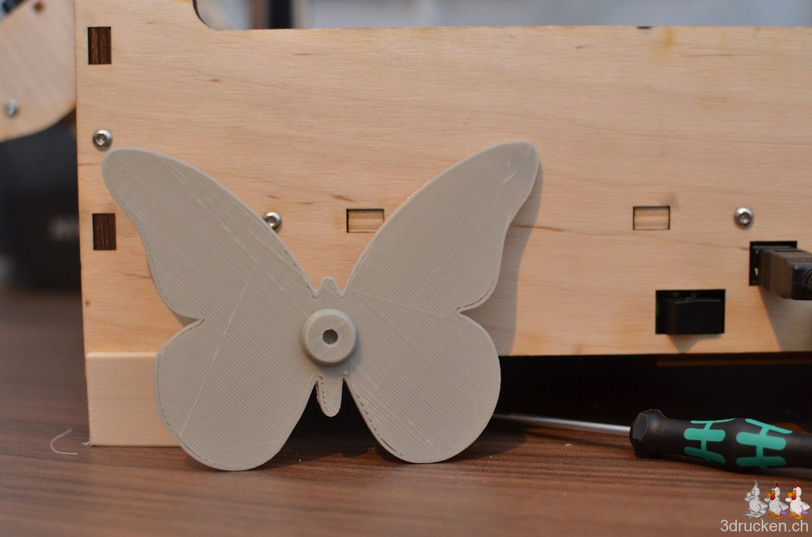 So einfach wird aus einem Schmetterling ein Nachtfalter. Man nehme nachtleuchtendes PLA grün und drucke damit den bereits bekannten Schmetterling. Et voilà, man erhält einen Nachtfalter. Nicht vergessen, die Drucktemperatur auf 190-200° C reduzieren, und den Durchmesser auf 3.05 mm erhöhen.