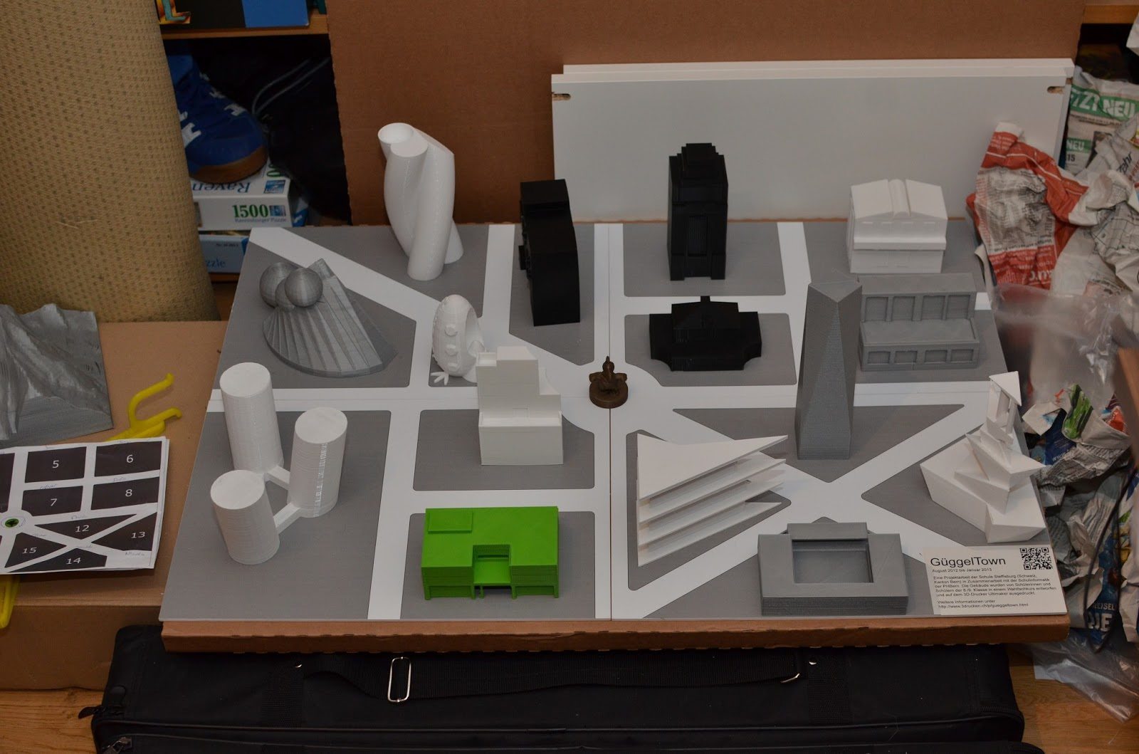 Wir sind fleissig bei den Vorbereitungen für unseren Workshop „3D-Drucken in der Schule“ an der ICT-V Tagung vom Samstag 25.5.2013 an der PHBern. Gestern haben wir den genauen Ablauf zusammen besprochen, und die schönsten Prints zum Aufstellen sorgfältig eingepackt. Heute habe ich dann die Präsentation zusammengestellt und weiteres Demo-Material gedruckt, sowie GüggelTown komplettiert. Wir sind gespannt, ob einige der Teilnehmer sich den Einsatz eines 3D-Druckers in ihrer Schule vorstellen könnten. Wir haben Florian Horsch und Ramun Berger in unsere Präsentation mit eingebaut.