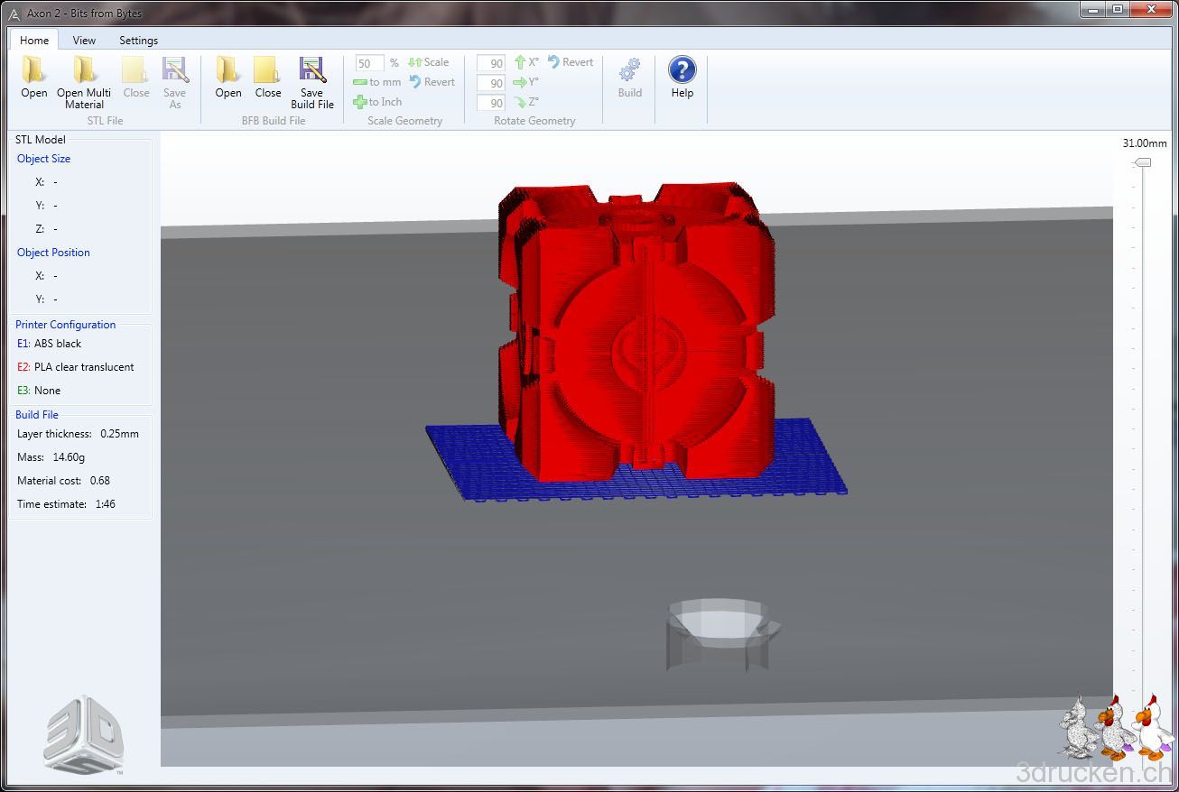 Aus SketchUp mit dem Plugin nach STL exportiert, danach in Axon 2 skaliert und geslicet, als BFB G-Code gespeichert und auf USB-Stick kopiert.