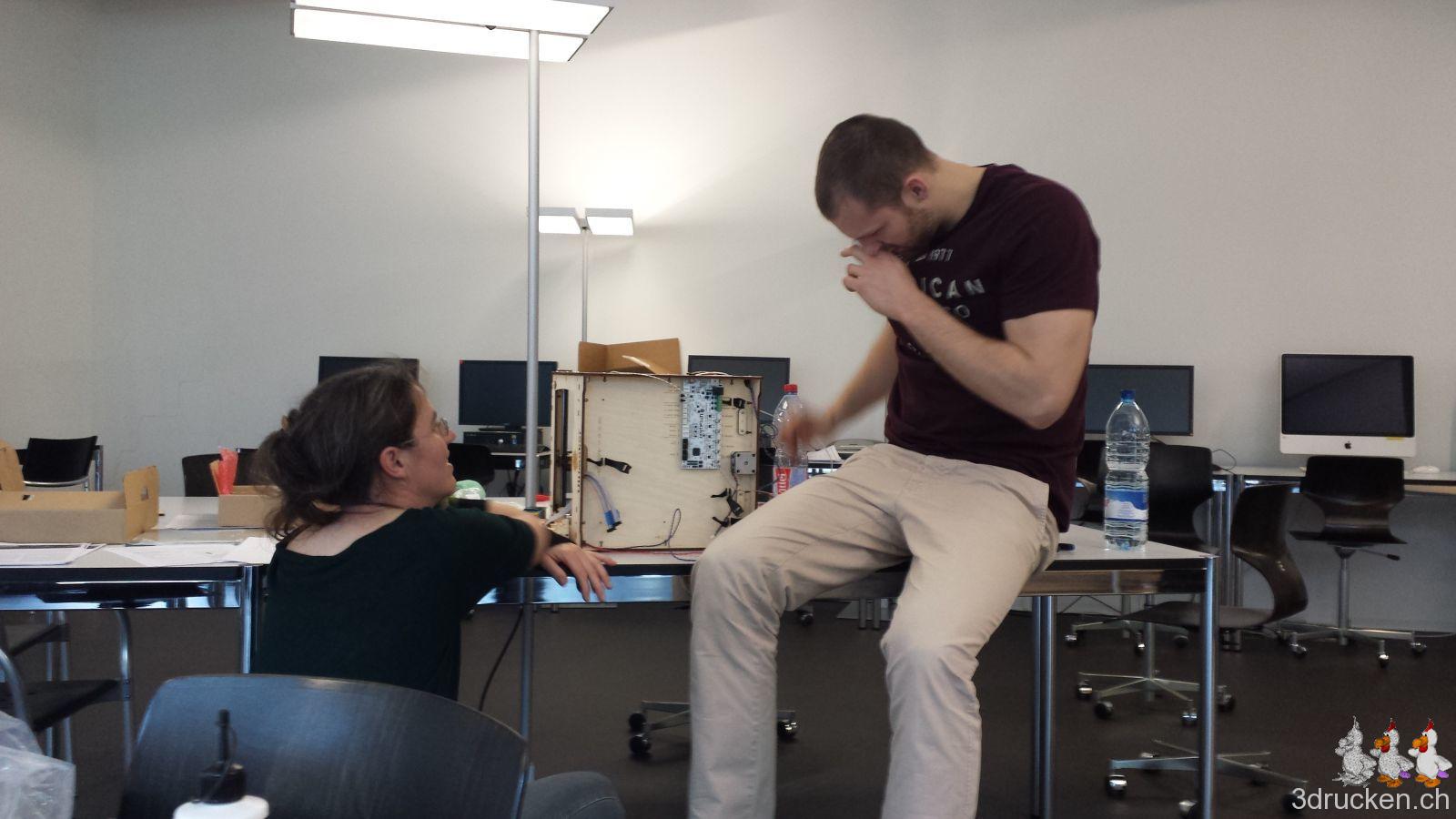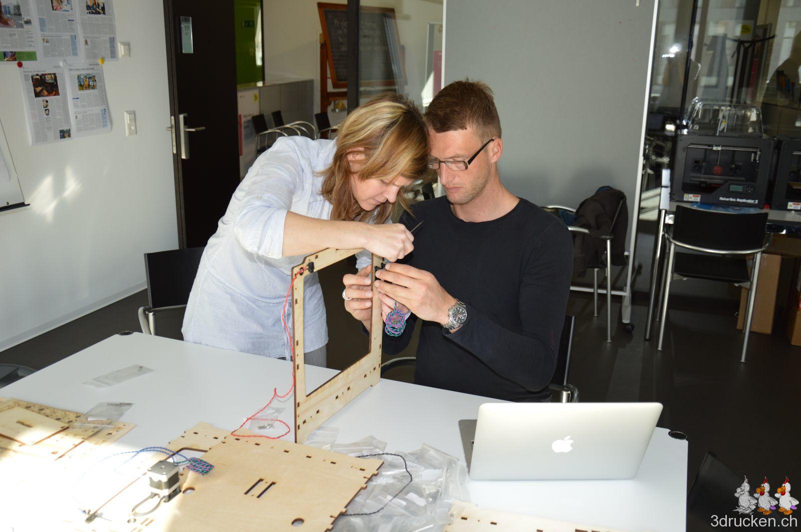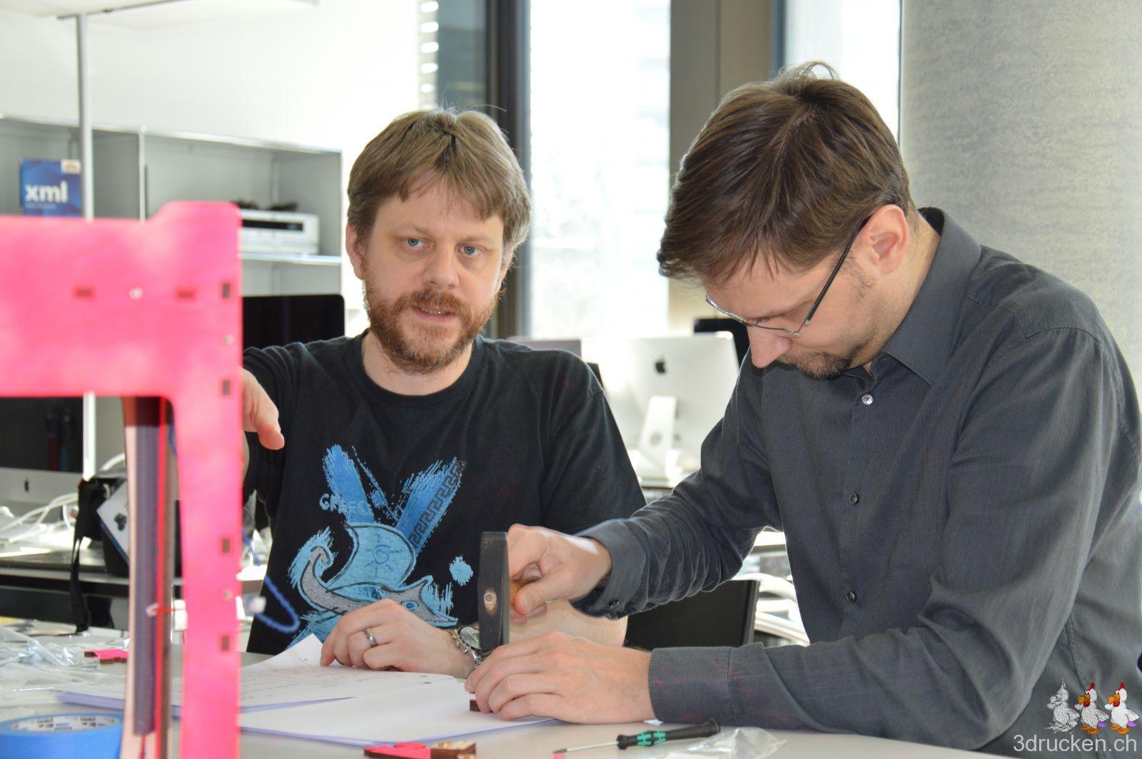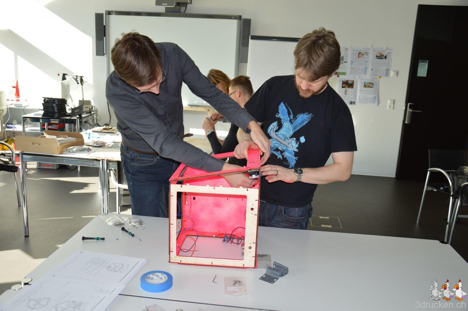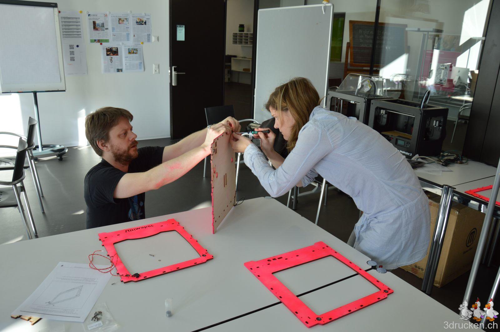 Wir haben also an diesem ersten Tag zu fünft begonnen, in Zweiergruppen die Drucker zu montieren. Judith hat zudem noch einige der Fotos gemacht, danke! Einige Teile des einen Druckerkits wurden zuvor mit einer Spraydose in imedias-Pink eingefärbt.